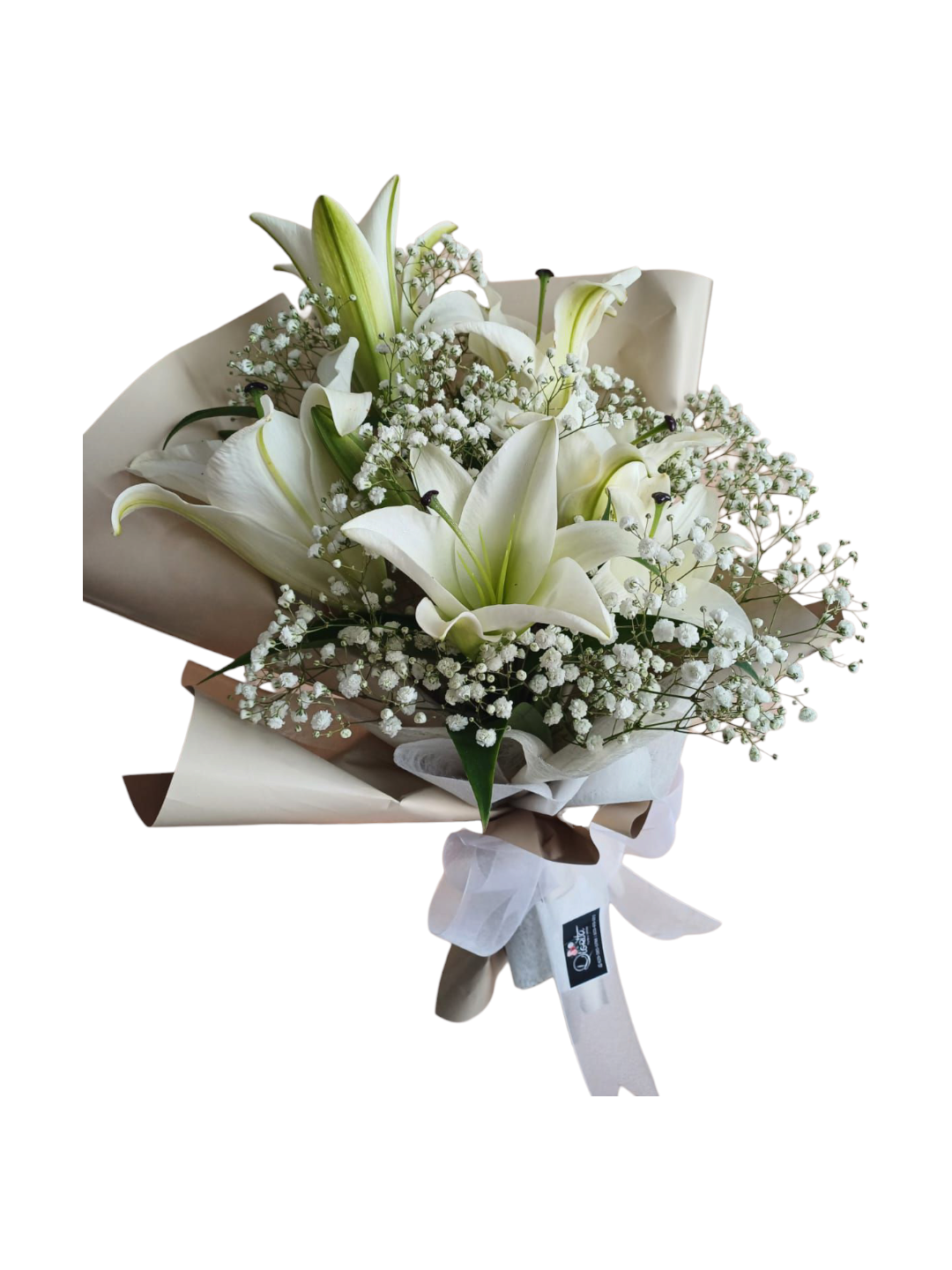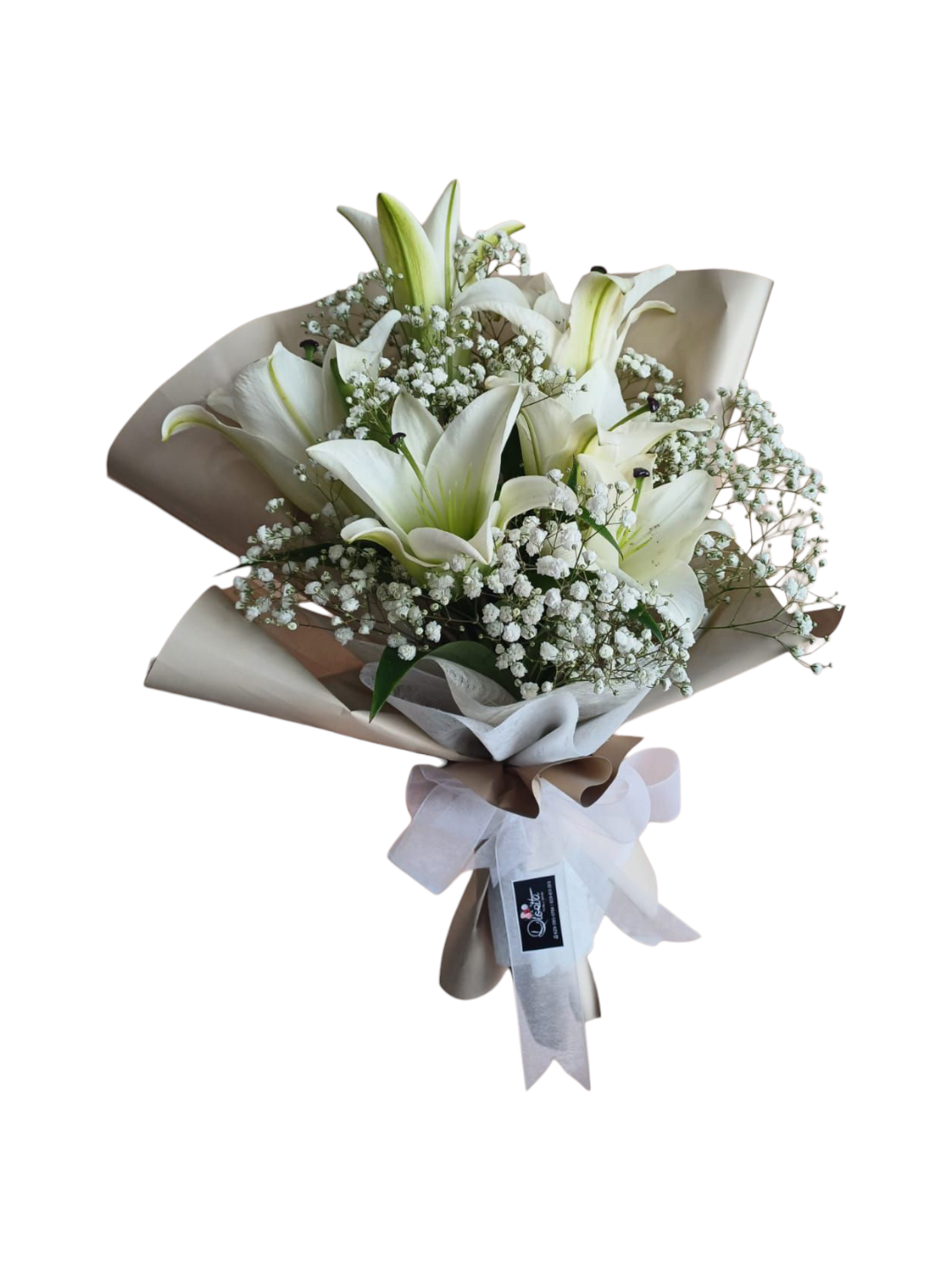 Un diseño sutil y refinado que transmite paz y pureza. Las espigas de lirios se alzan con elegancia entre nubes de baby breath, creando un detalle lleno de armonía y sofisticación.