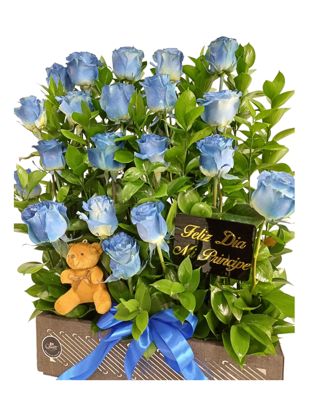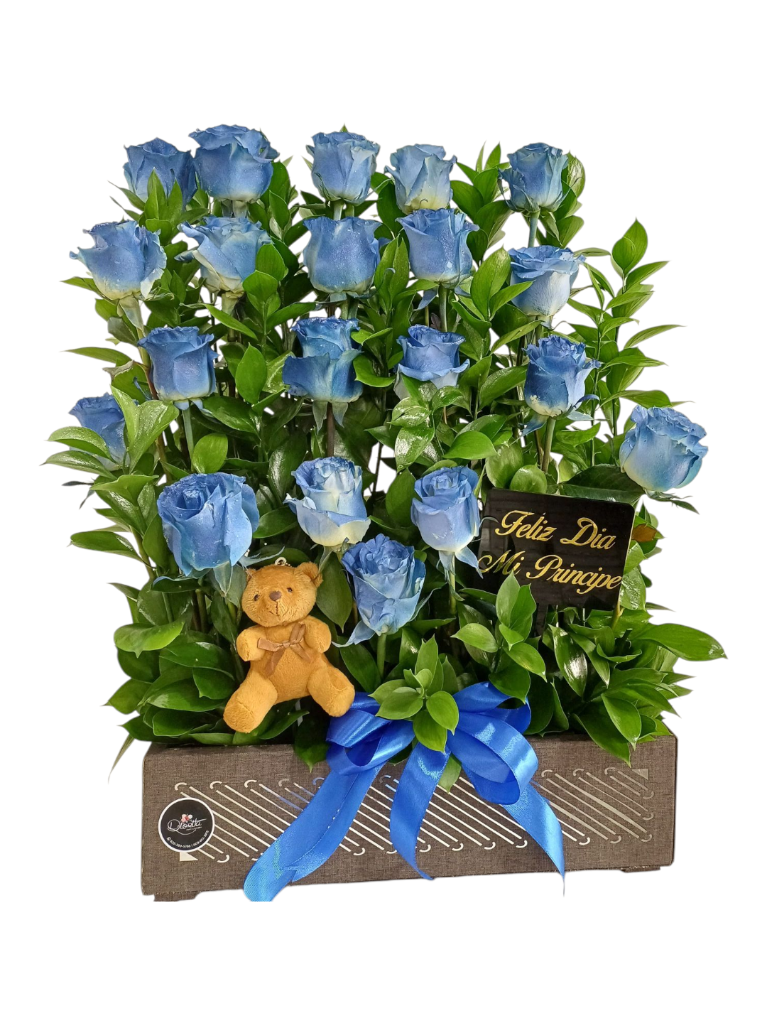 Arreglo con elegantes rosas, ruscus, un tierno osito de peluche, placa personalizada con el mensaje que desees y un lazo decorativo que lo envuelve todo con encanto. Perfecto para sorprender con amor y dulzura en cualquier ocasión especial.