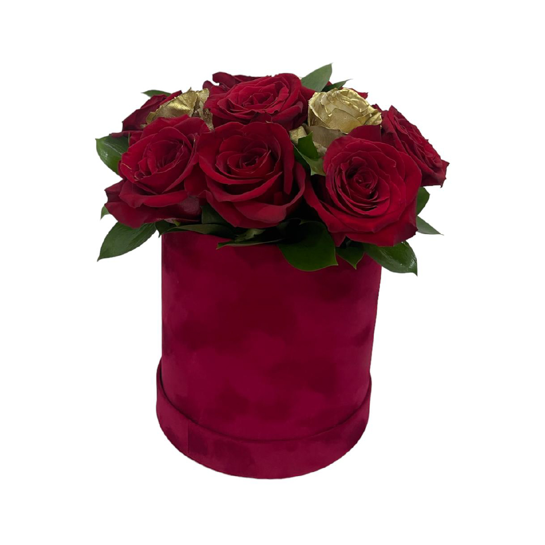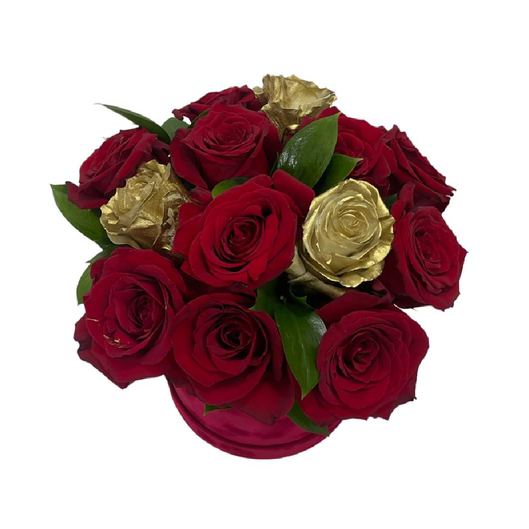 Caja circular compuesta por 15 rosas combinadas al gusto.