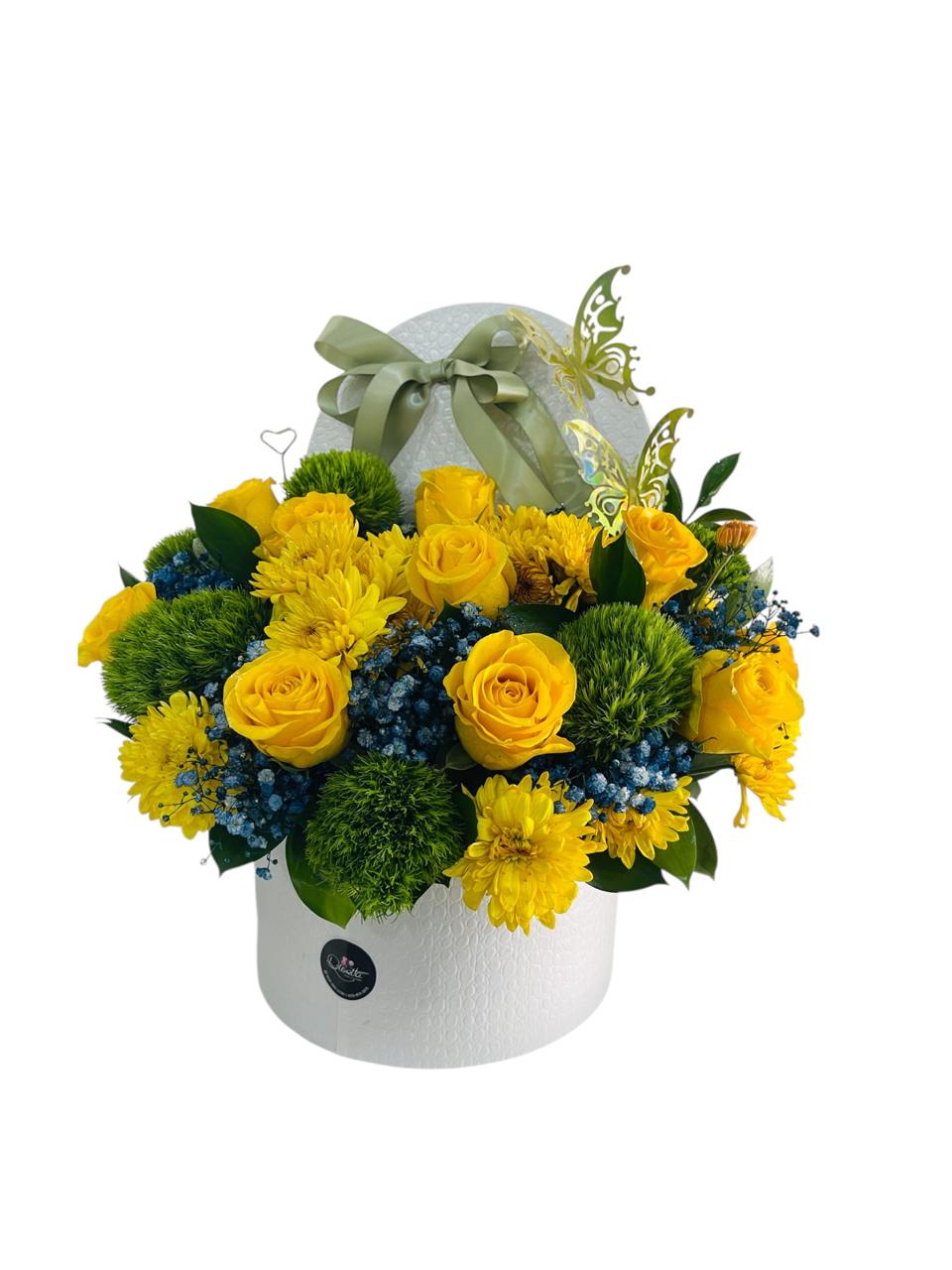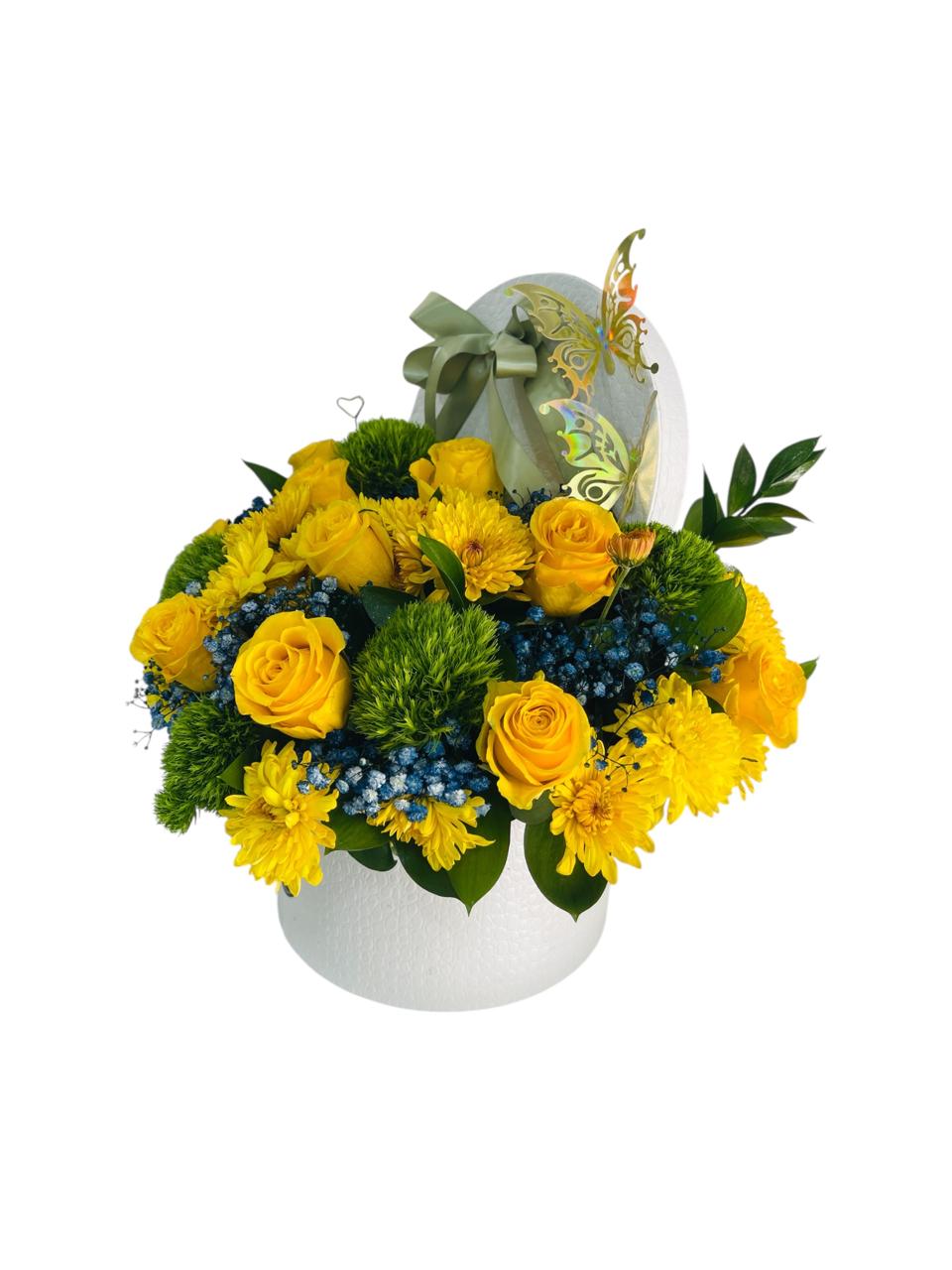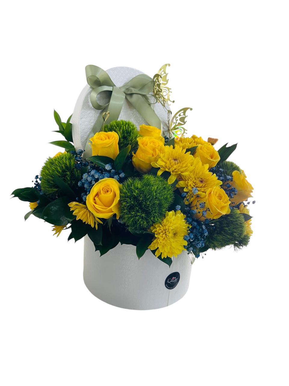 Este arreglo ilumina cualquier ambiente: rosas amarillas radiantes, pompones alegres y el toque fresco del green ball. Regala un rayo de sol, perfecto para llenar el día de alegría, color y energía.