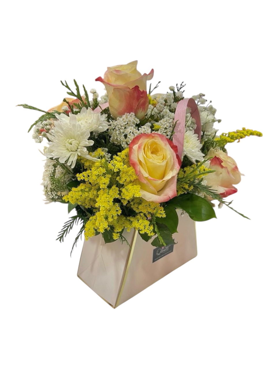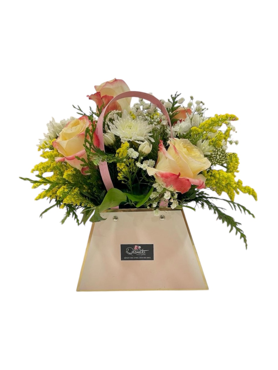Un hermoso bolso floral con rosas en tonos suaves, flores blancas y detalles amarillos que iluminan cualquier momento. Perfecto para regalar dulzura y alegría con mucho estilo.
