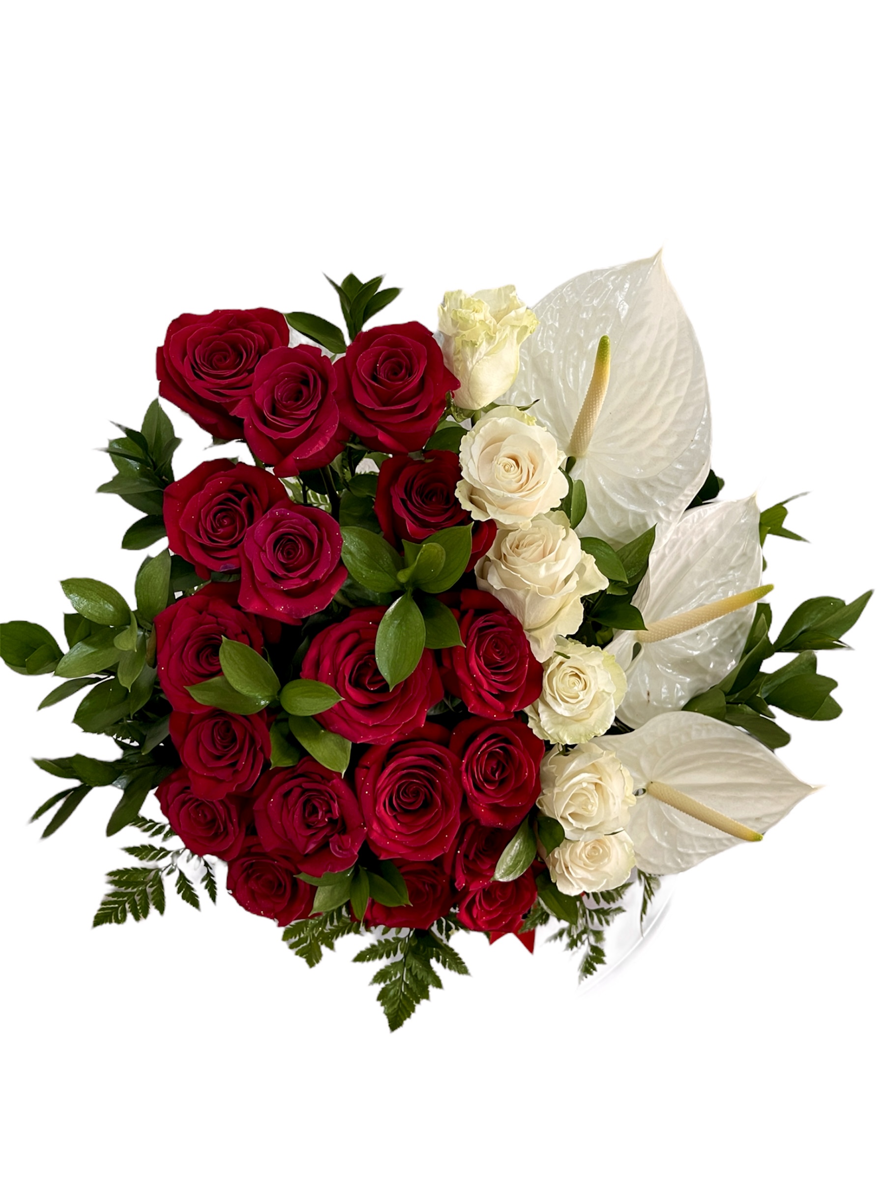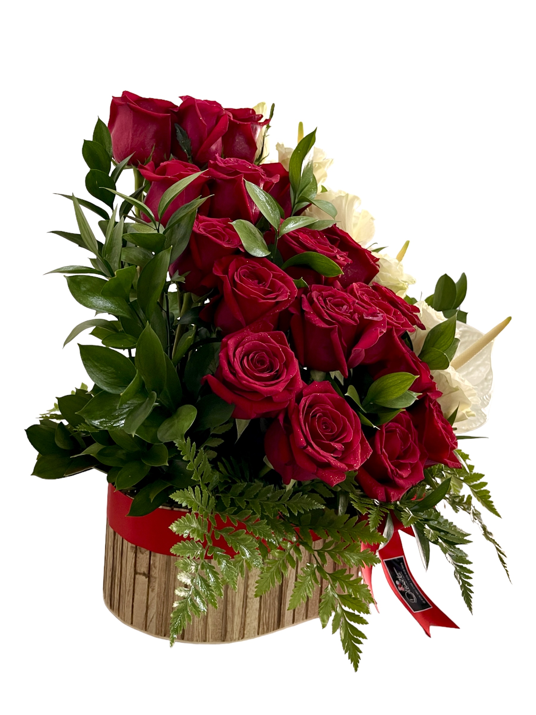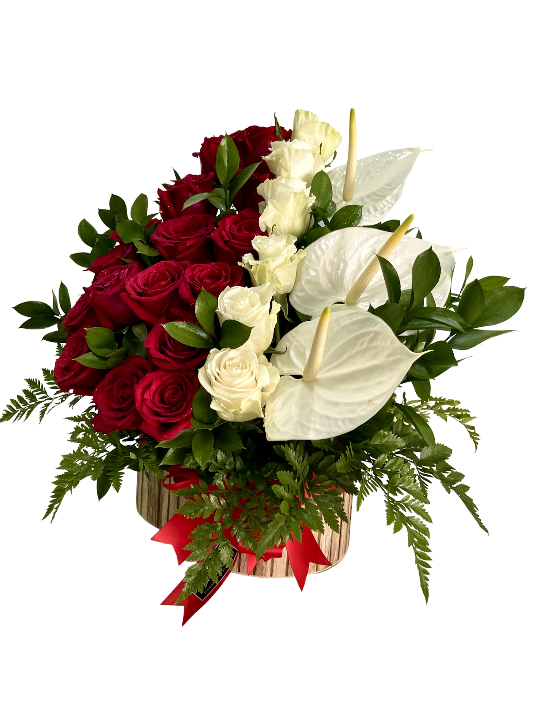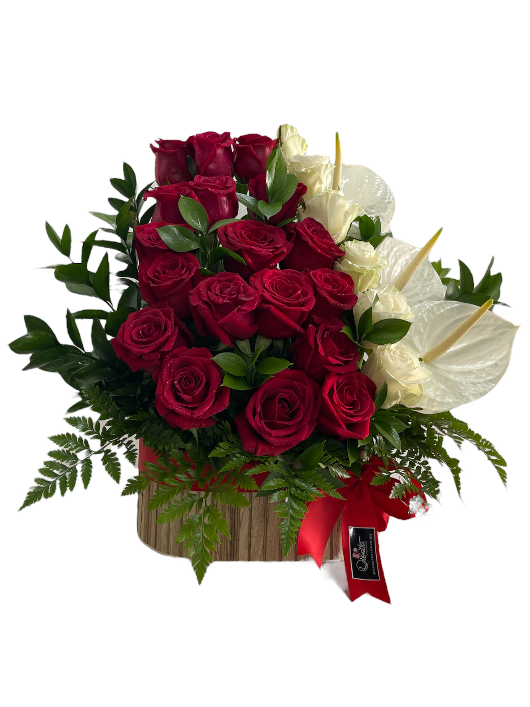 Arreglo en hermosa combinación de rosas rojas y blancas con un detalle de anthurium y ruscus, en base macetero ovalado en madera rustica . Lazo decorativo en tela que puede variar a gusto del cliente.