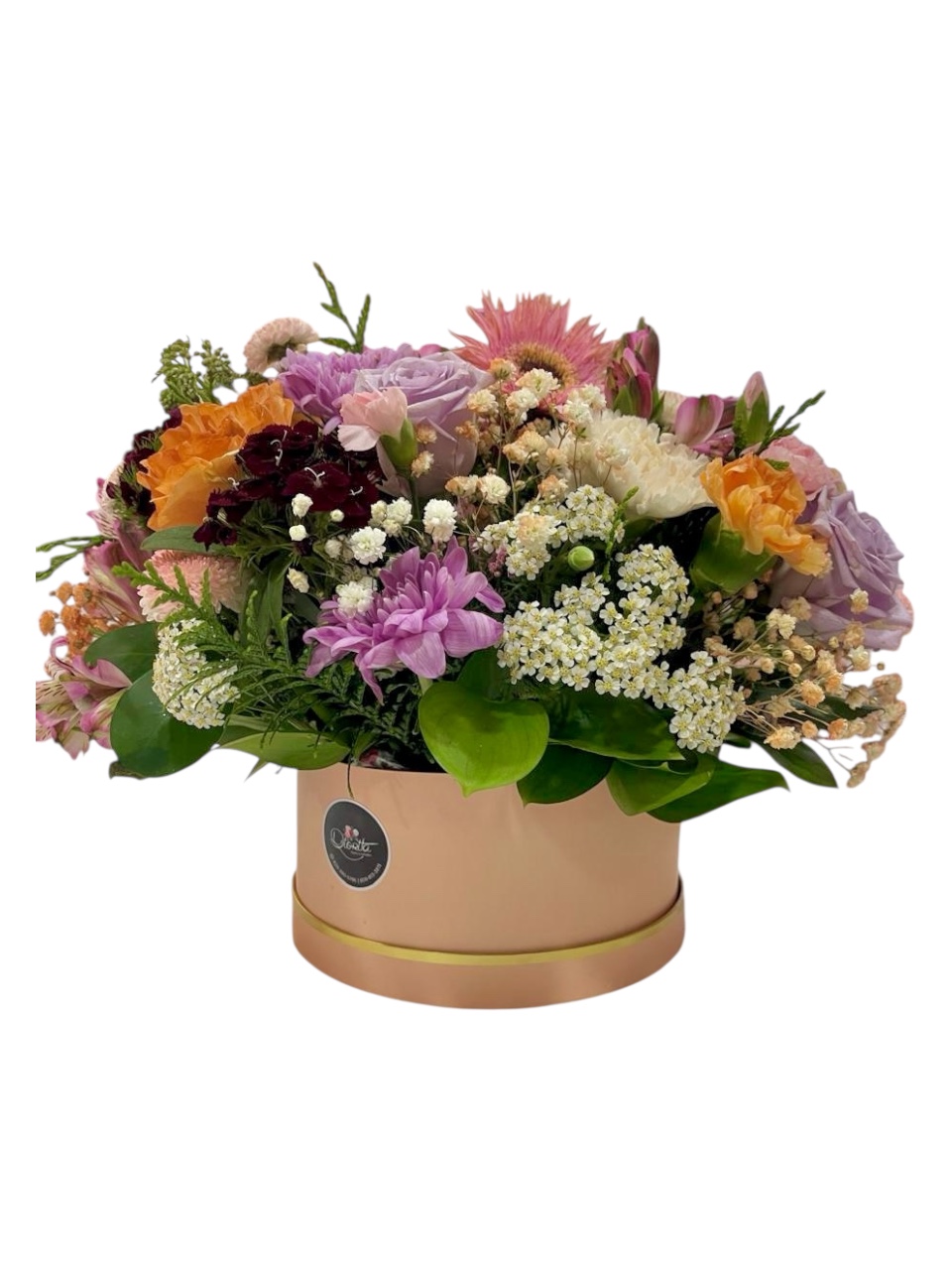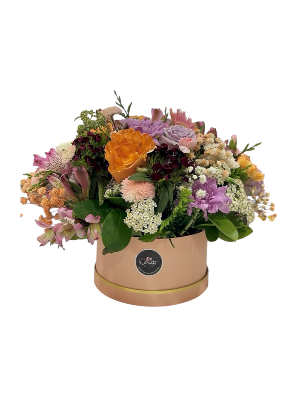 Una delicada combinación de flores frescas en suaves tonos pastel, presentada en una elegante caja rosa. El regalo ideal para iluminar corazones con ternura y sofisticación.