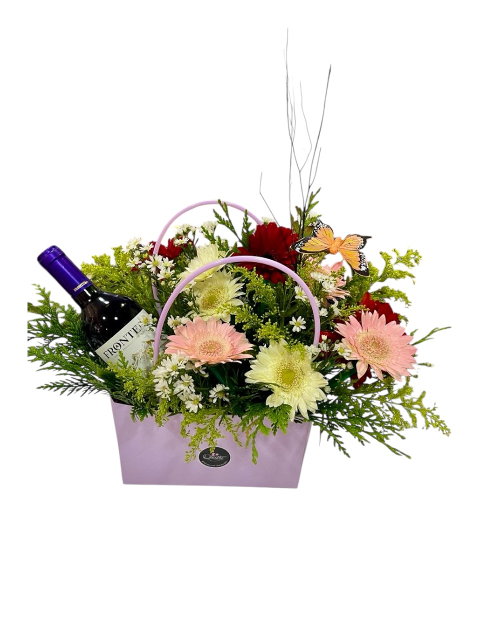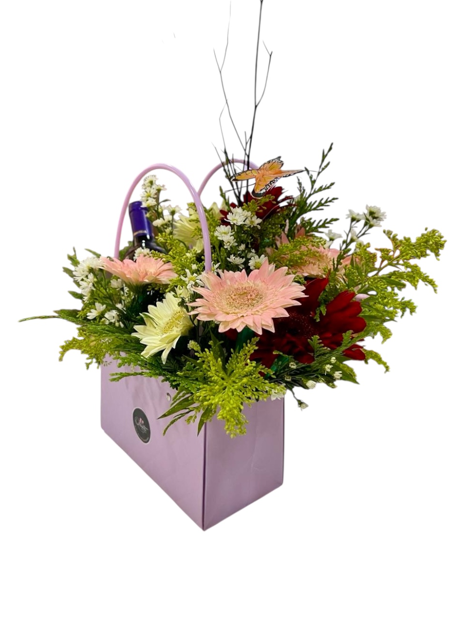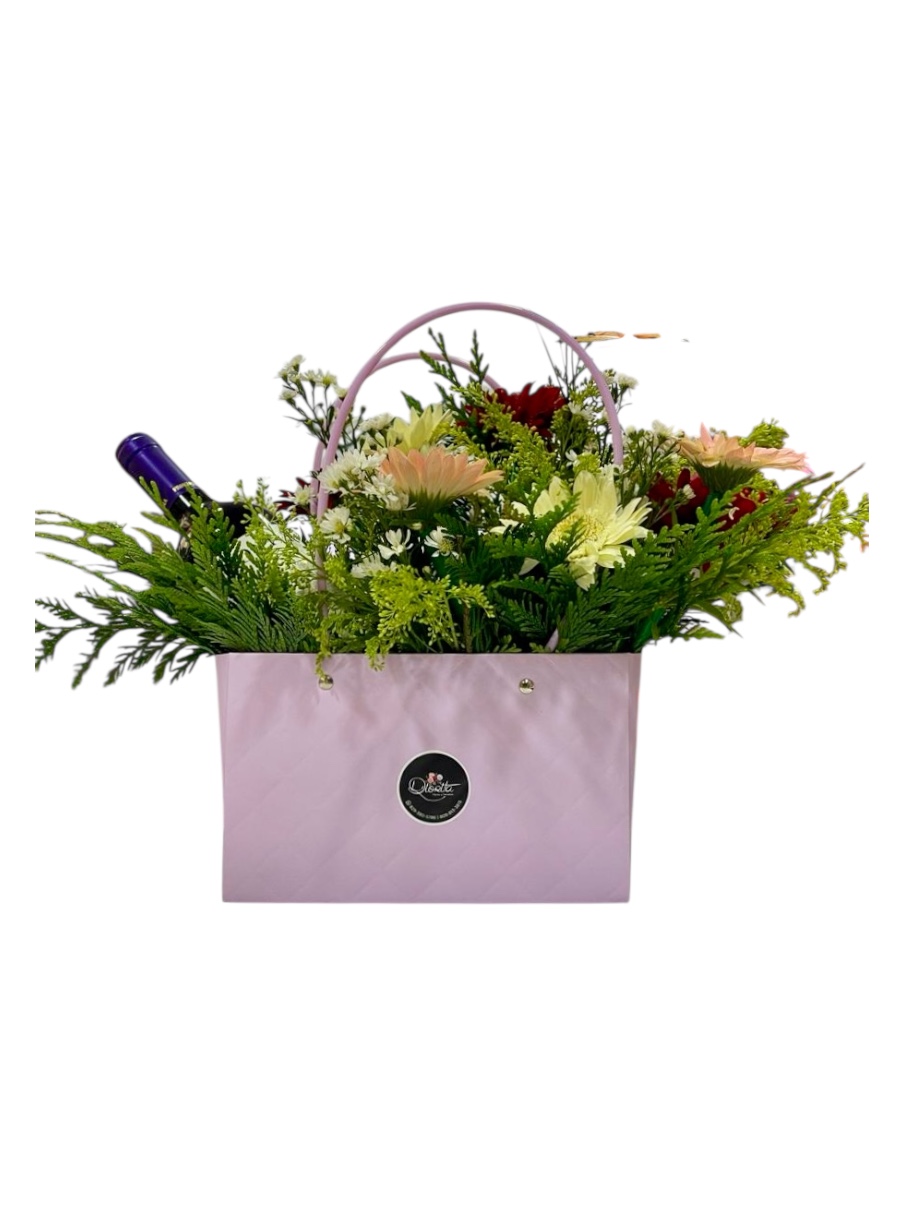 Un delicado bolso floral con una selección de flores frescas y una botella de vino. Perfecto para sorprender con elegancia y brindar por los momentos más especiales.
