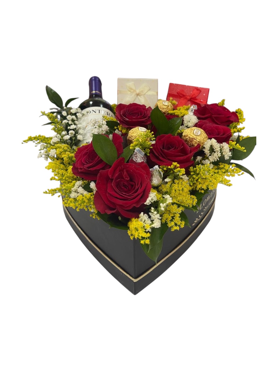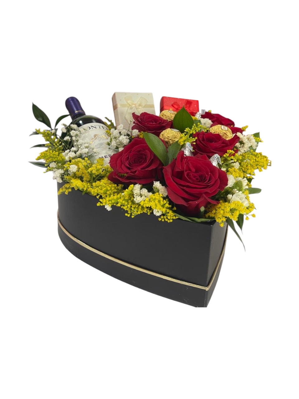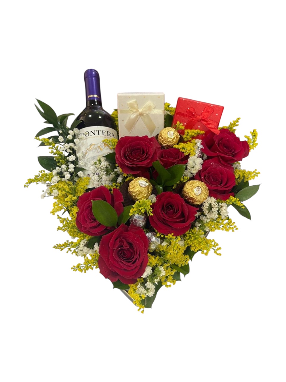 Un detalle que lo tiene todo: rosas rojas, dulces, vino y sorpresas en una elegante presentación que enamora a primera vista. ¡Ideal para celebrar momentos únicos!