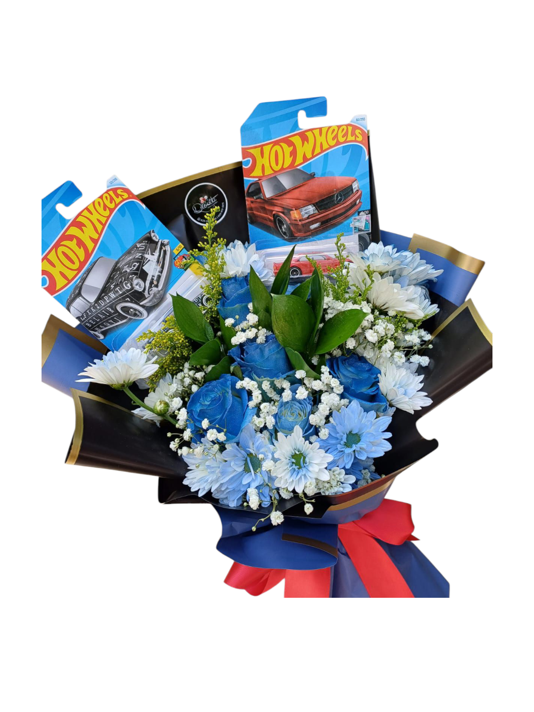 Un detalle divertido y original que une la ternura de las flores con la emoción de los carritos Hot Wheels. Rosas, margaritas, baby breath, ruscus y solidago se combinan en una armonía floral llena de color, alegría y un toque juguetón. Ideal para celebrar con estilo y creatividad.