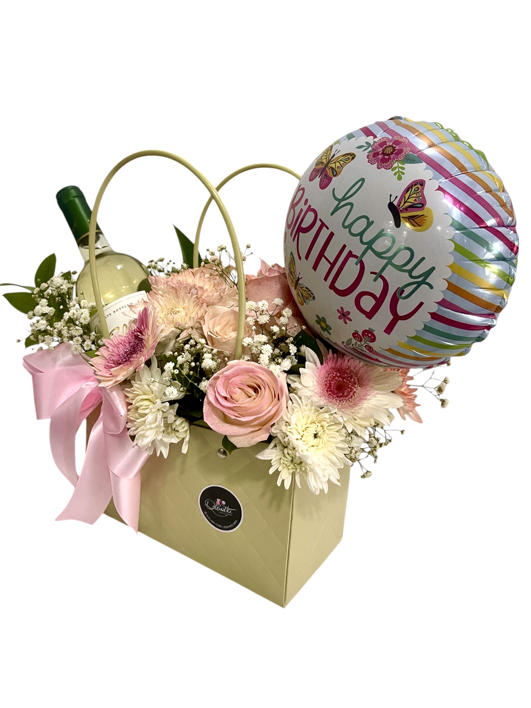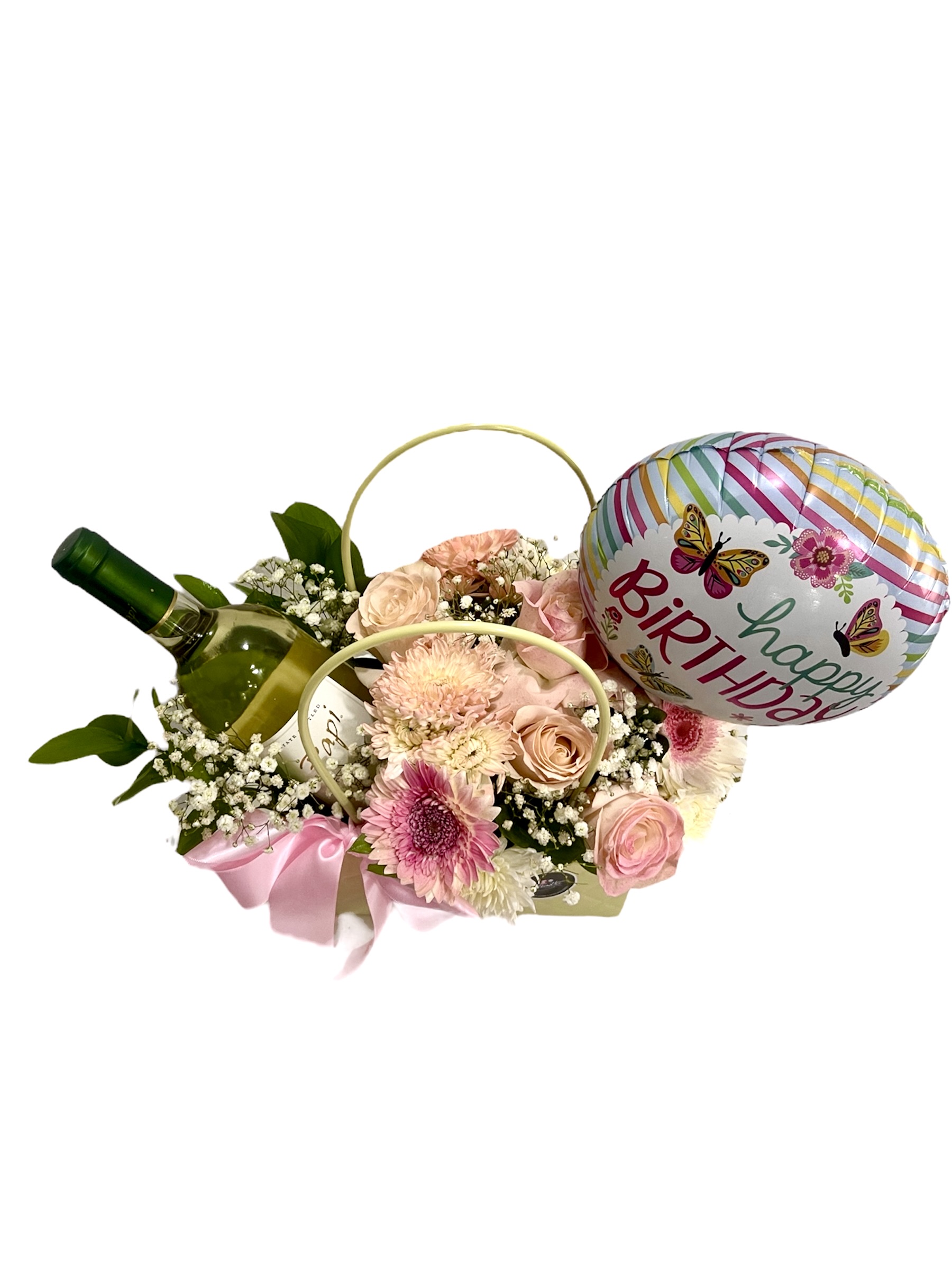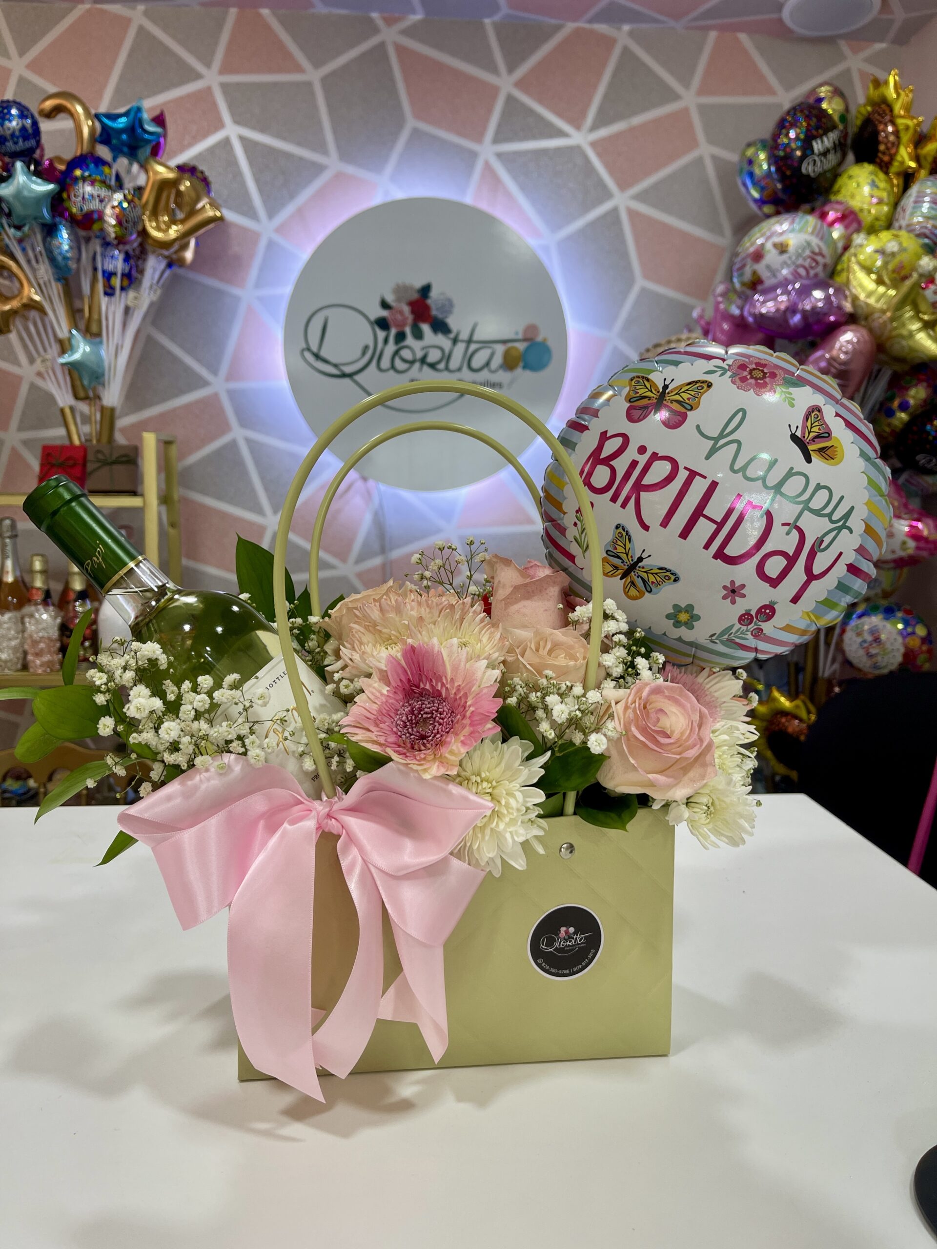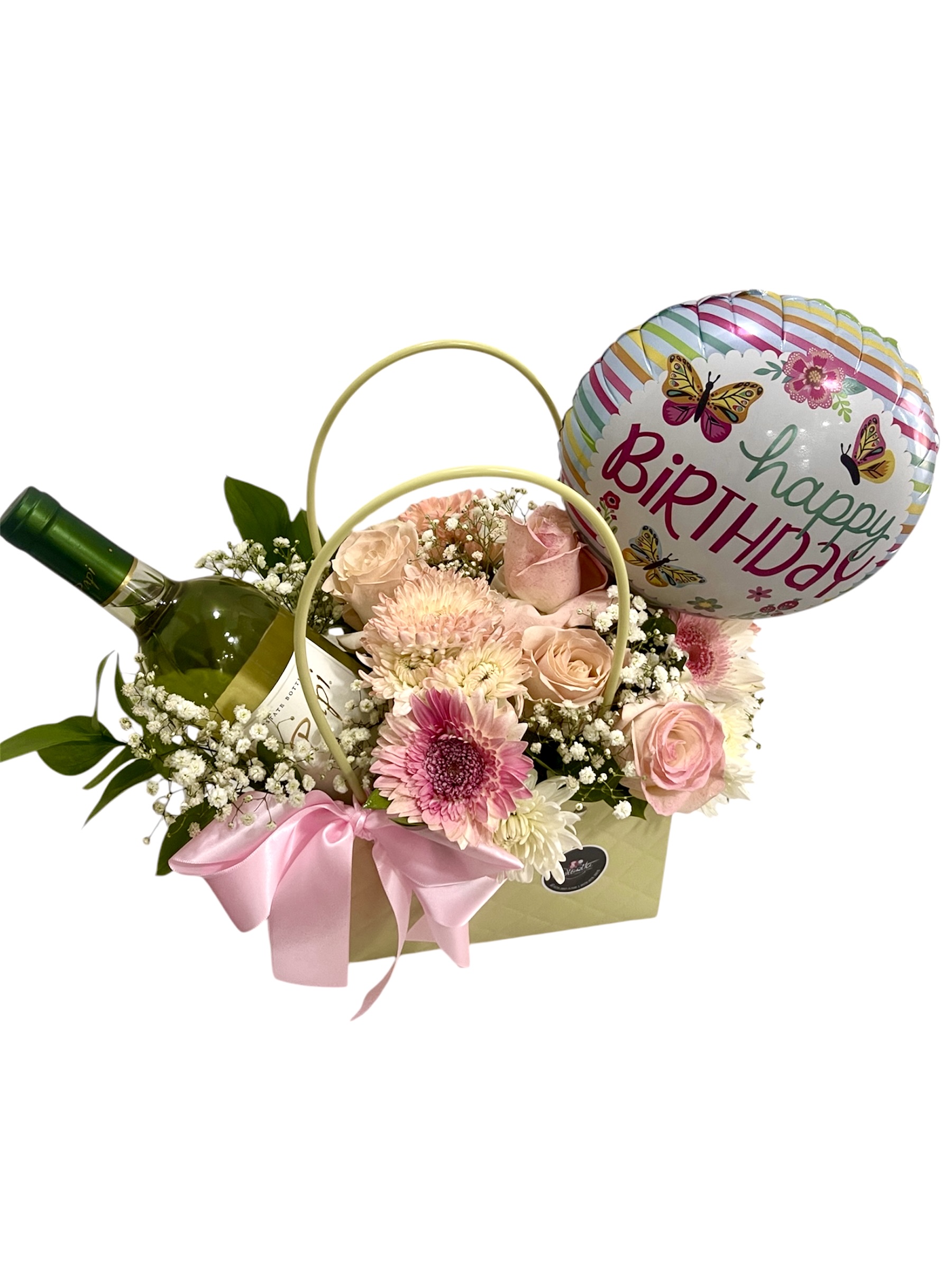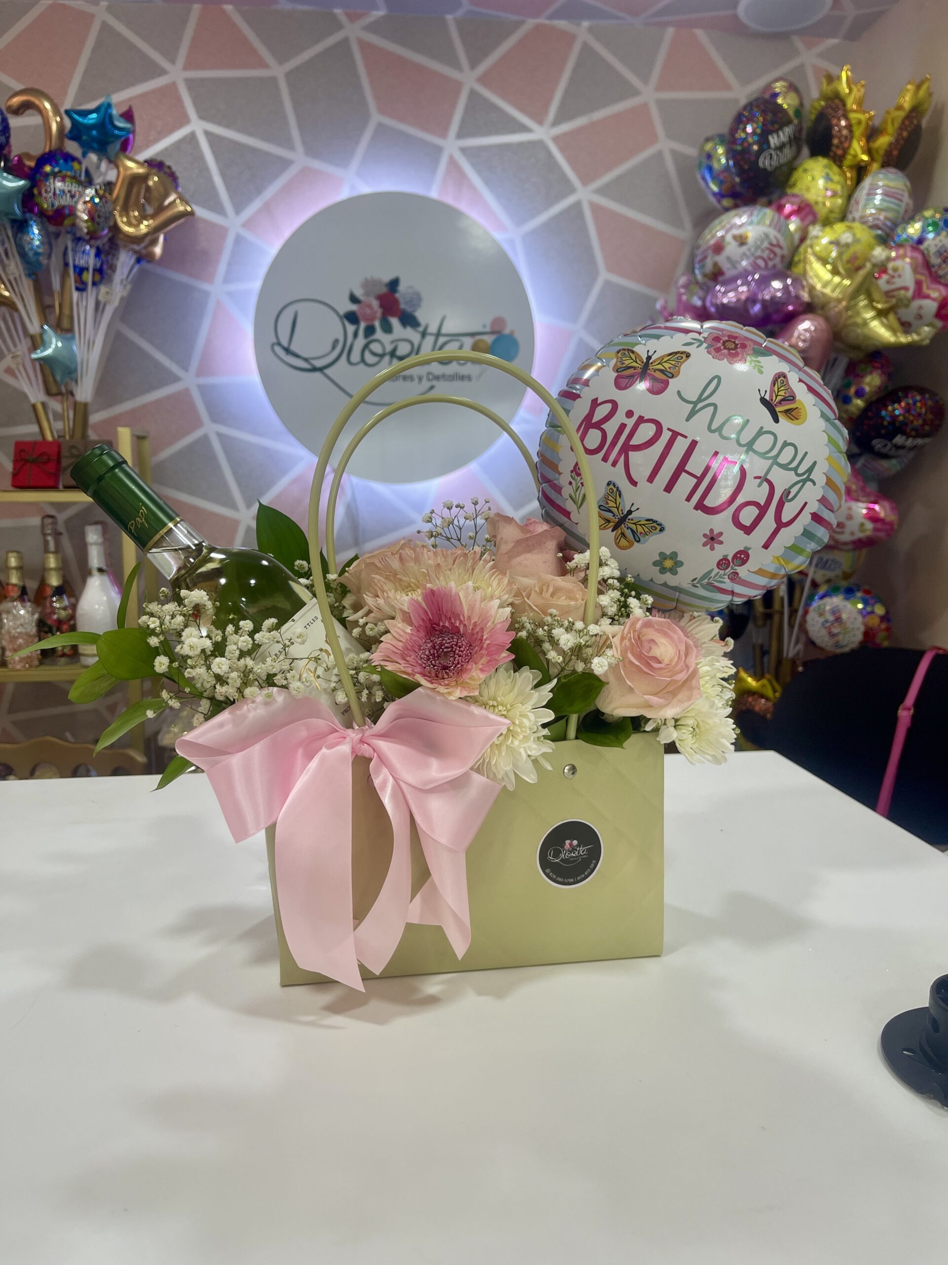 Arreglo en caja forma cartera (color variable) surtida con 04 rosas, gerberas, baby breath y ruscus, con Botella de Vino Blanco PAPI y globo HBD. La botella de vino y el globo pueden variar a solicitud del cliente, por lo que podría haber una variación en su precio final.