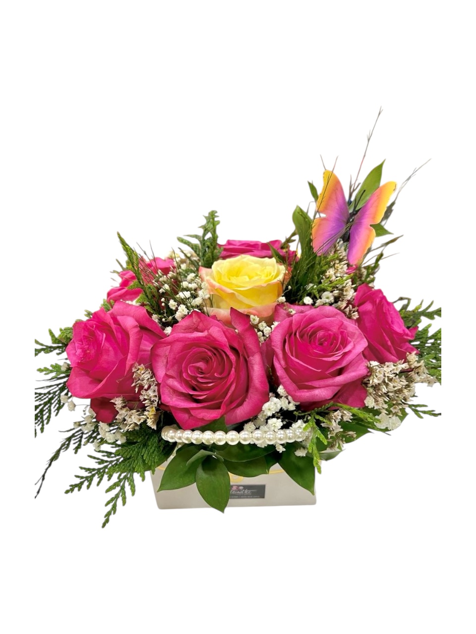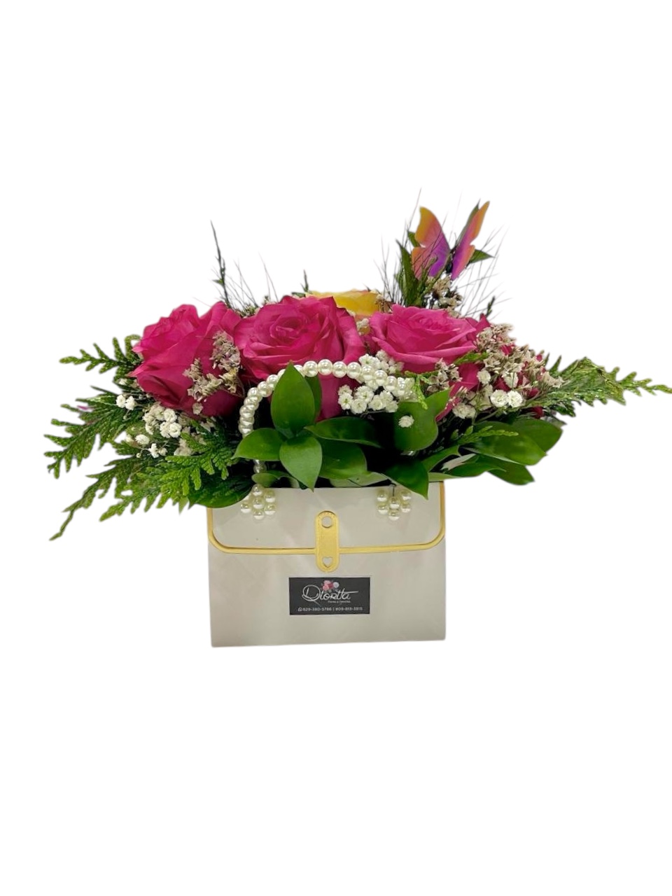 Un arreglo vibrante y con estilo, presentado en una elegante caja tipo bolso con rosas fucsias y detalles de perlas. El regalo perfecto para una mujer con clase y personalidad.