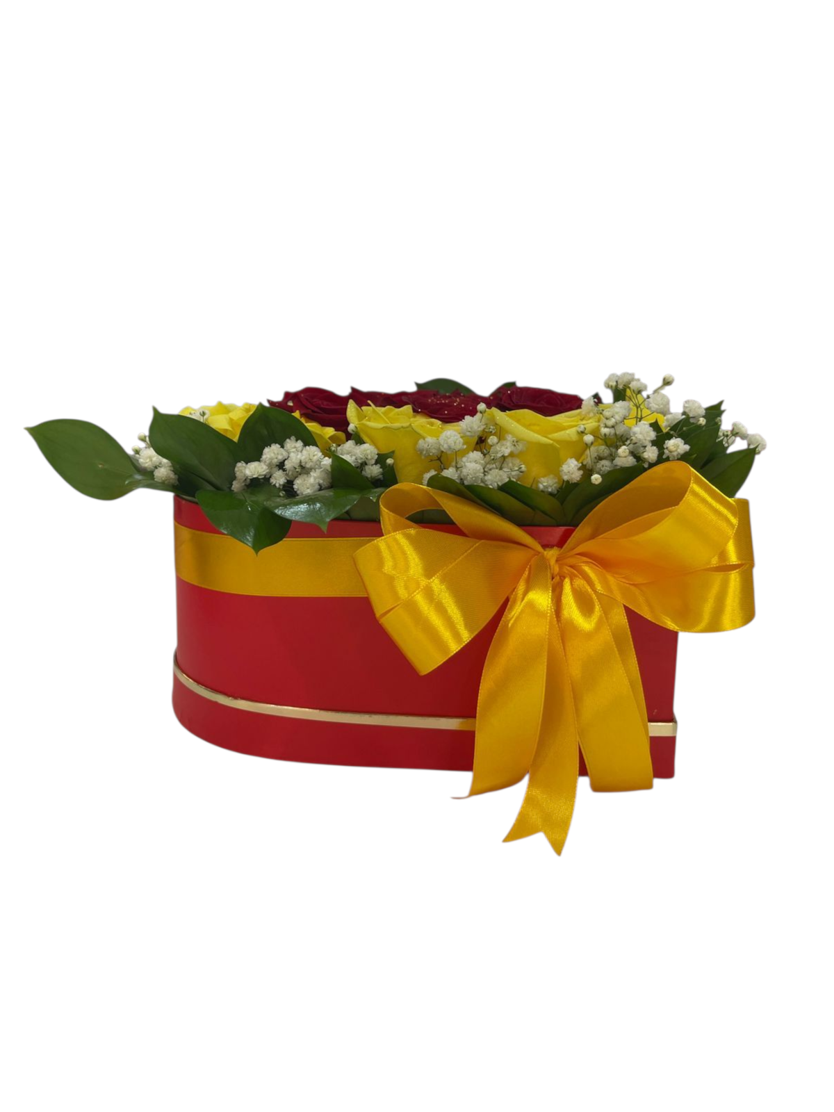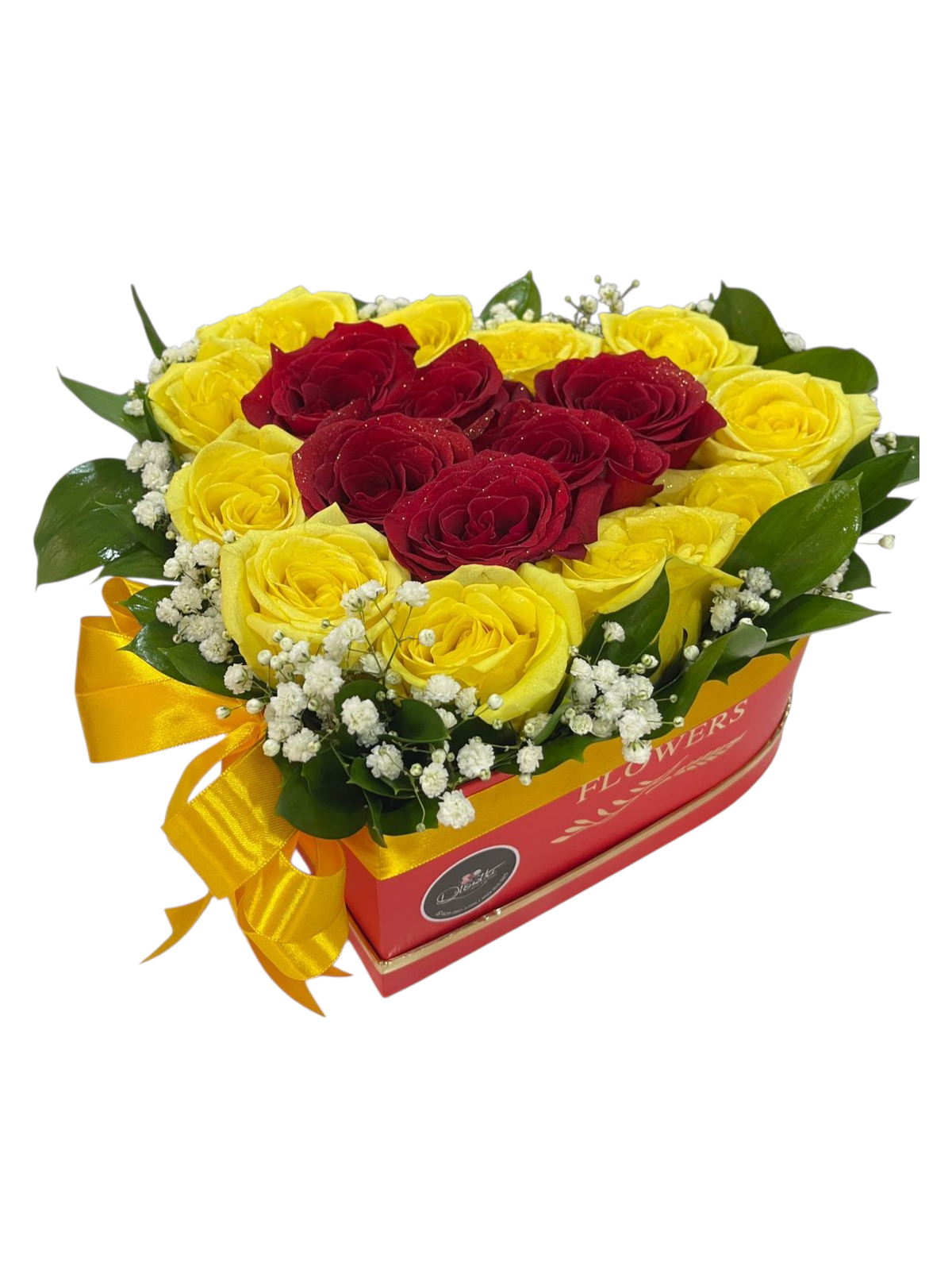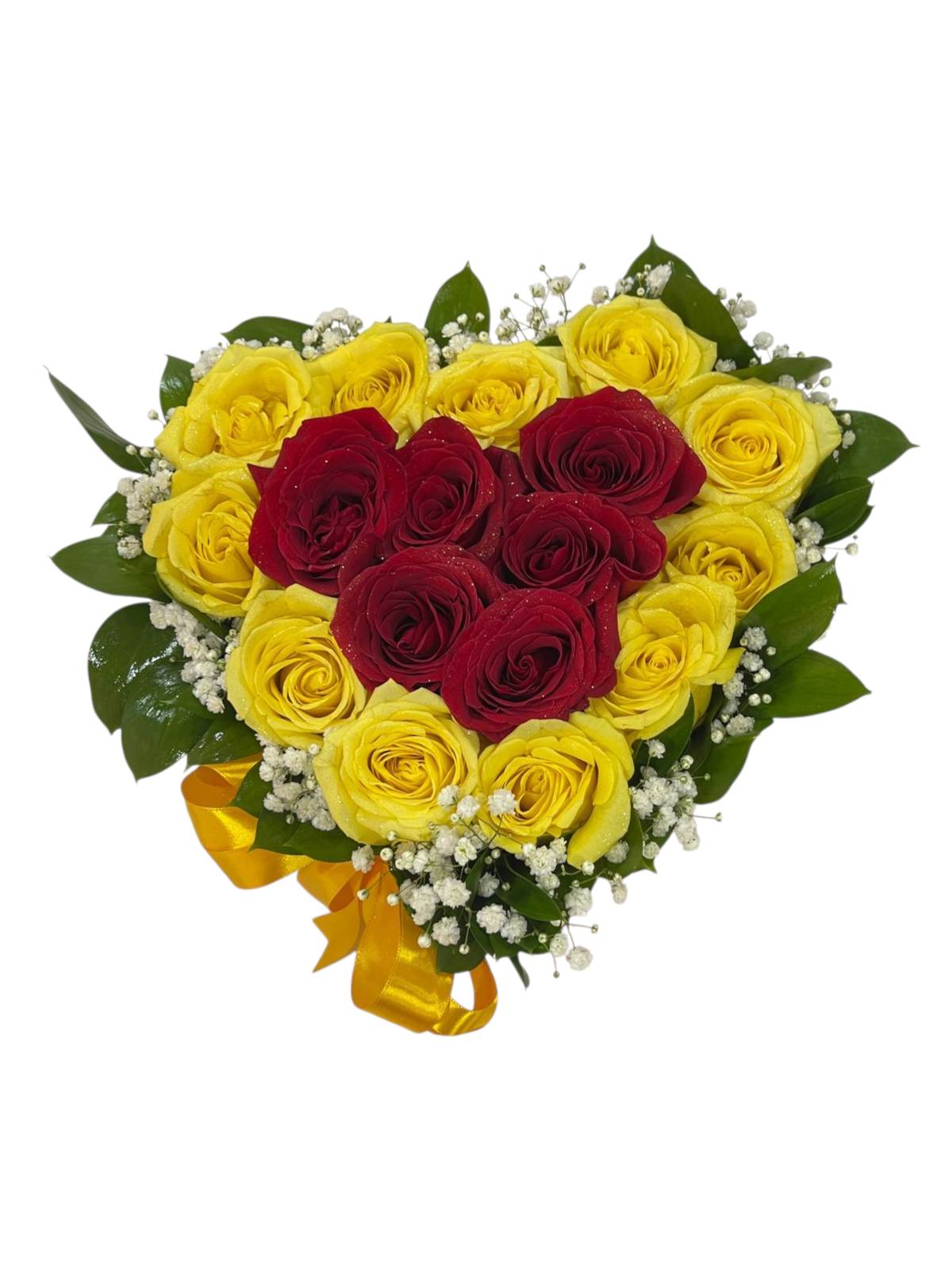 Este precioso detalle combina la calidez de las rosas amarillas y la pasión de las rojas, enmarcadas en un hermoso corazón, bordeadas de dulces detalles de ruscus y baby breath.