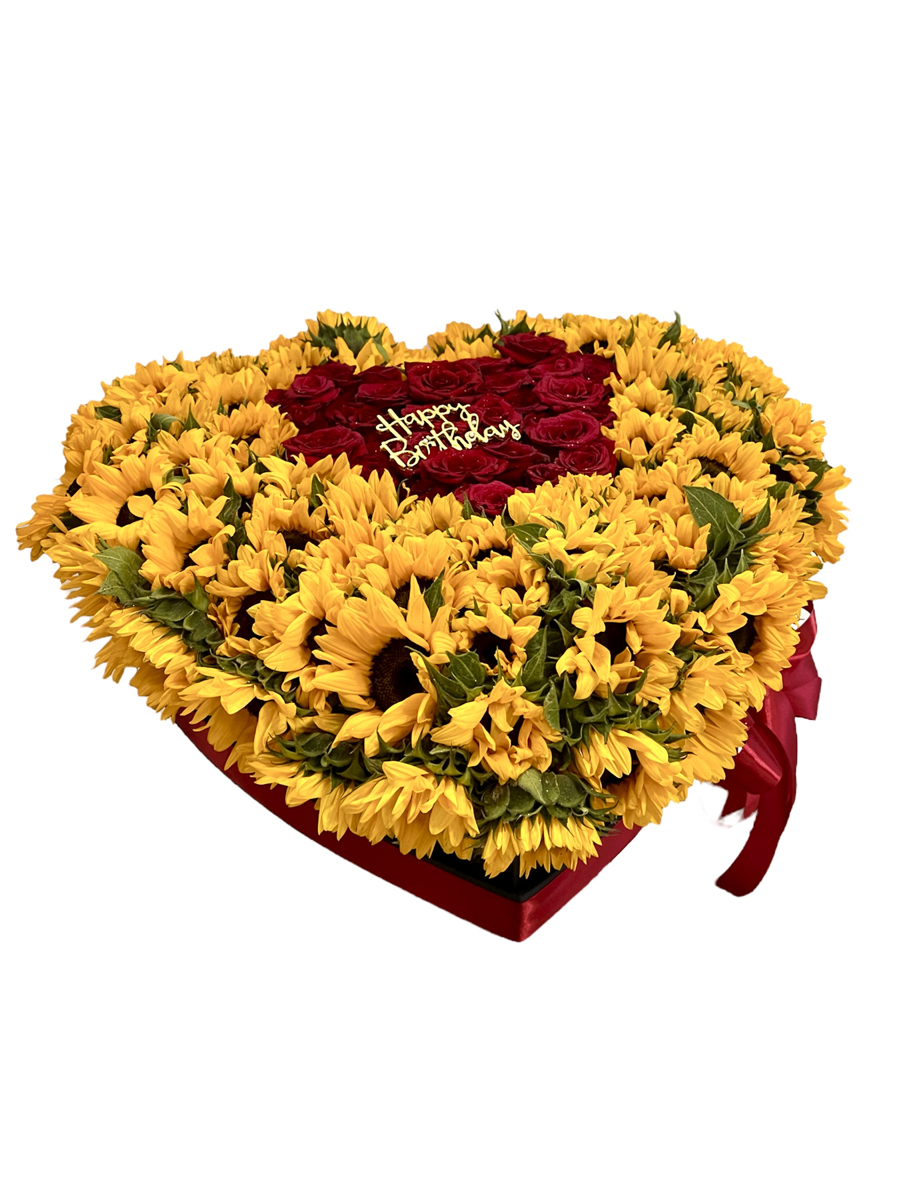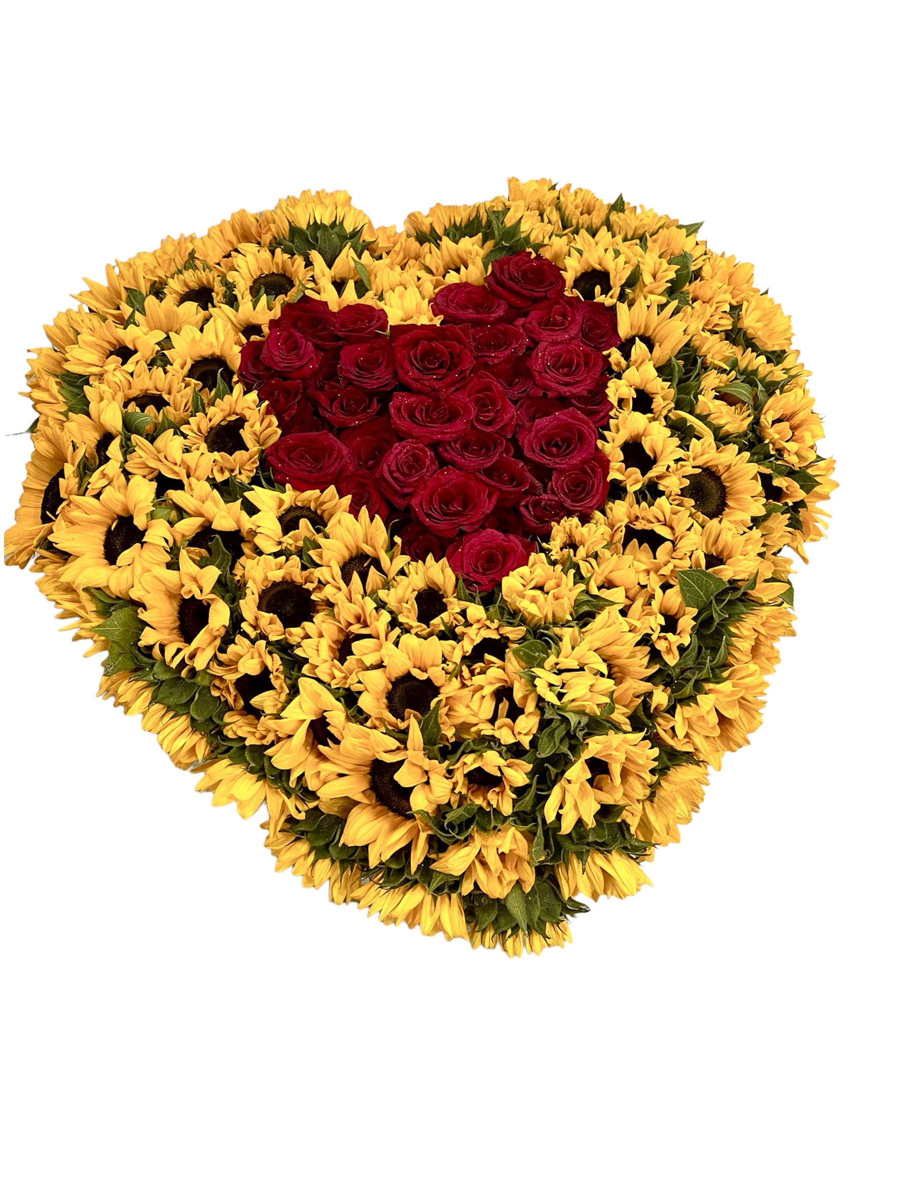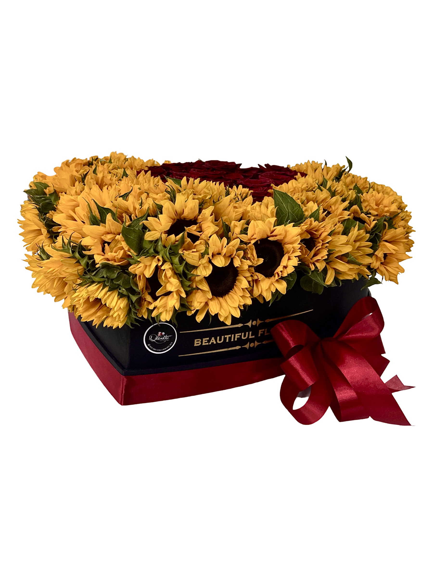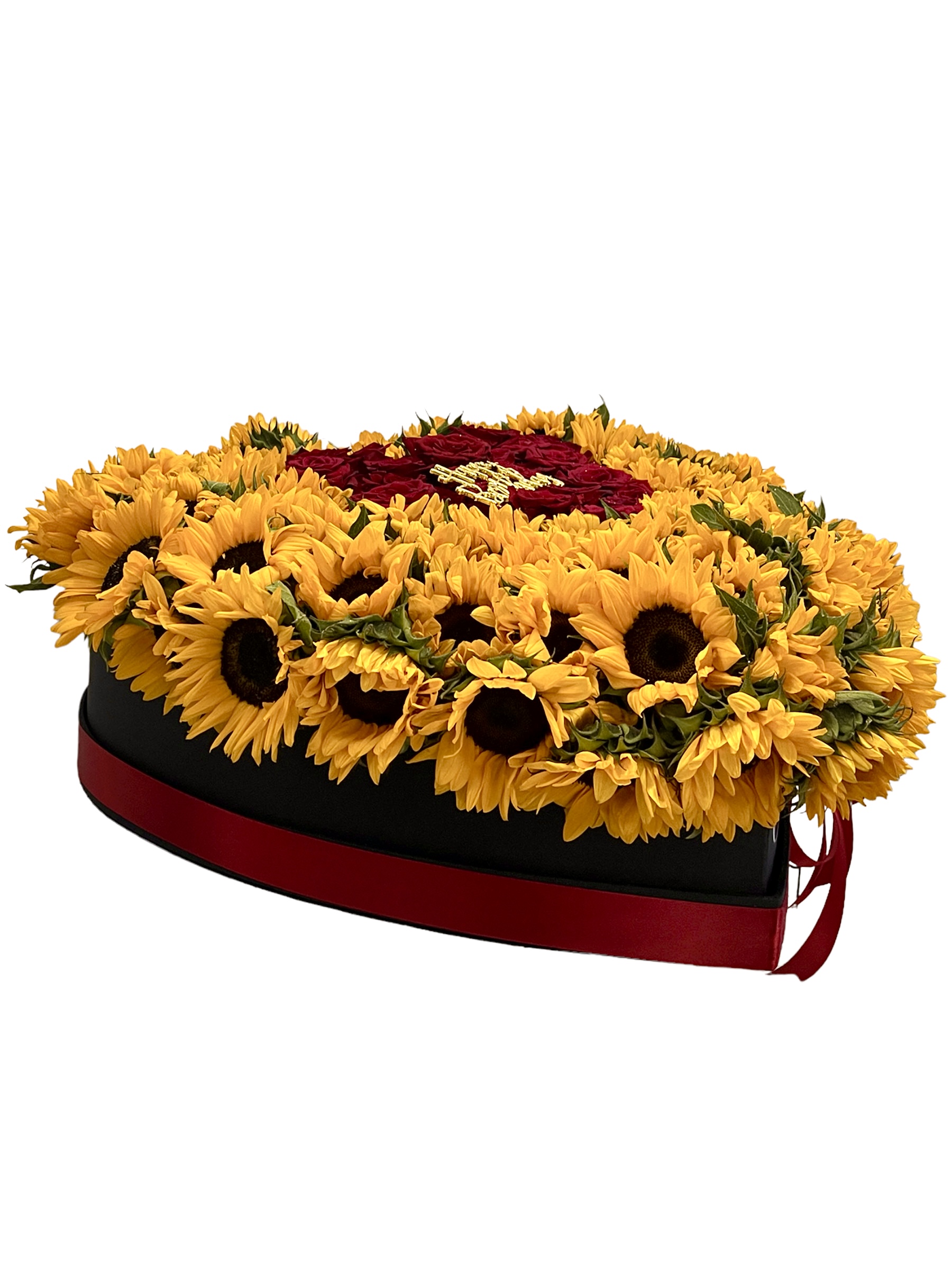 Caja negra forma corazón tamaño XL surtida con una combinación de 100 girasoles y 50 rosas rojas.