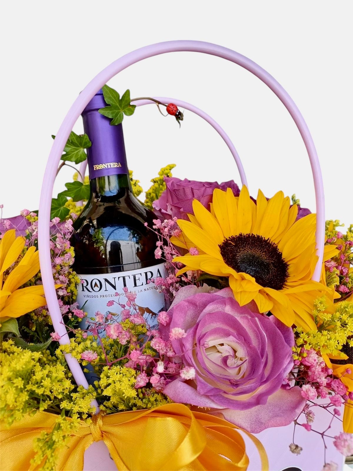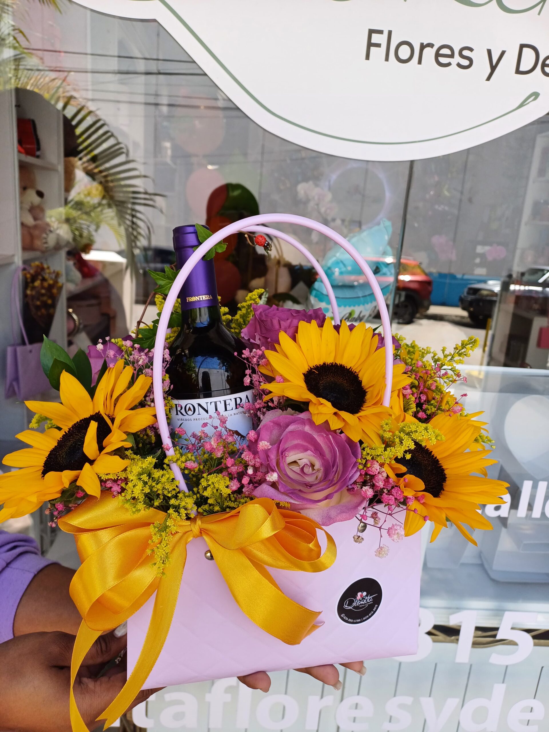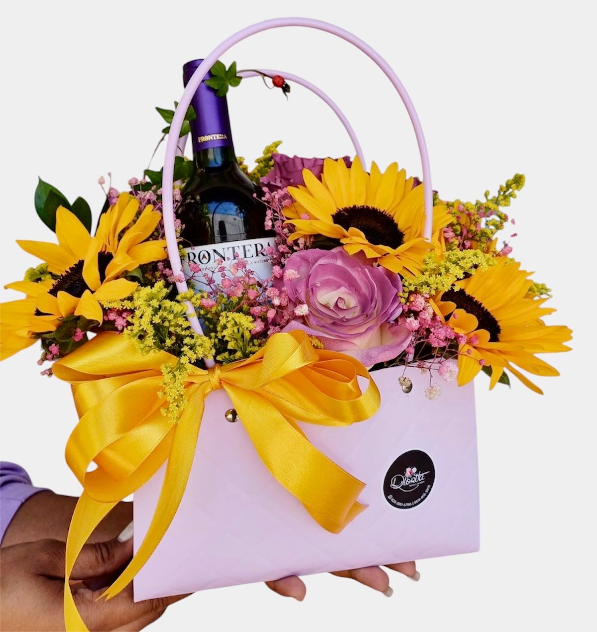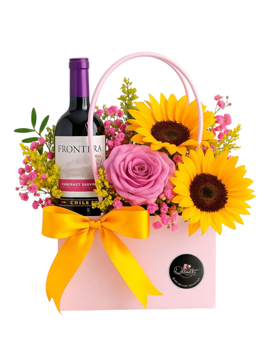 Este elegante arreglo en caja forma cartera presenta rosas vibrantes y girasoles radiantes, rodeados de delicado solidago, ruscus y baby breath. Un fabuloso elemento que se suma, la botella de vino, que añade un toque de sofisticación y celebración. Perfecto para momentos especiales, alegría y buen gusto en cada ocasión.