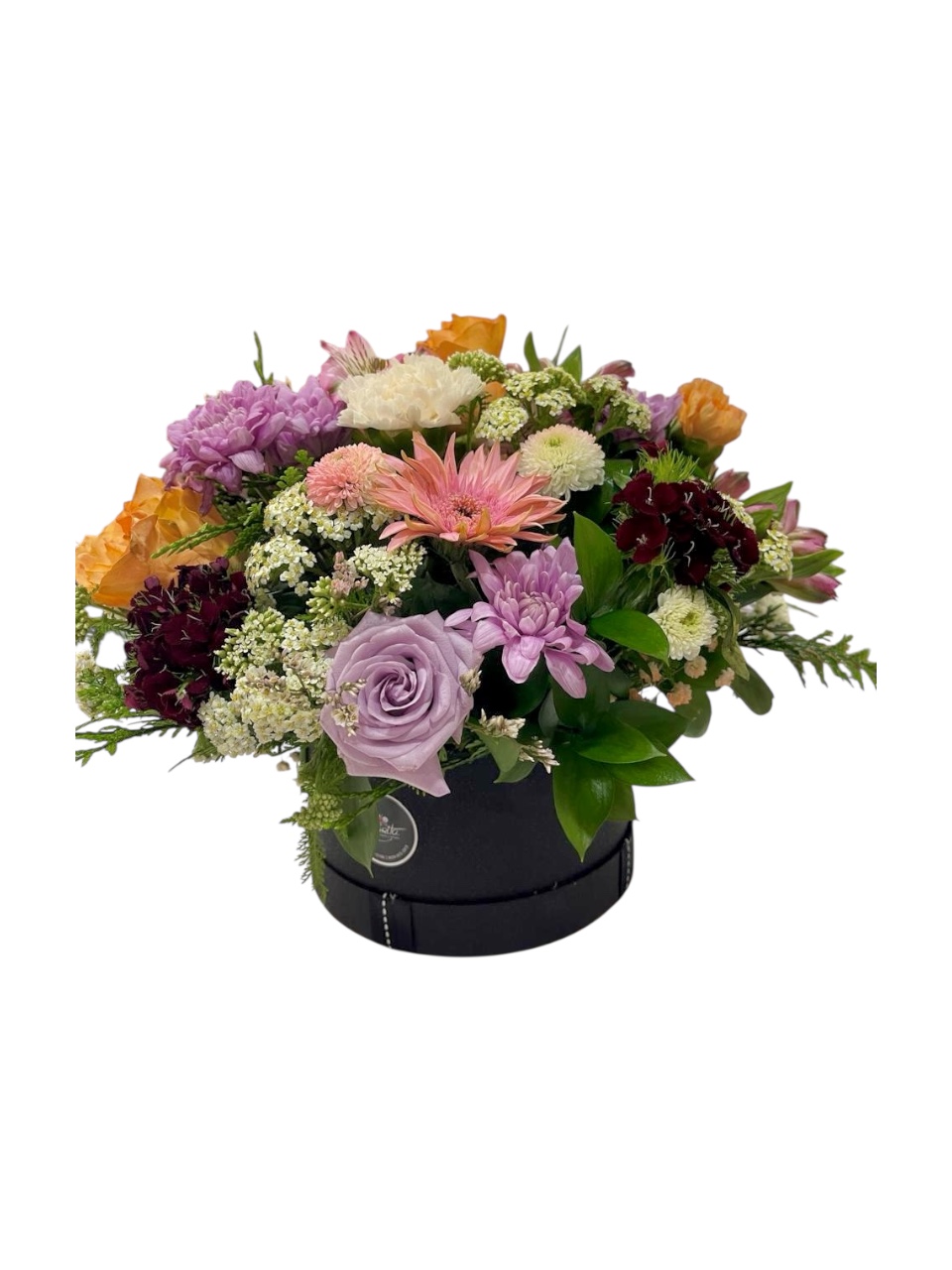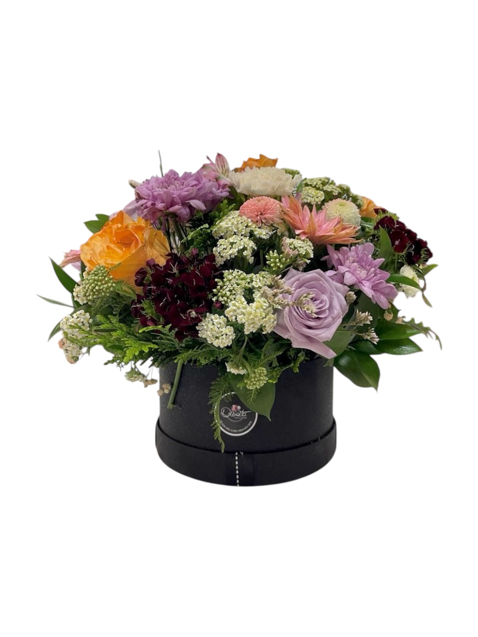 Arreglo en caja elegante con una mezcla armoniosa de flores finas y colores suaves. Un detalle lleno de distinción, ideal para sorprender con estilo y delicadeza.