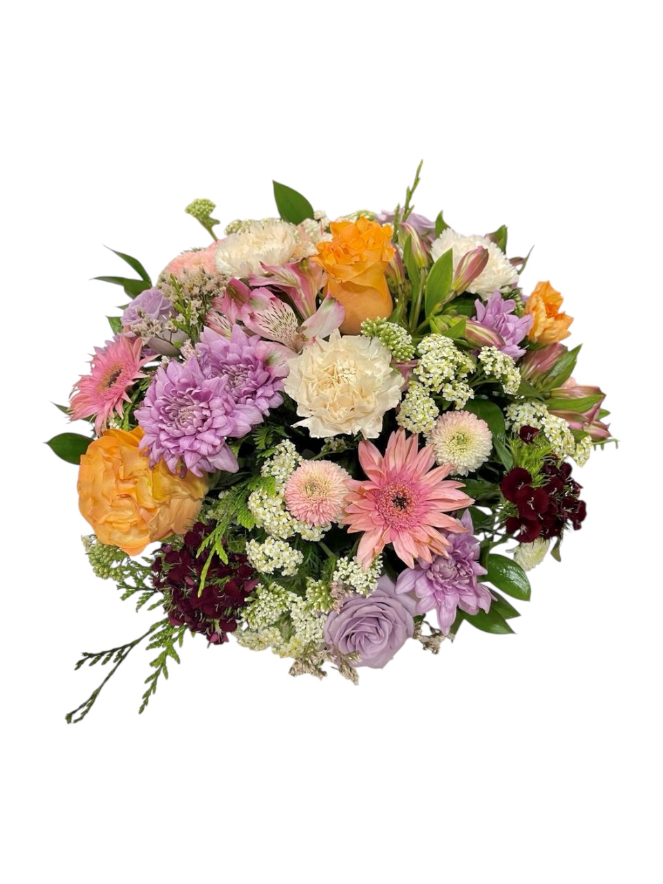 01 Exuberante explosión de rosas y flores variadas entre claveles, gerberas, rosas, pompones, astromelias y pinoquios.