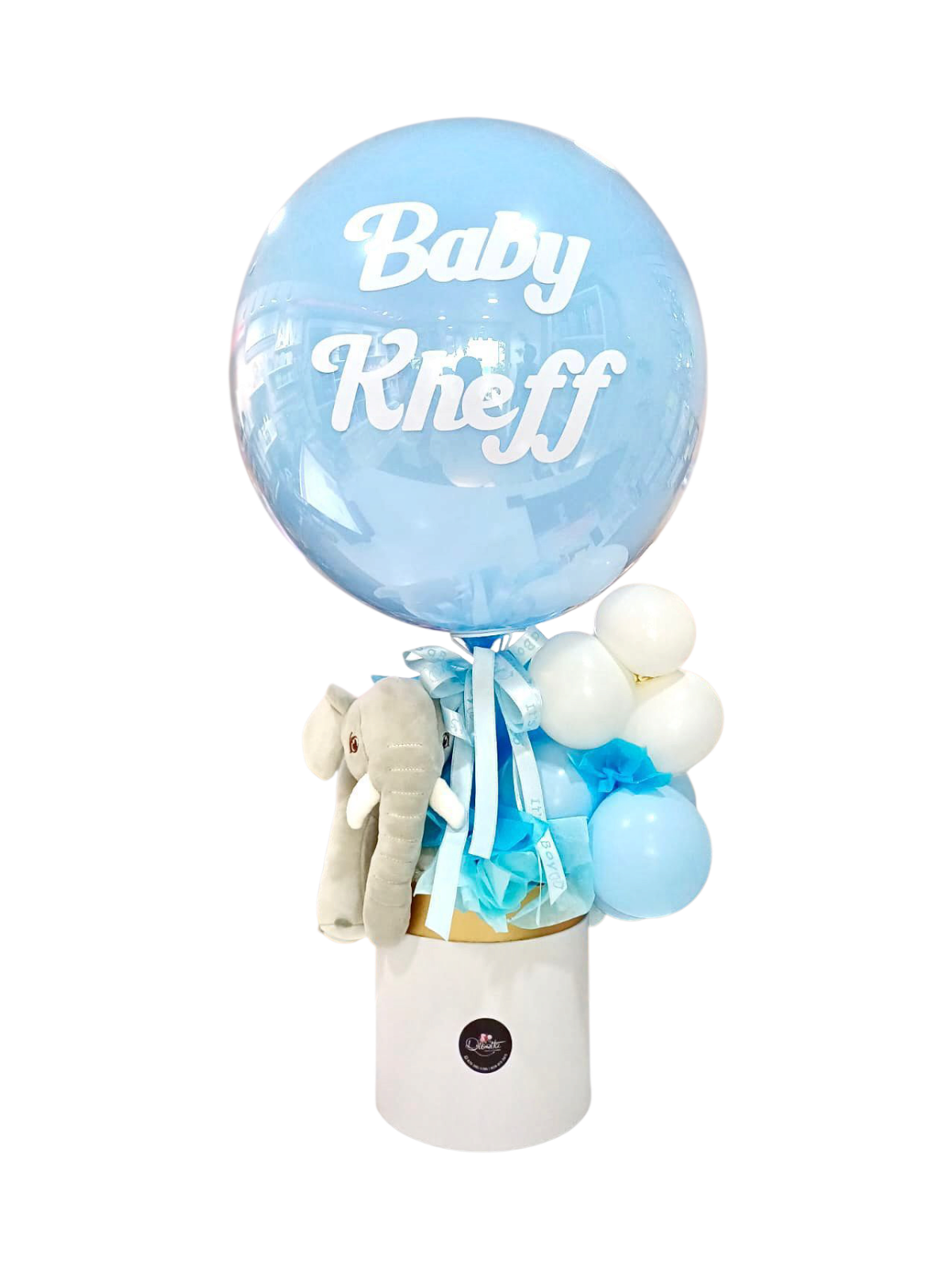 Sorprende con este tierno arreglo en suaves tonos azules y blancos, decorado con un adorable elefantito de peluche y delicados detalles en cintas. Ideal para dar la bienvenida a un bebé, decorar su habitación o regalar en un baby shower. ¡Un detalle lleno de dulzura y amor!