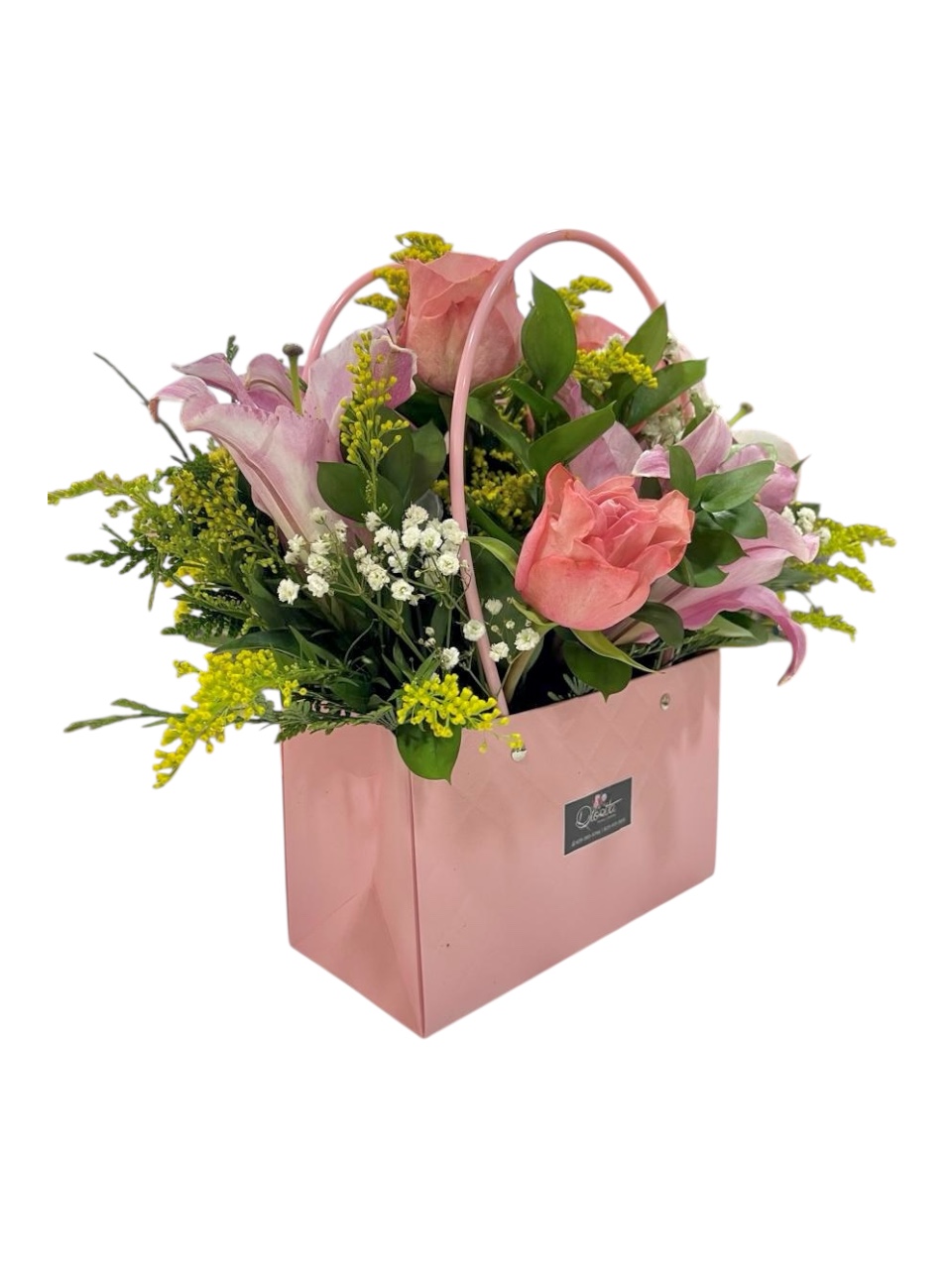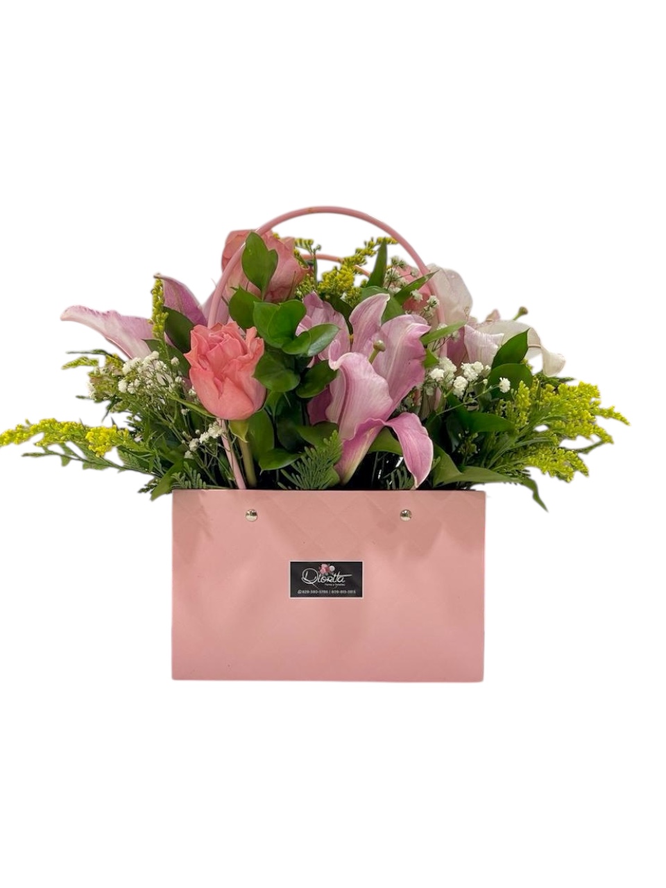 Un encantador bolso floral en tonos rosados, lleno de frescura y ternura. El detalle ideal para iluminar el día de alguien especial con delicadeza y estilo.