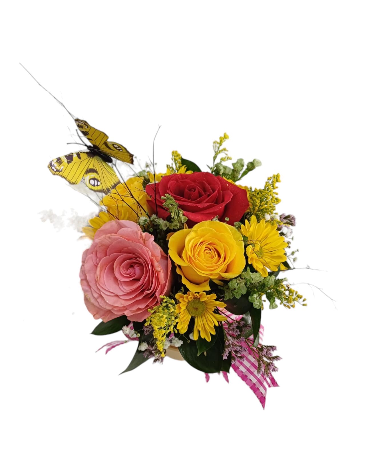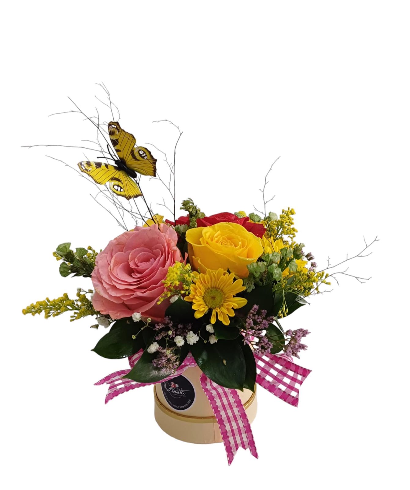 Arreglo en mini caja redonda (4×4 pulgadas) surtida de 05 rosas combinadas con estatices y pompones. Dulce detalle de mariposa.