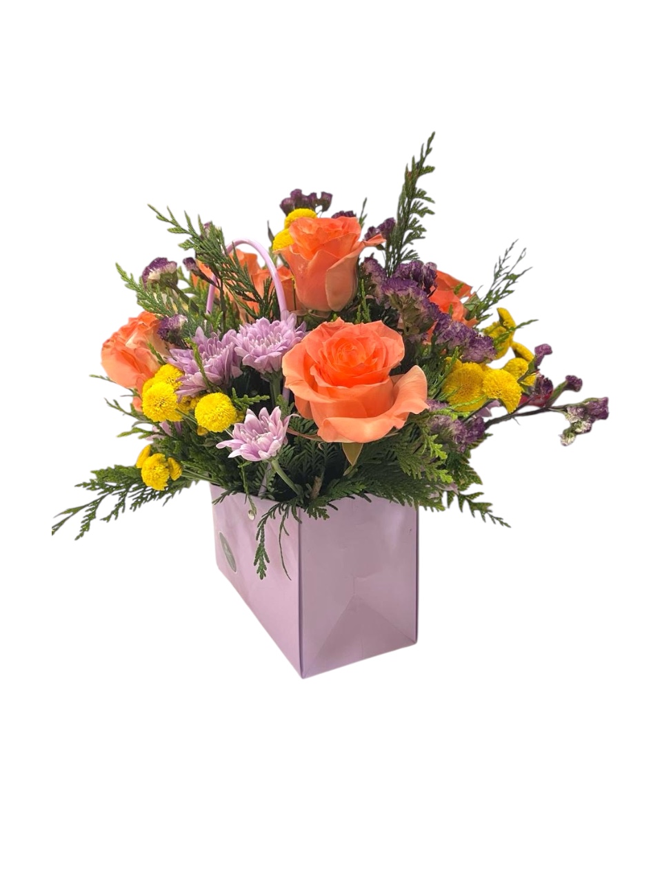 Un bolso floral en tonos lila y naranja con flores vibrantes y frescas. Ideal para regalar felicidad en forma de flores y celebrar con un detalle lleno de encanto.