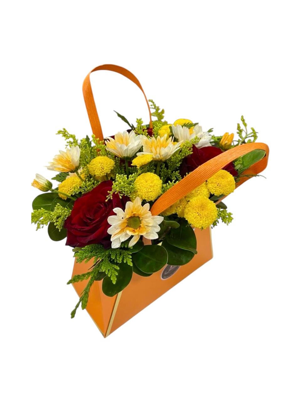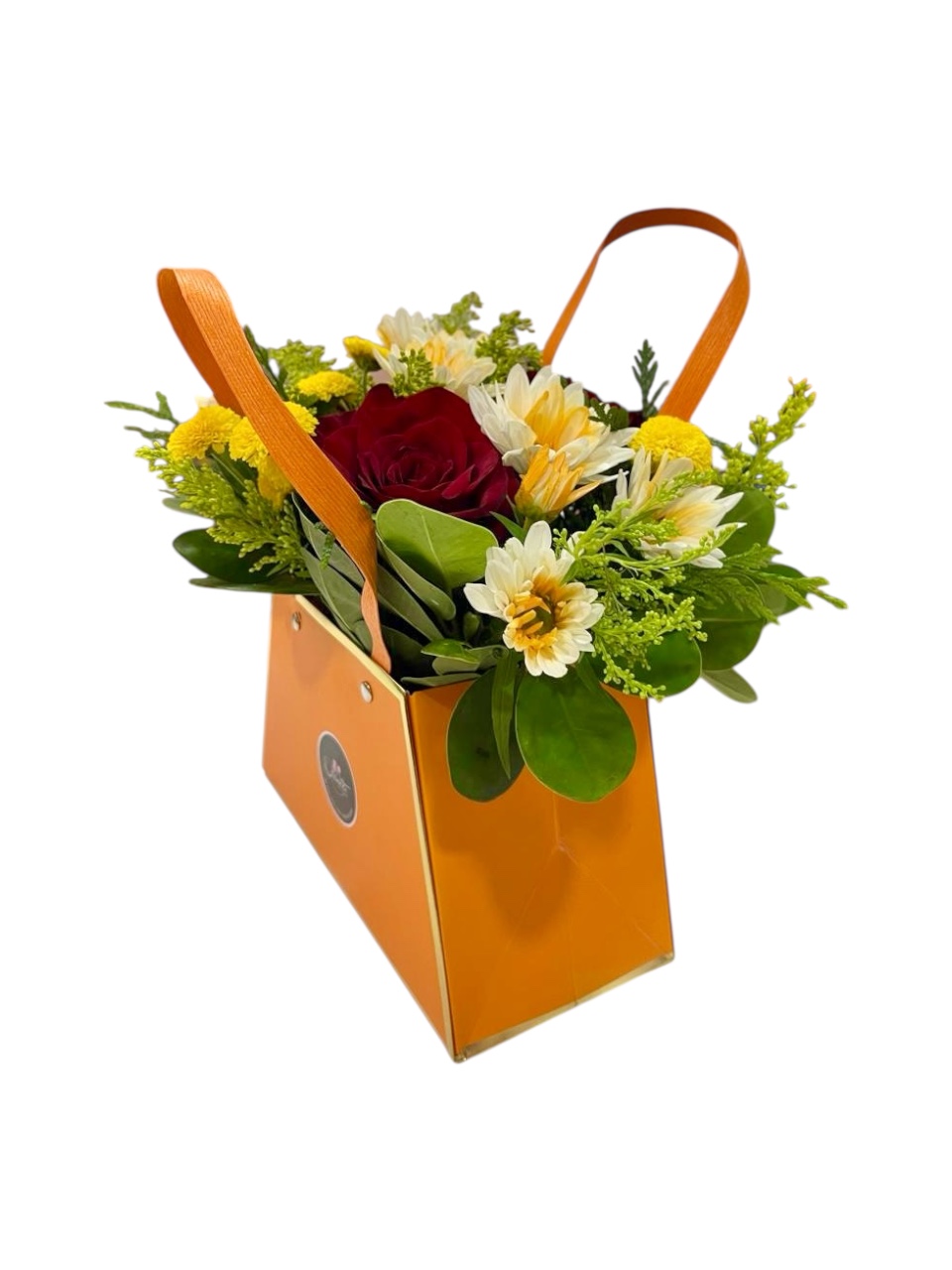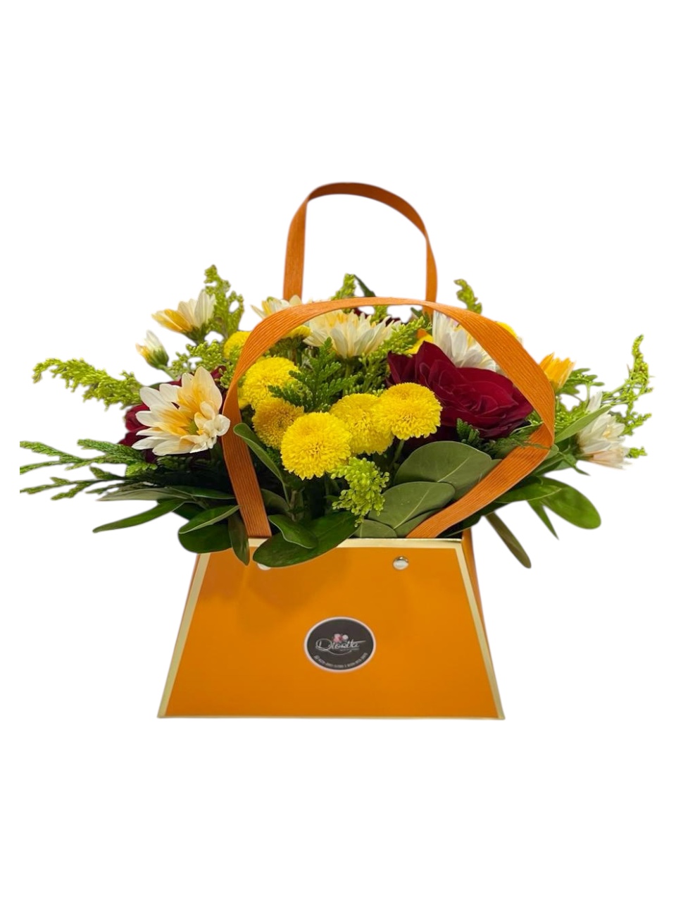 Un bolso floral lleno de color y alegría, con flores frescas en tonos amarillo, blanco y rojo. Ideal para levantar el ánimo o regalar sonrisas en cualquier ocasión.