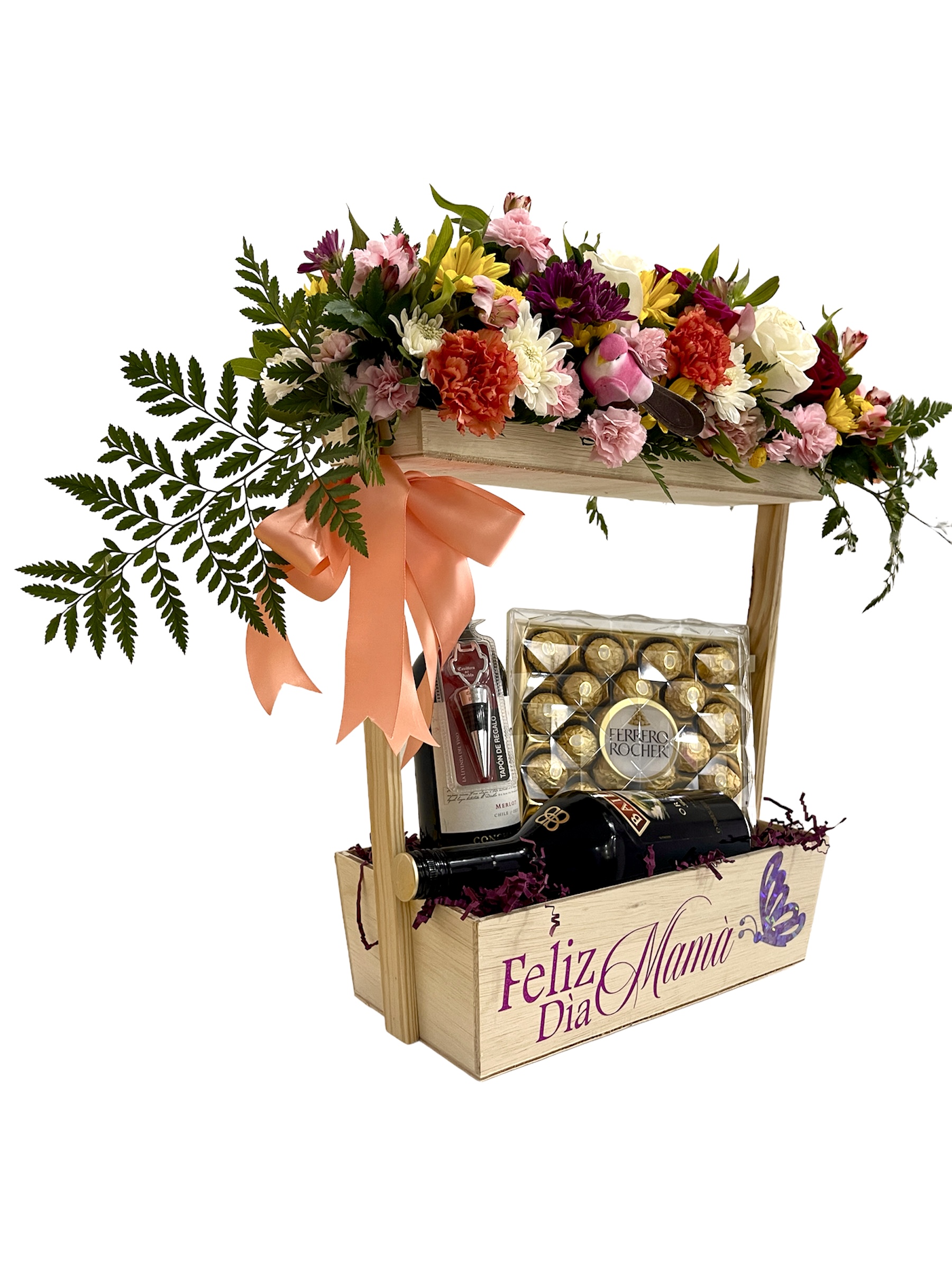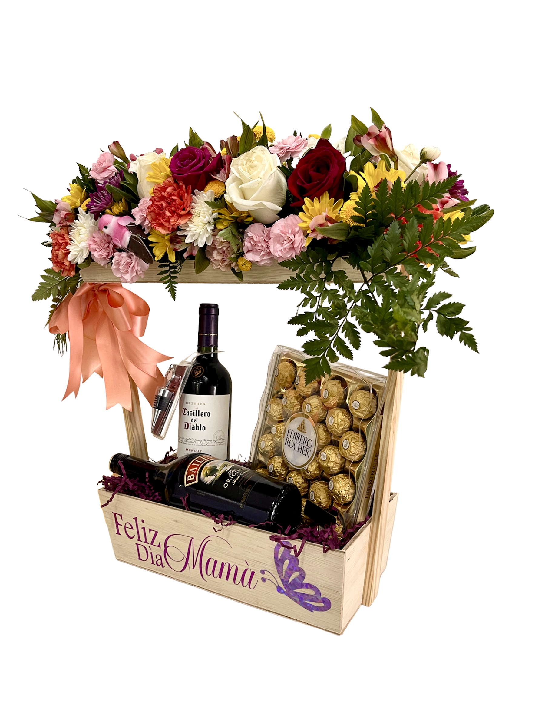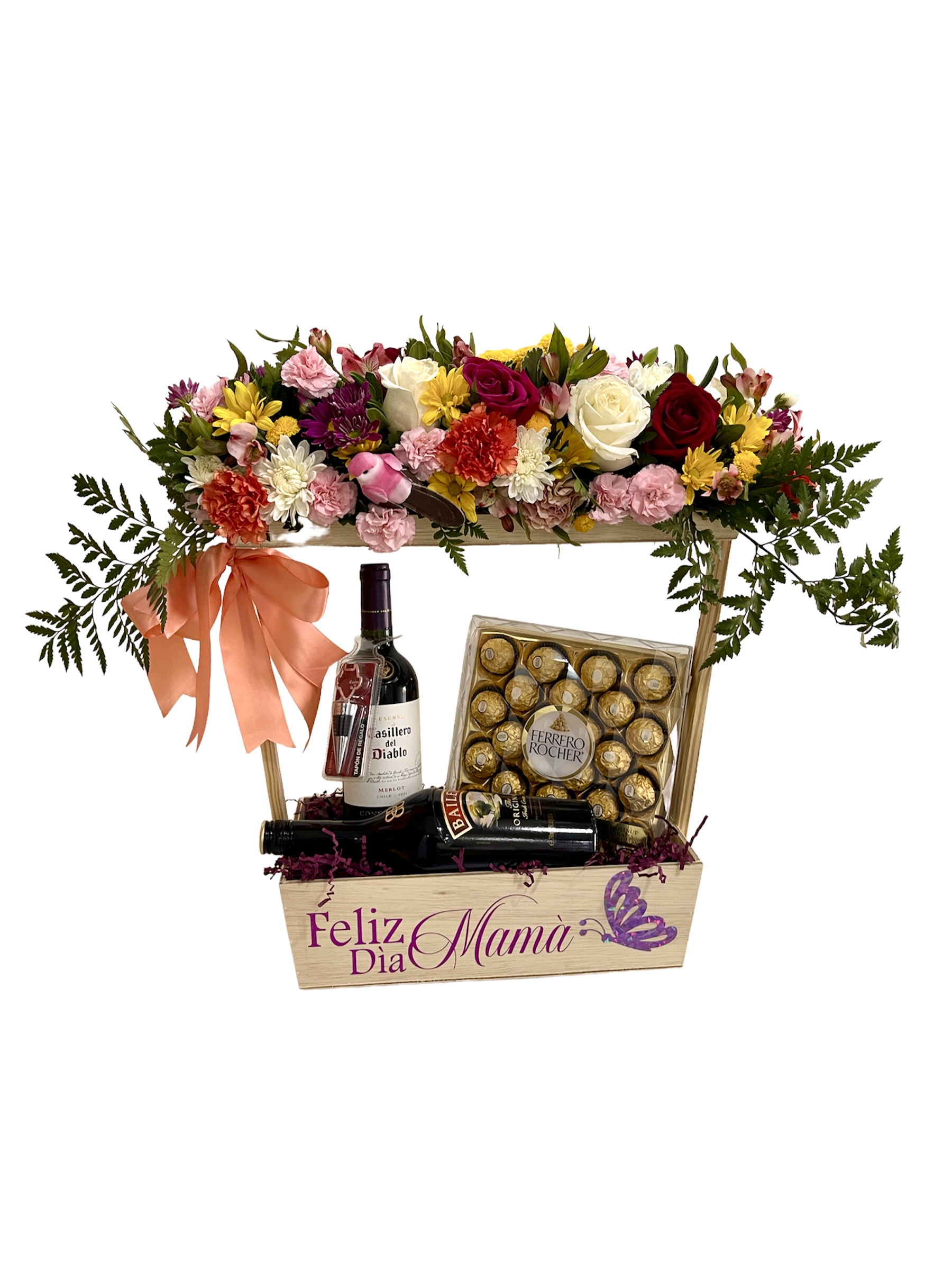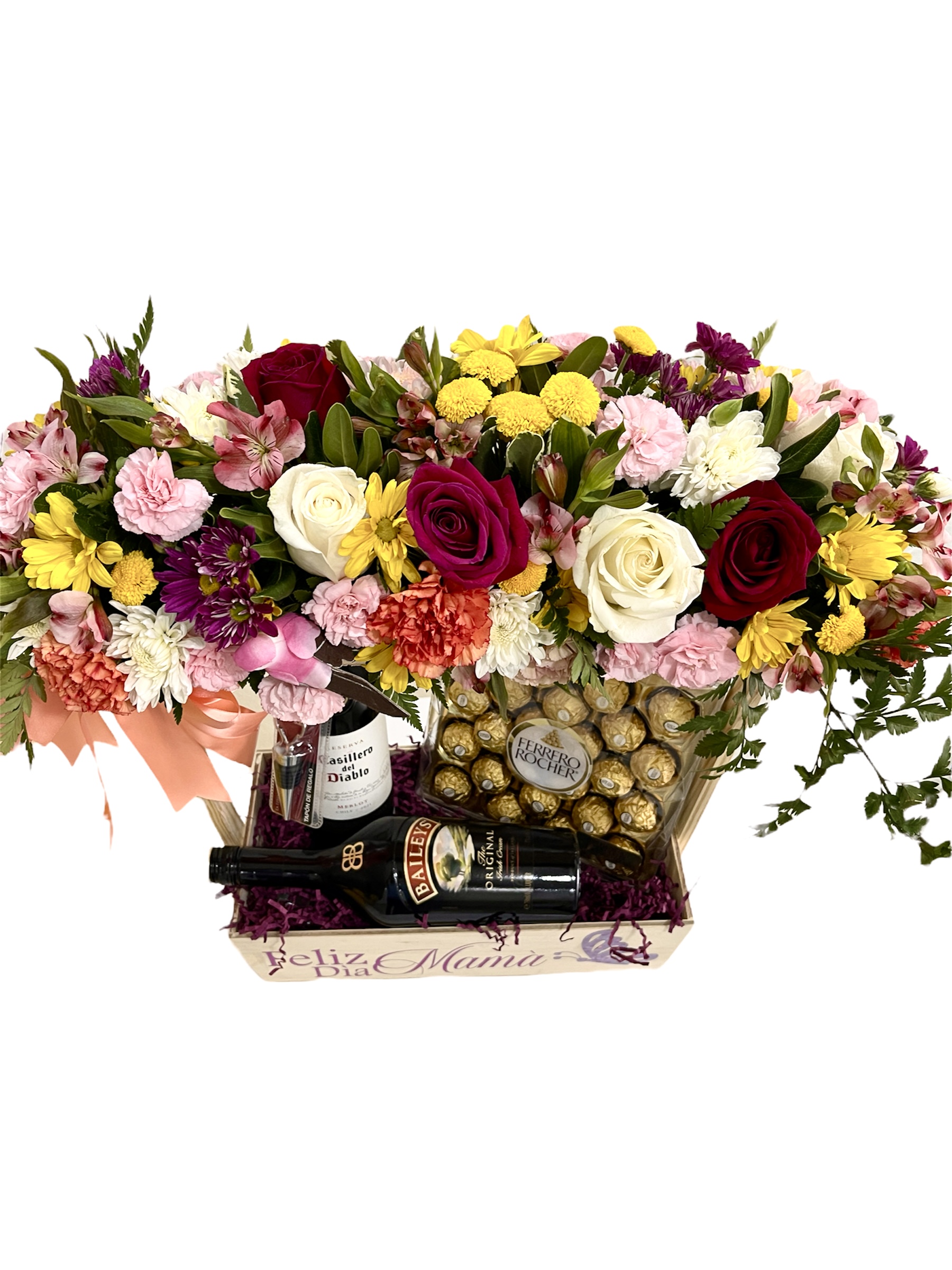 Arreglo en macetero doble bandeja en madera surtida de variedad de flores en su tope, botellas de vino y Baileys acompañados de un caja de 25 sabrosos bombones Ferrero Rocher.