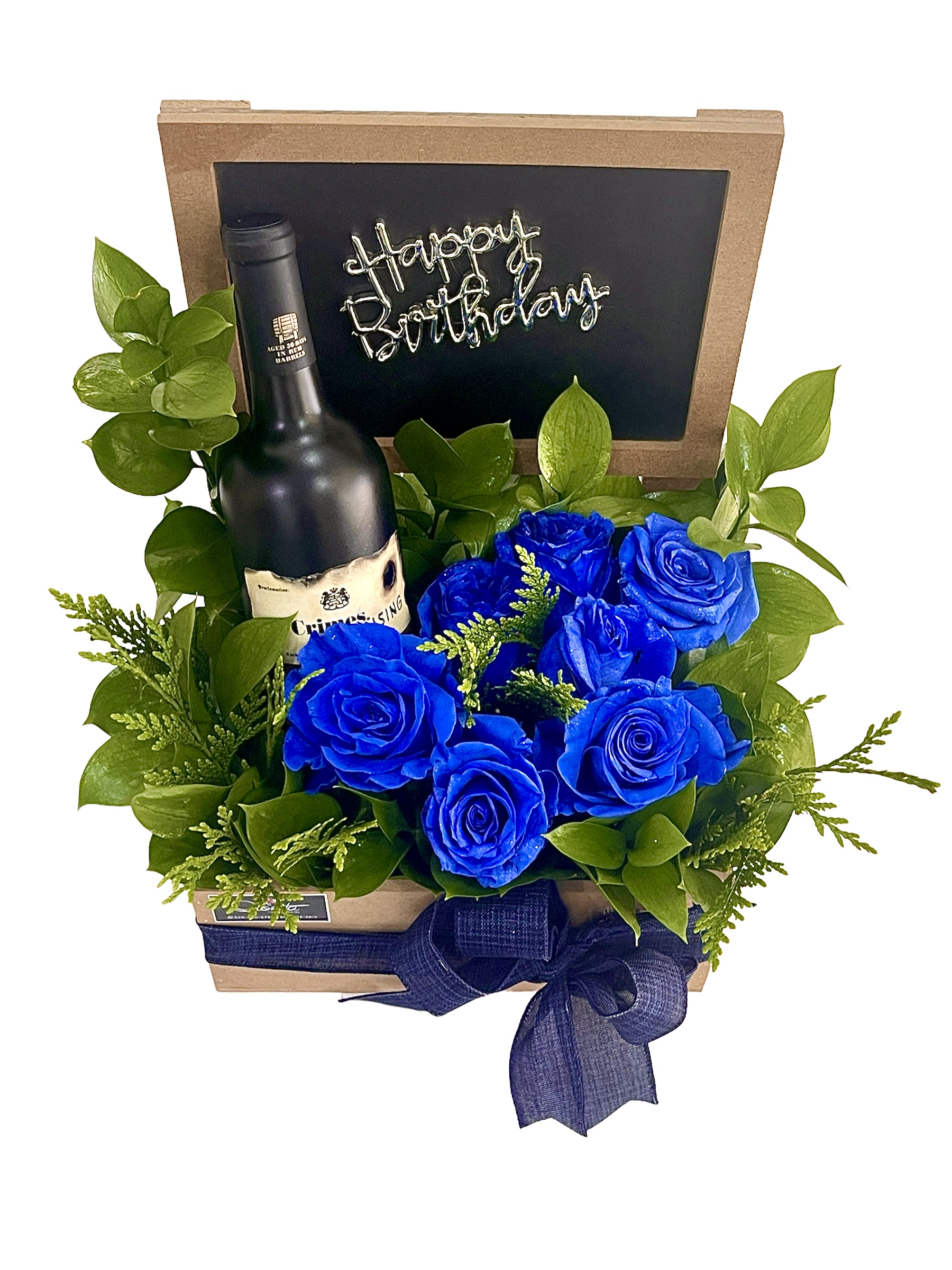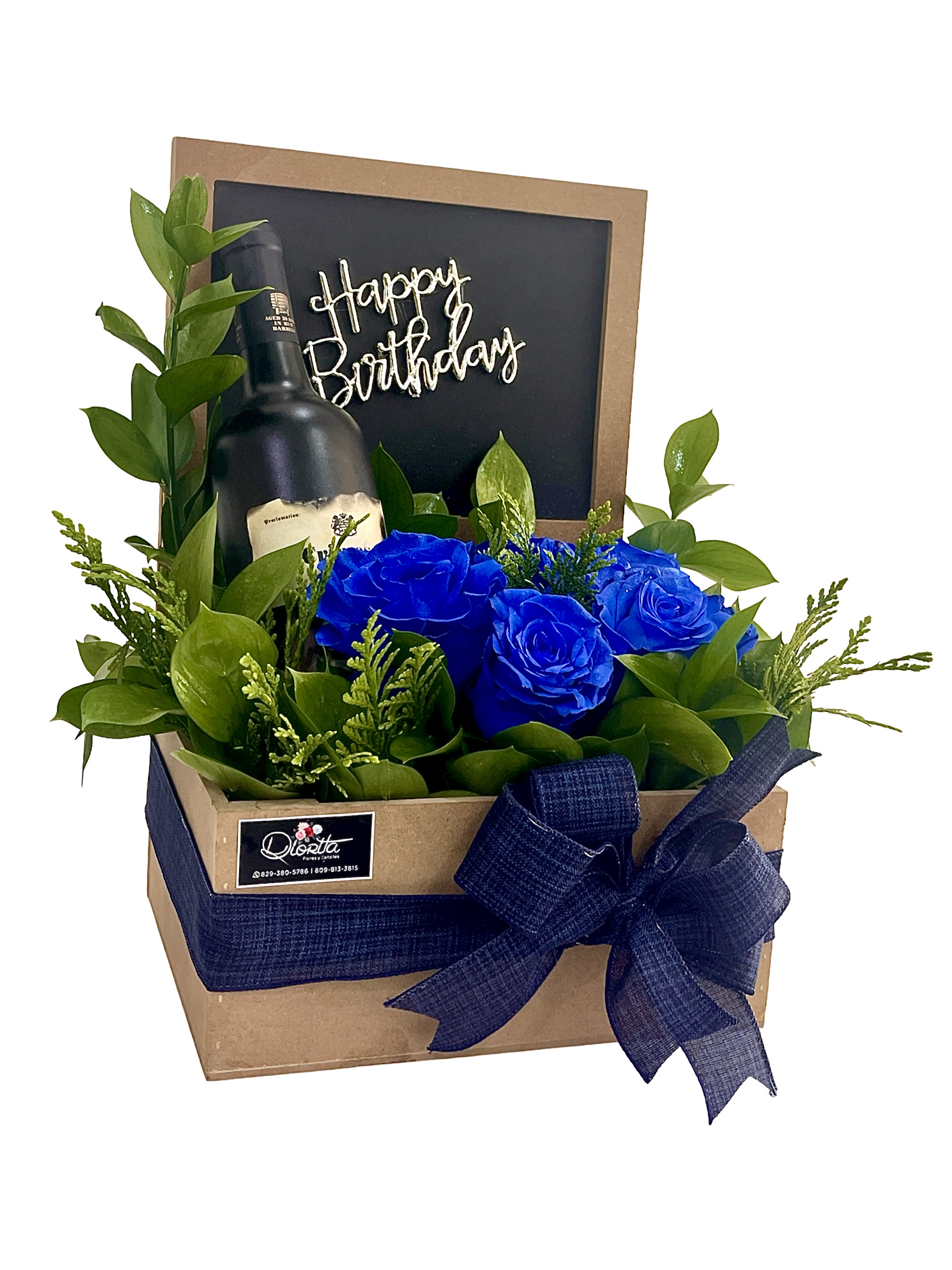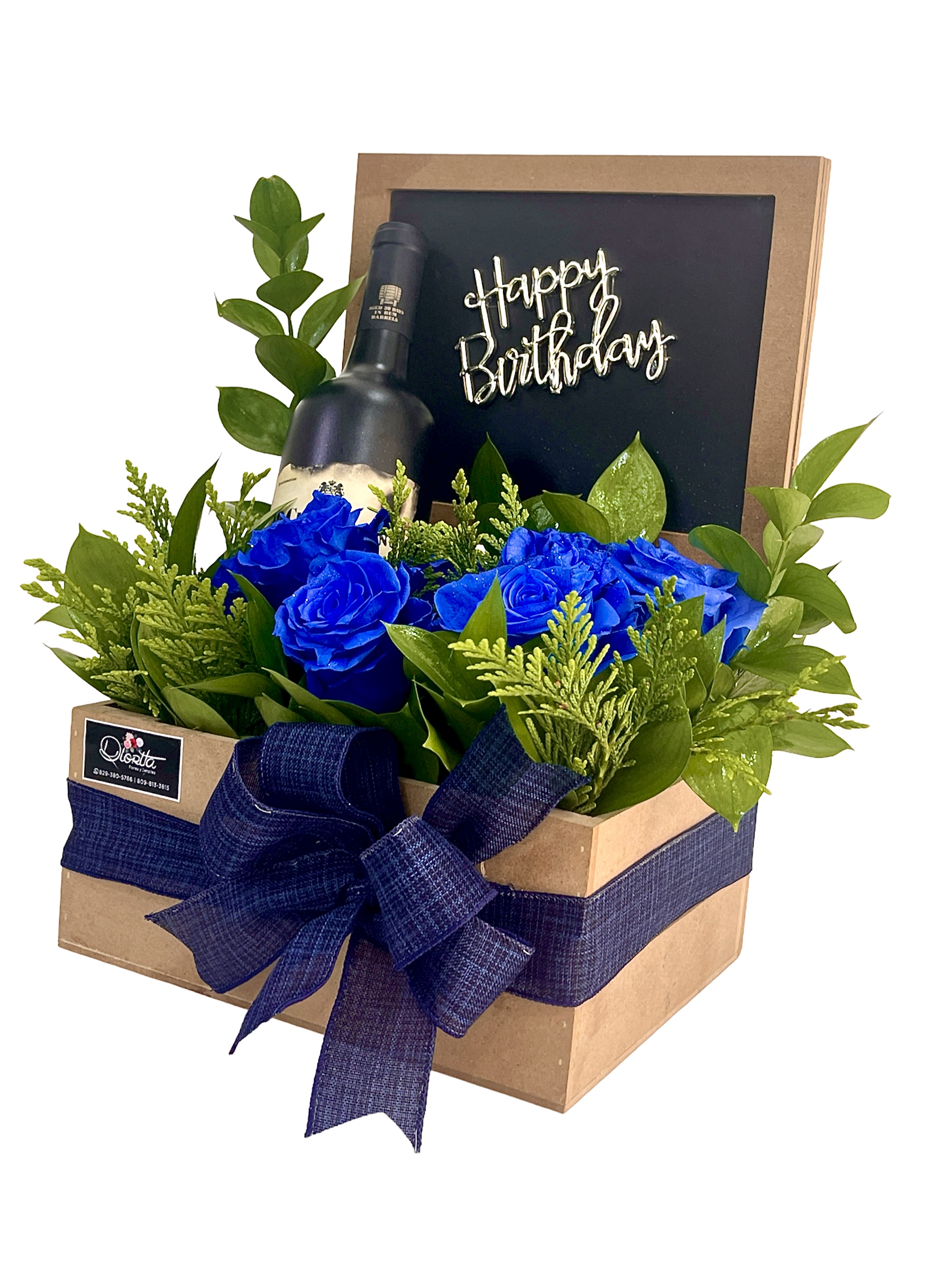 Sorprende con estilo con un arreglo en caja de madera con pizarra personalizable, rosas frescas, ruscus, pino manzano y una exquisita botella de vino 19 Crimes. Un detalle único con tu mensaje especial.»
