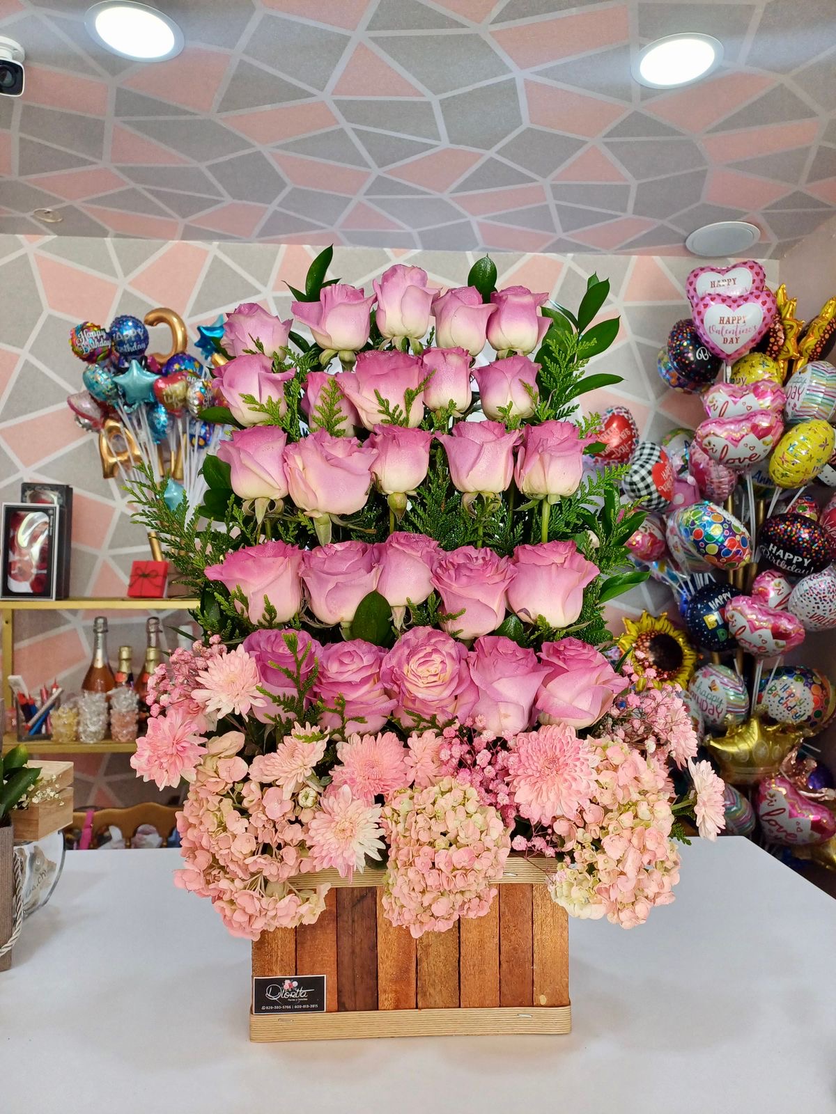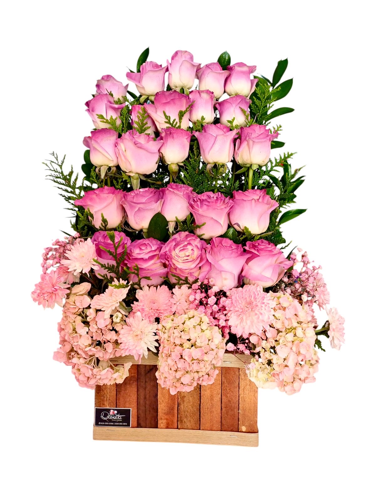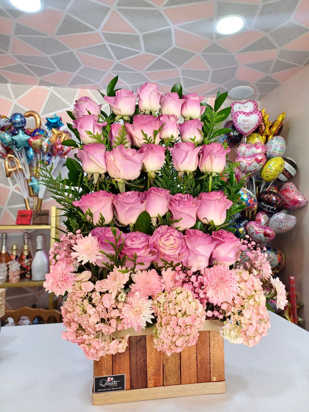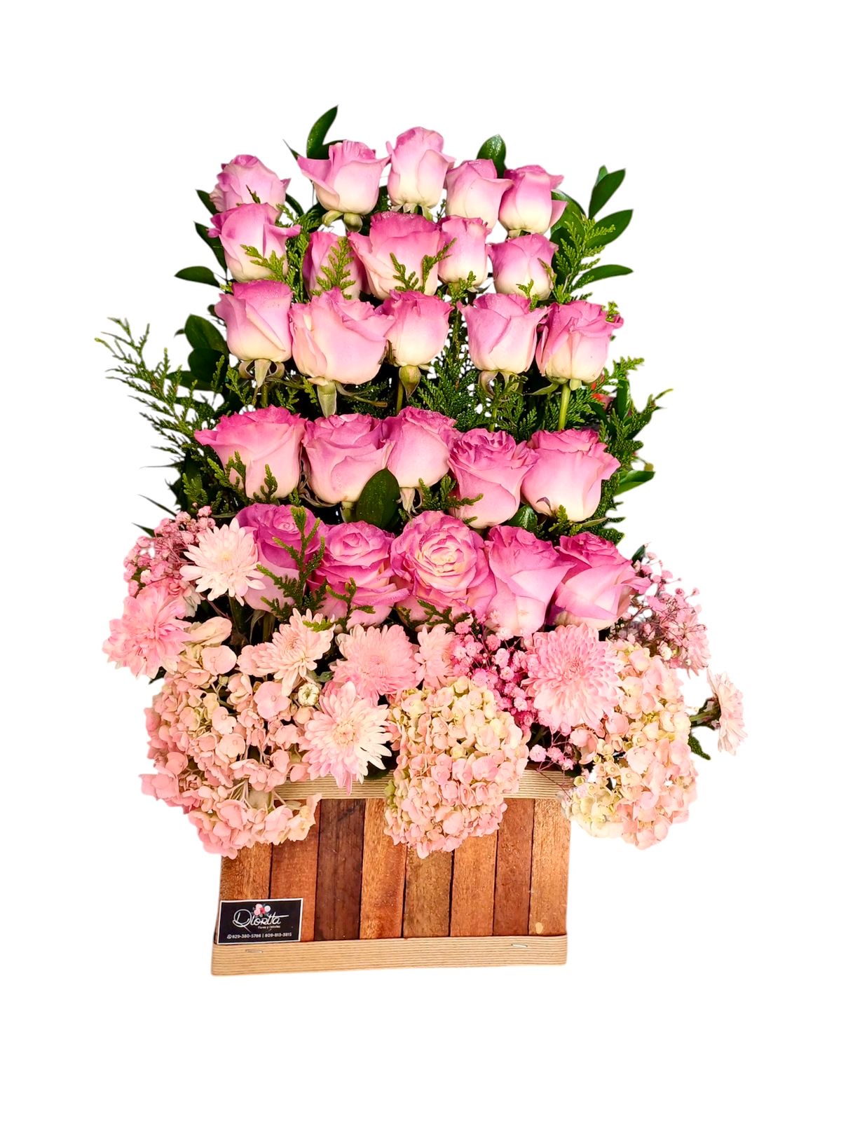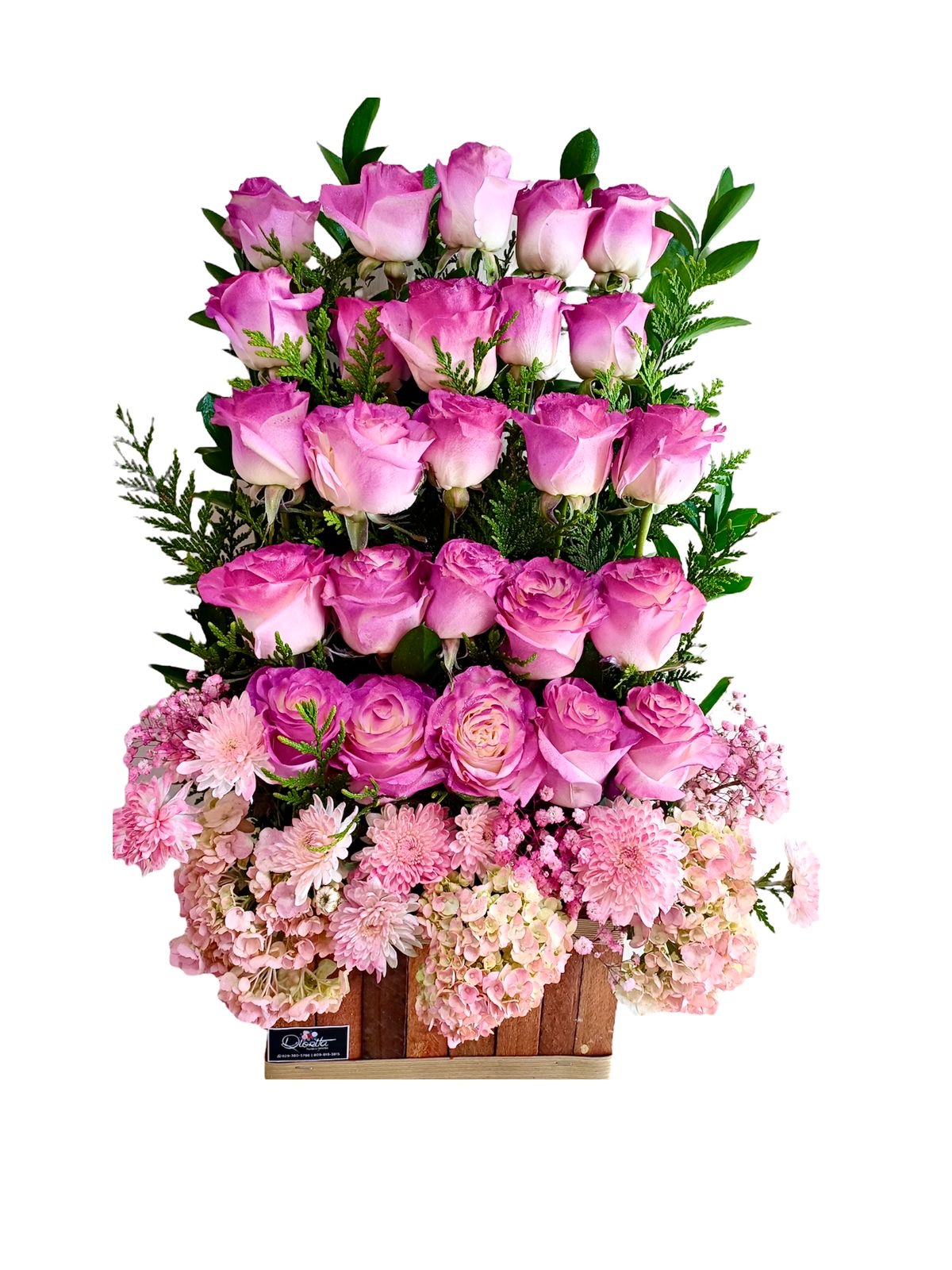 25 rosas, ruscu, pino, pompones, hortensias, baby breath