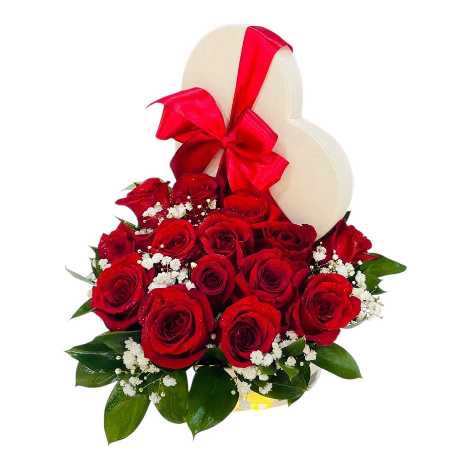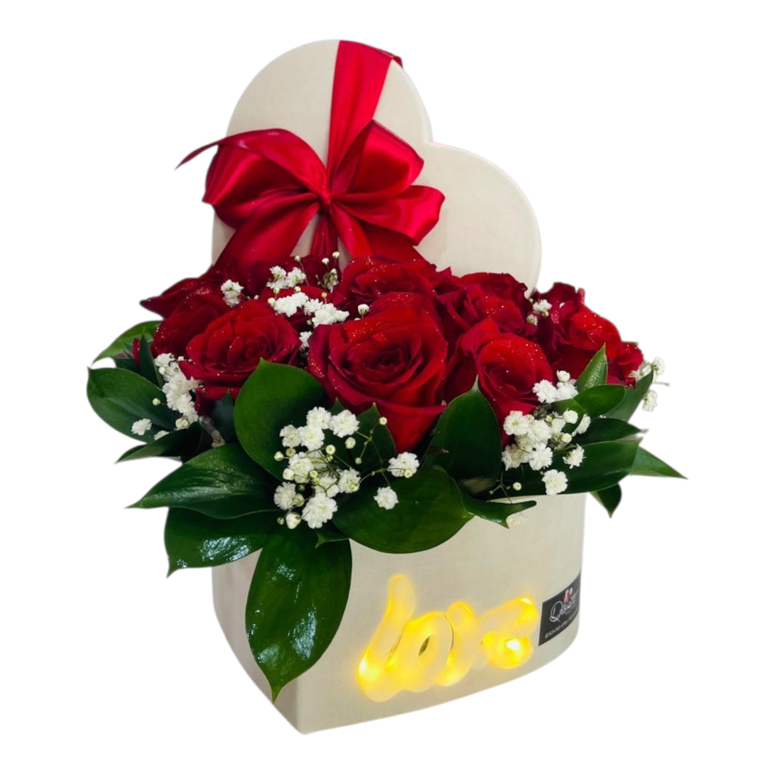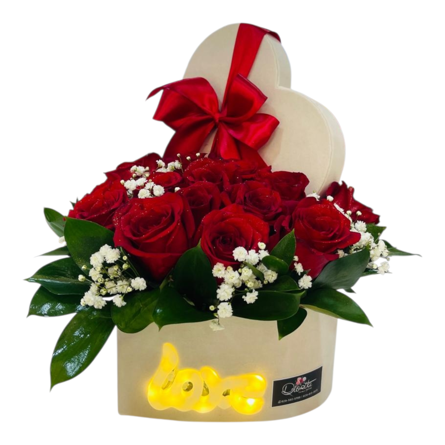 Regala amor en cada detalle. Arreglo floral en caja corazón, diseñado para emocionar desde el primer vista.