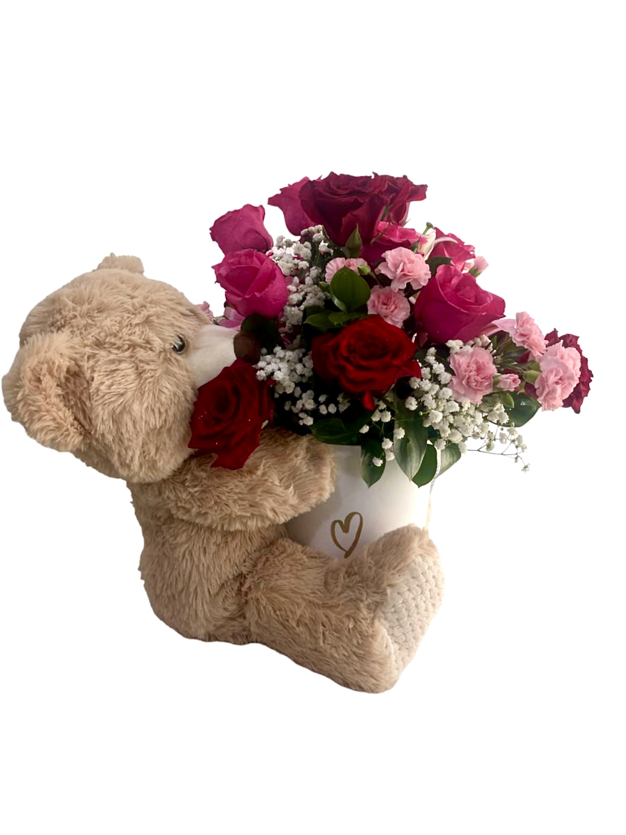 Arreglo con Osito abrazando caja forma florero surtido de 15 rosas combinadas con claveles y baby breath.