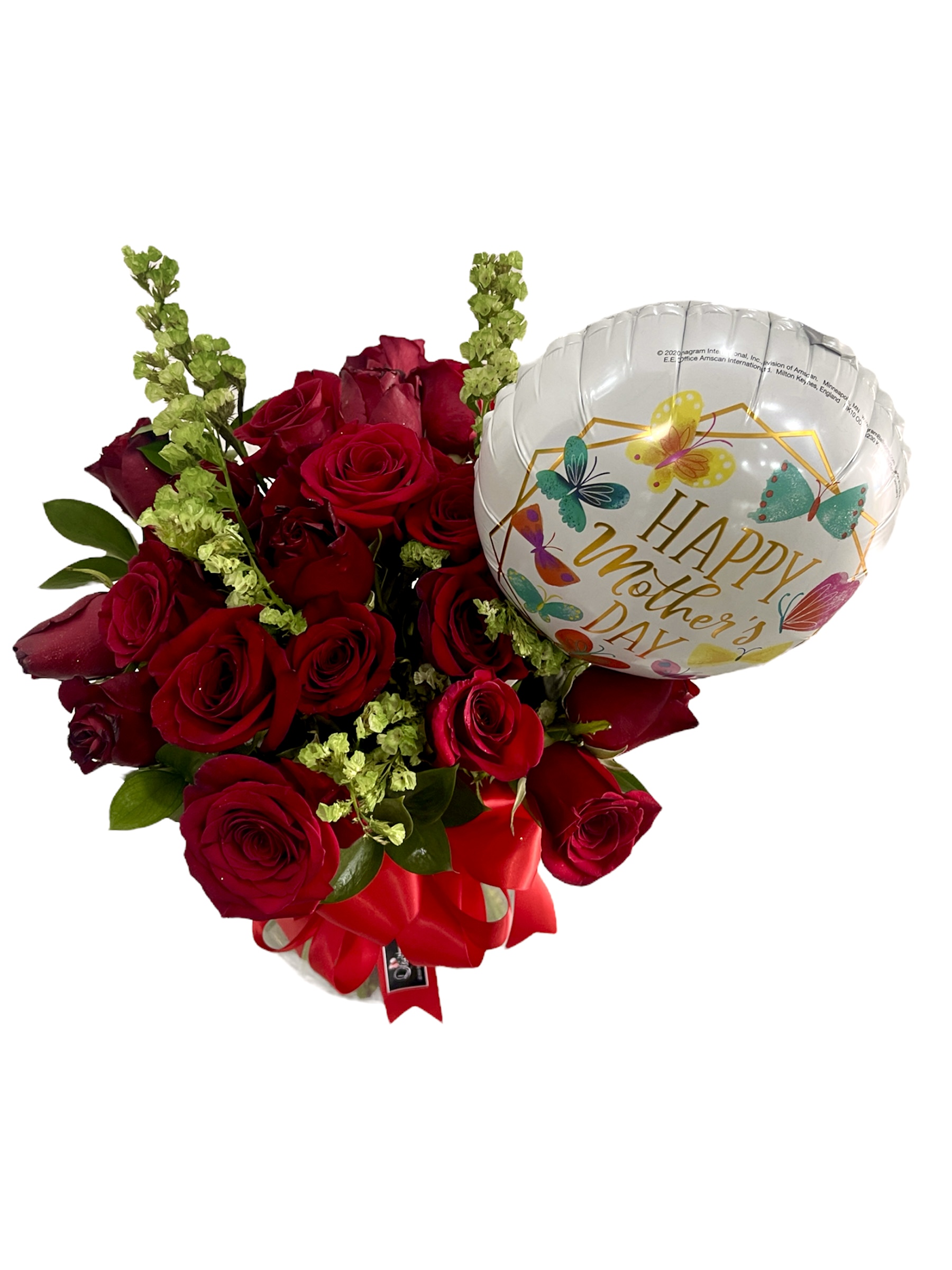 Arreglo en florero de cristal transparente surtido de 24 rosas, estatice y ruscus. Lazo elegante variable según petición del cliente.
