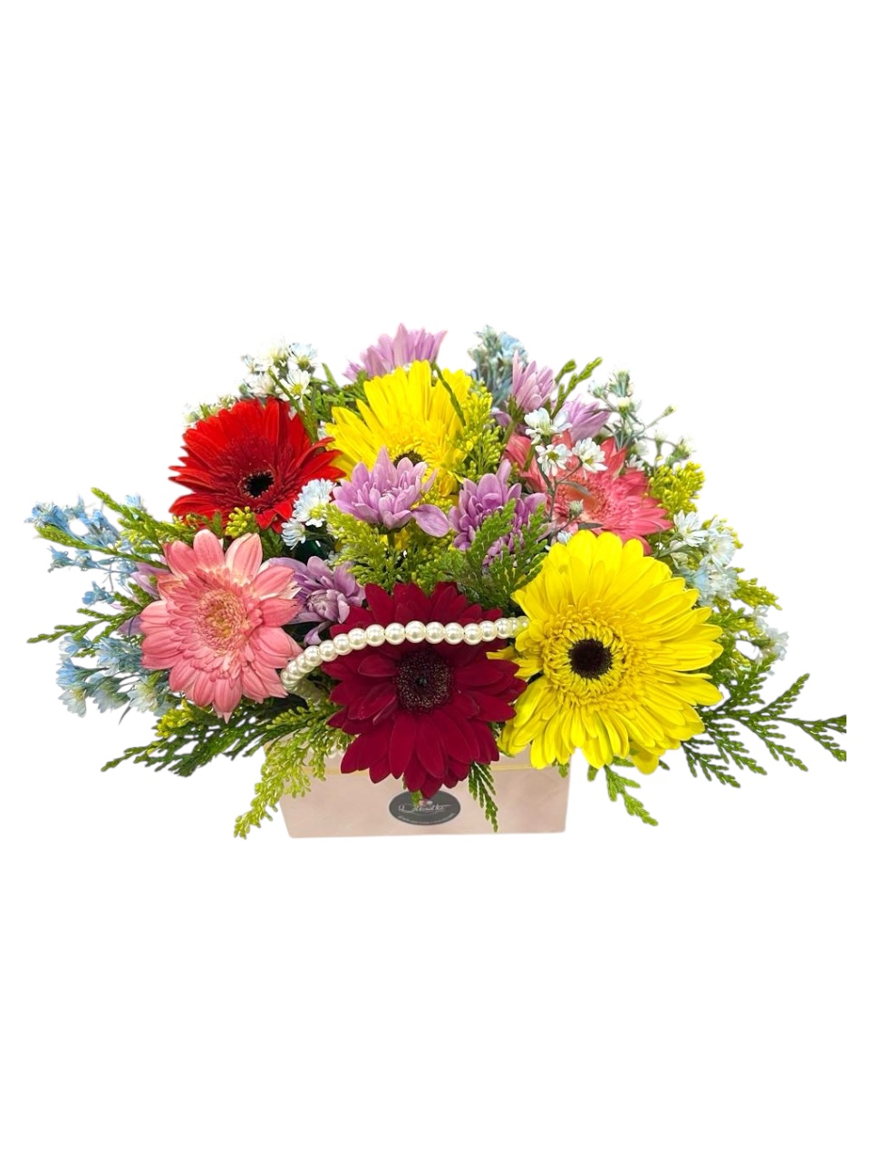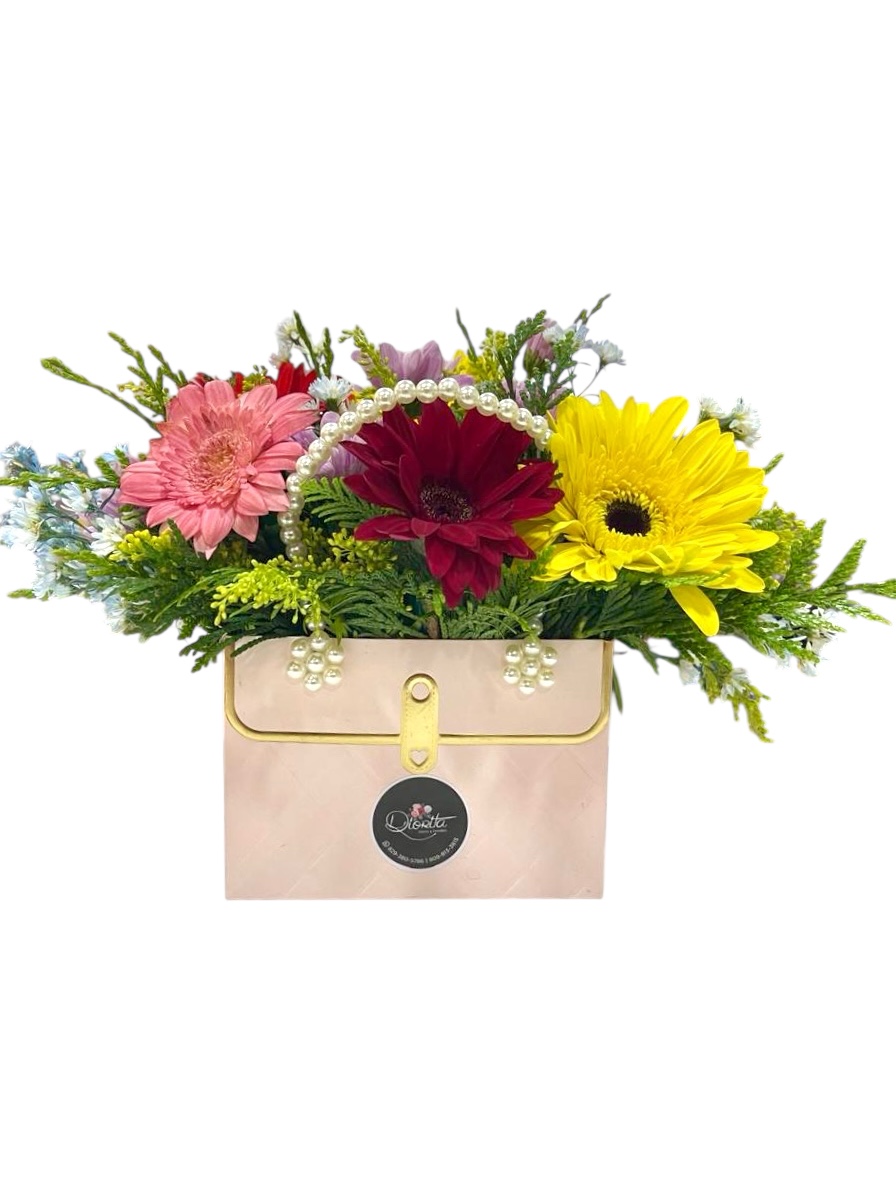 Un elegante bolso floral con asa de perlas y gerberas en tonos vibrantes. Un regalo alegre, femenino y sofisticado para celebrar con estilo.