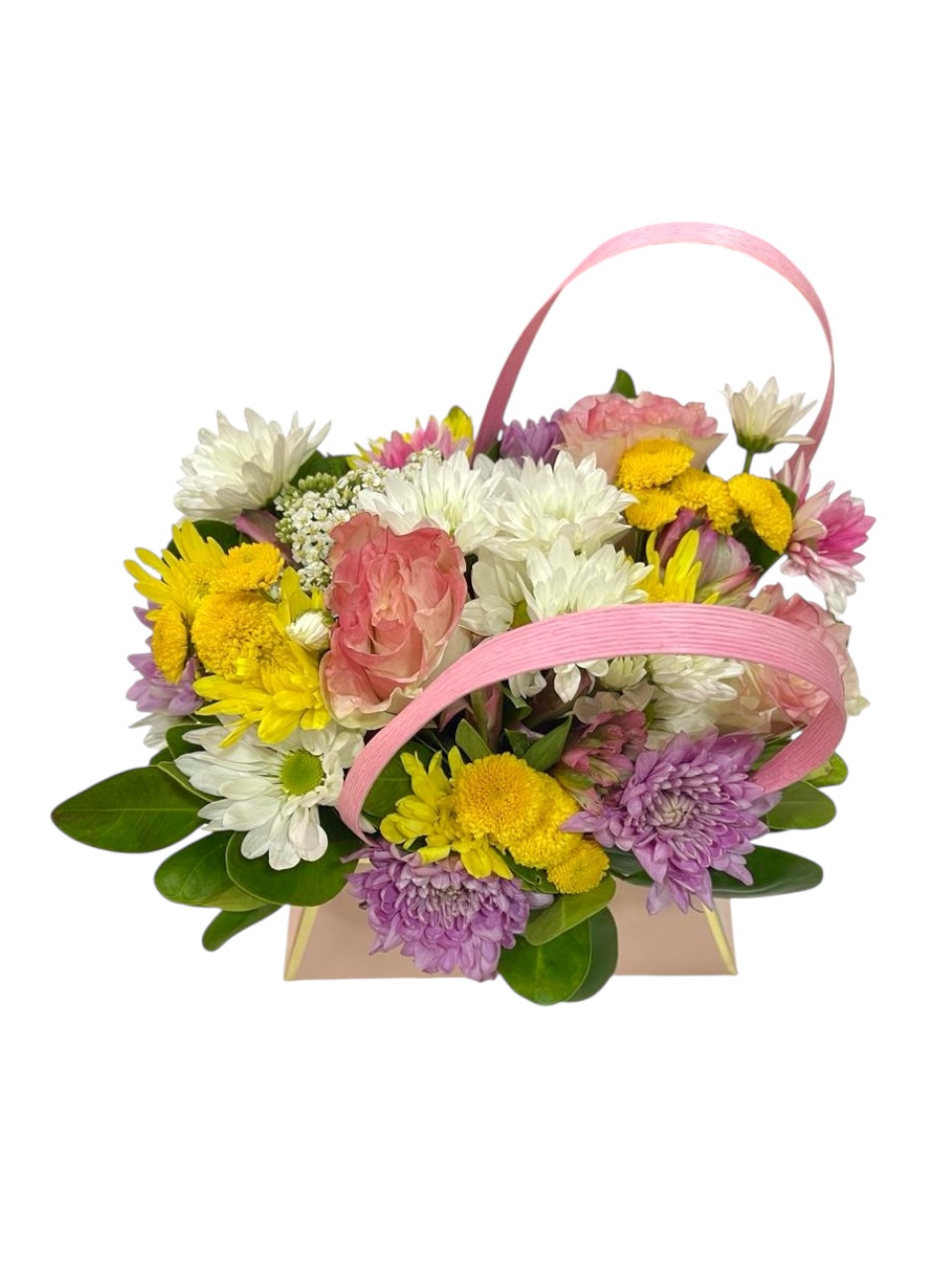 Un delicado bolso floral con flores en tonos suaves y vibrantes, ideal para alegrar el día con un detalle lleno de ternura, color y estilo.