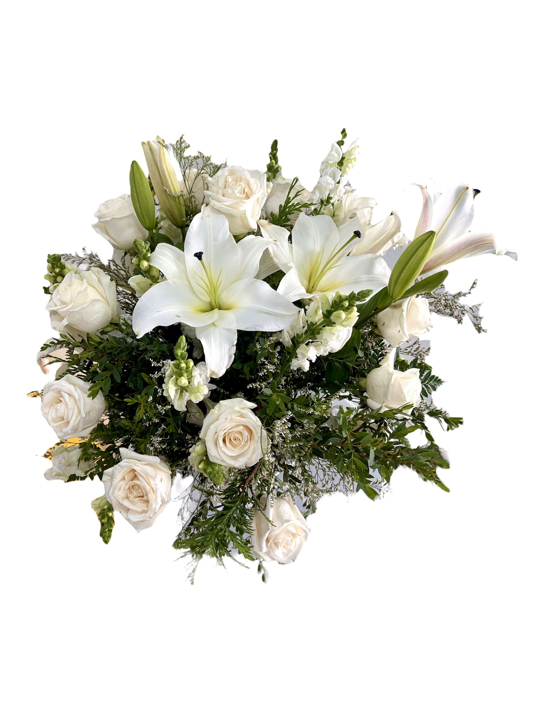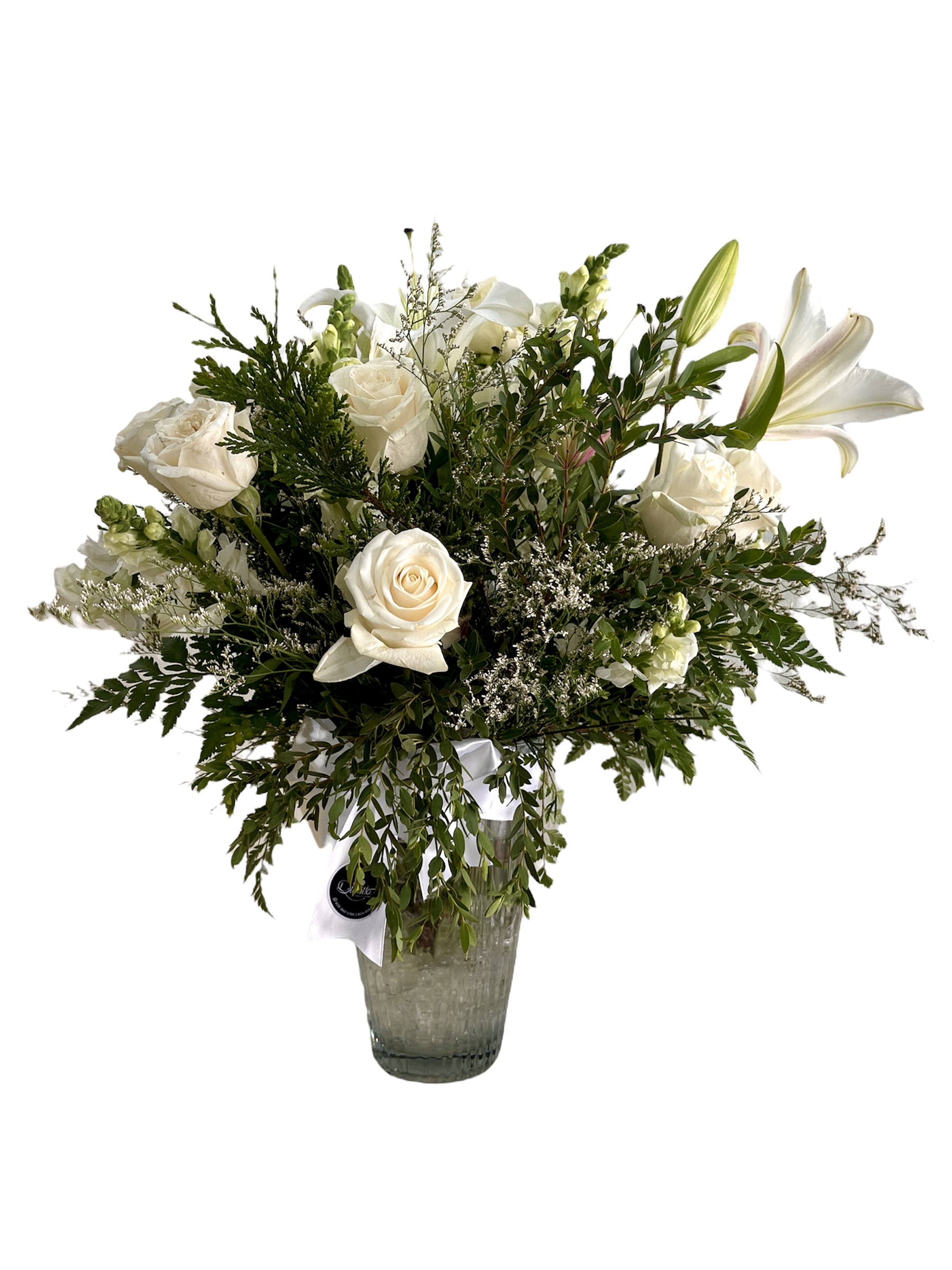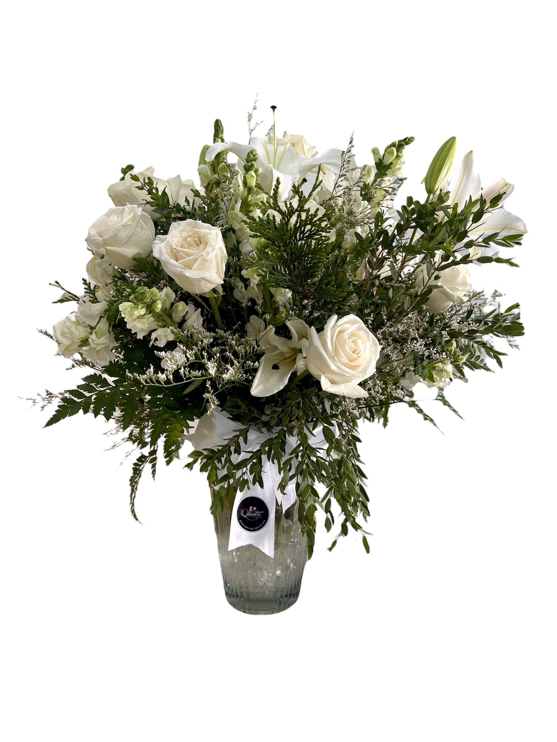 Base Florero cristal surtido de rosas y lirios blancos con detalles de ruscus eucalipto mini. Lazo decorativo variable según gusto del cliente.