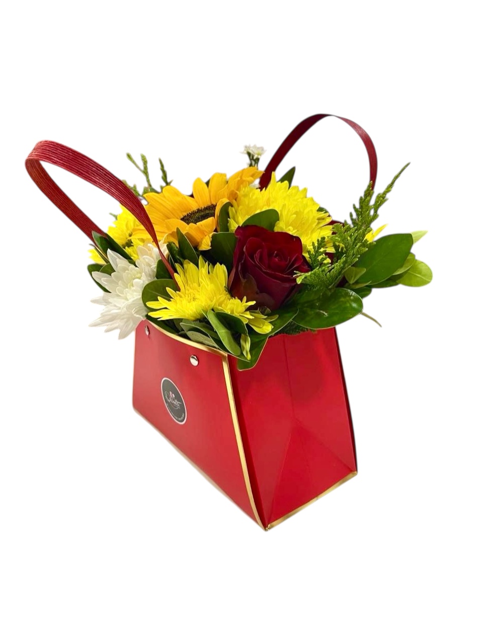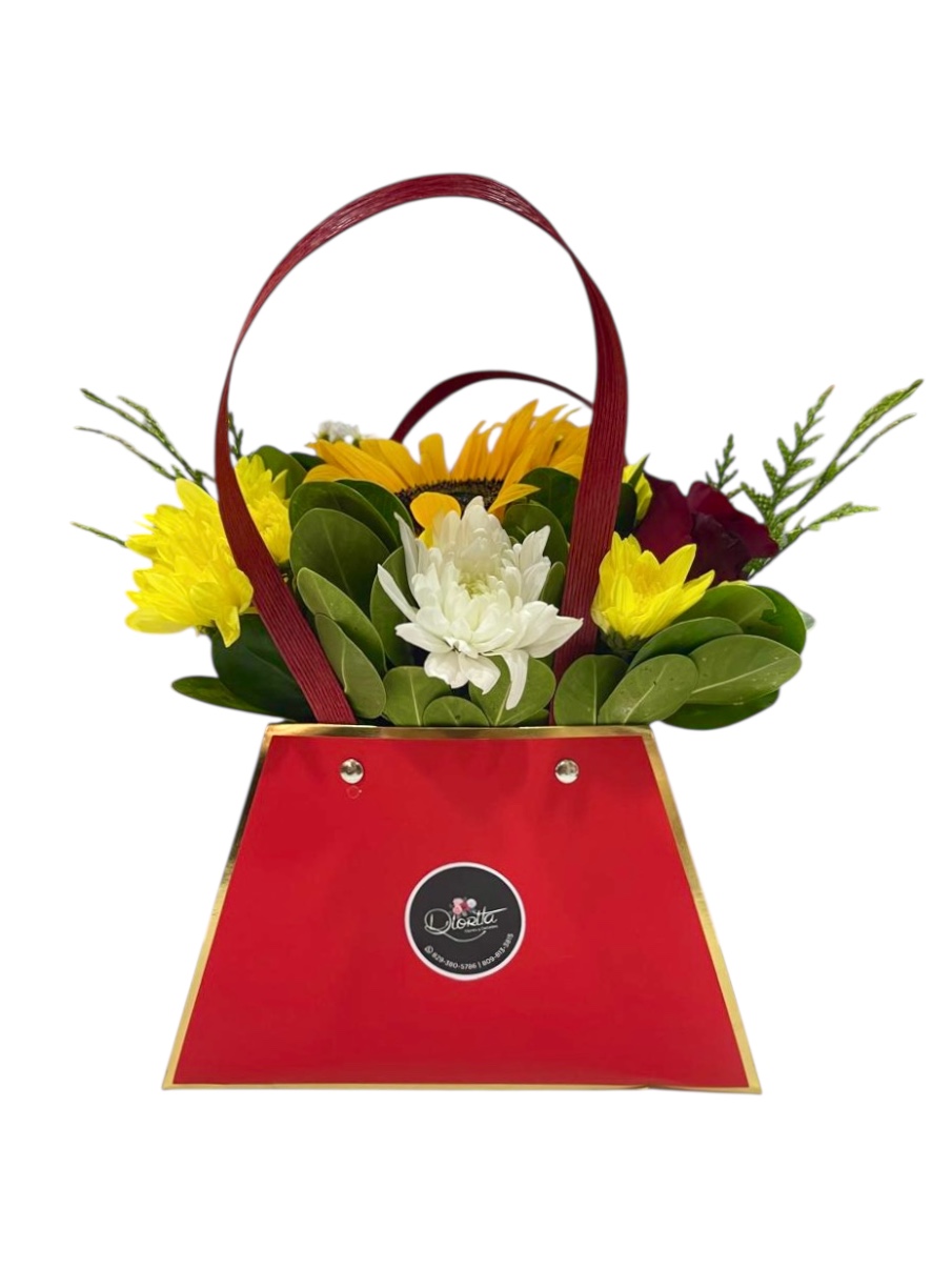 Un bolso floral con flores radiantes y un toque de elegancia. Su empaque rojo vibrante y girasol central lo hacen ideal para sorprender con fuerza, alegría y color.