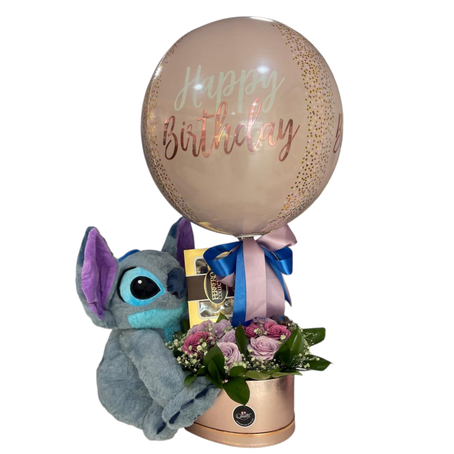 Diversión, ternura y mucho amor en un solo regalo. Ideal para sorprender con Stitch, rosas eternas y Ferrero en un cumpleaños especial.