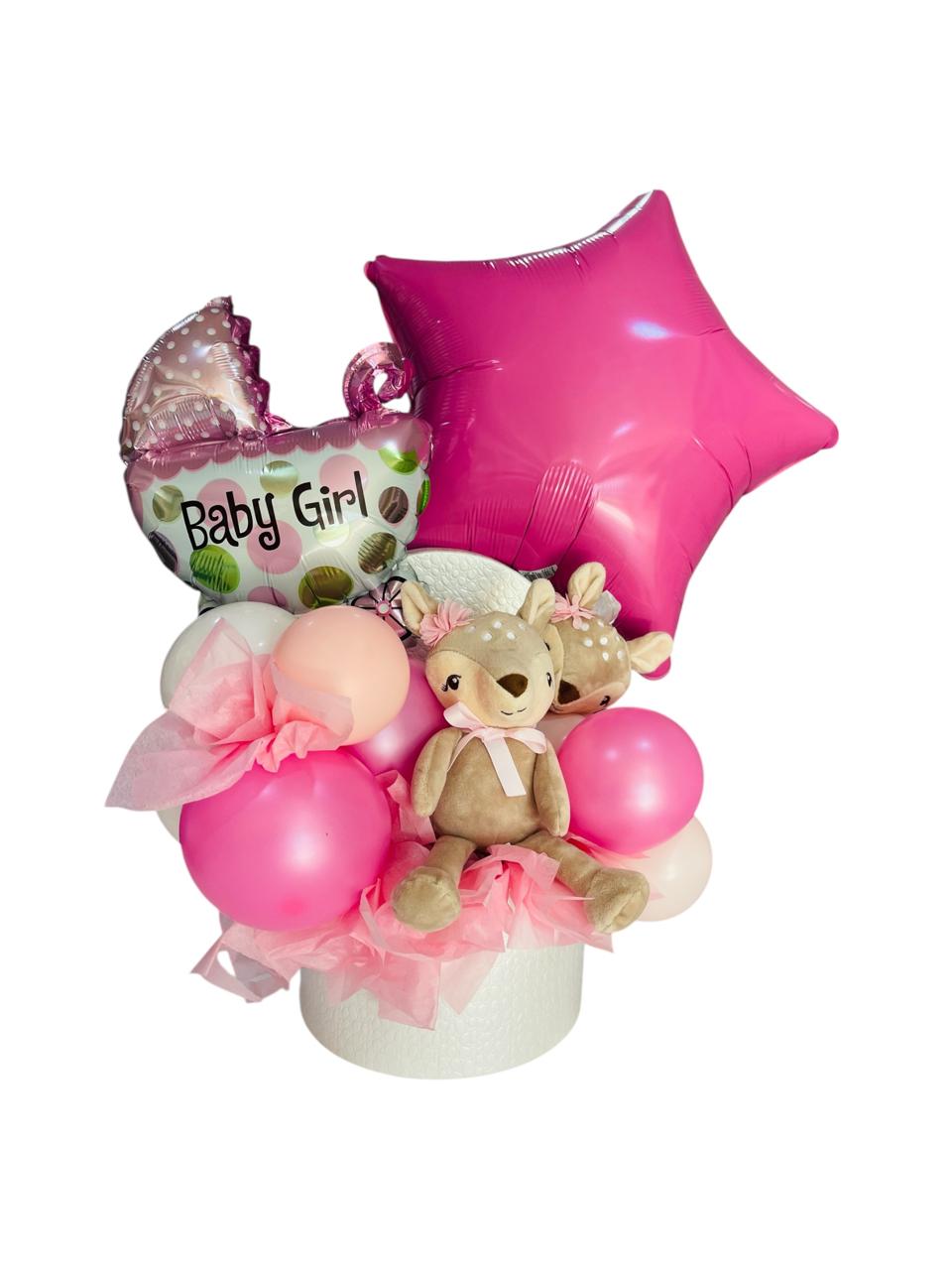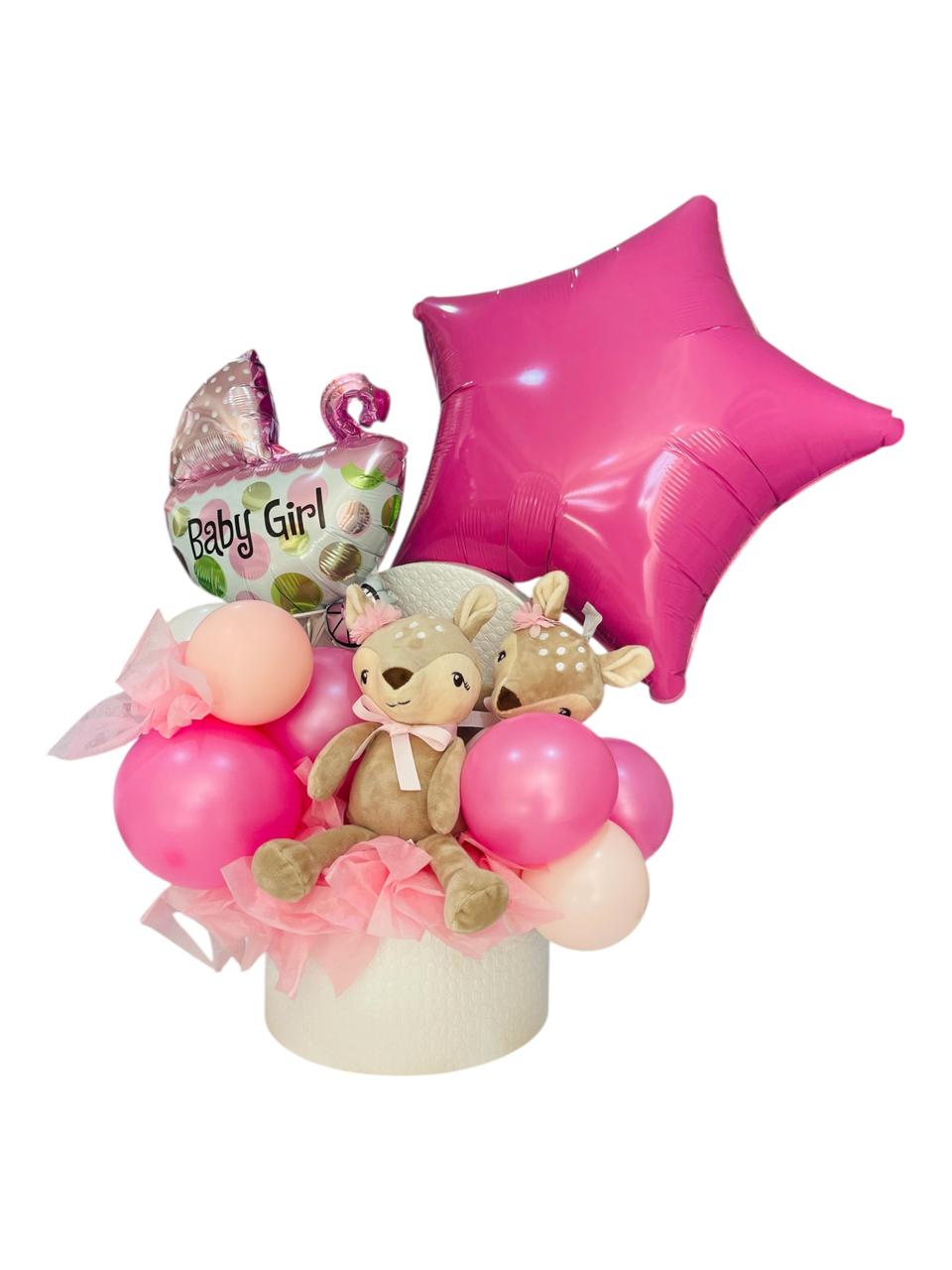 Celebra la llegada de una hermosa bebé con este encantador arreglo de globos en tonos rosados, peluches y un gran globo estrella.