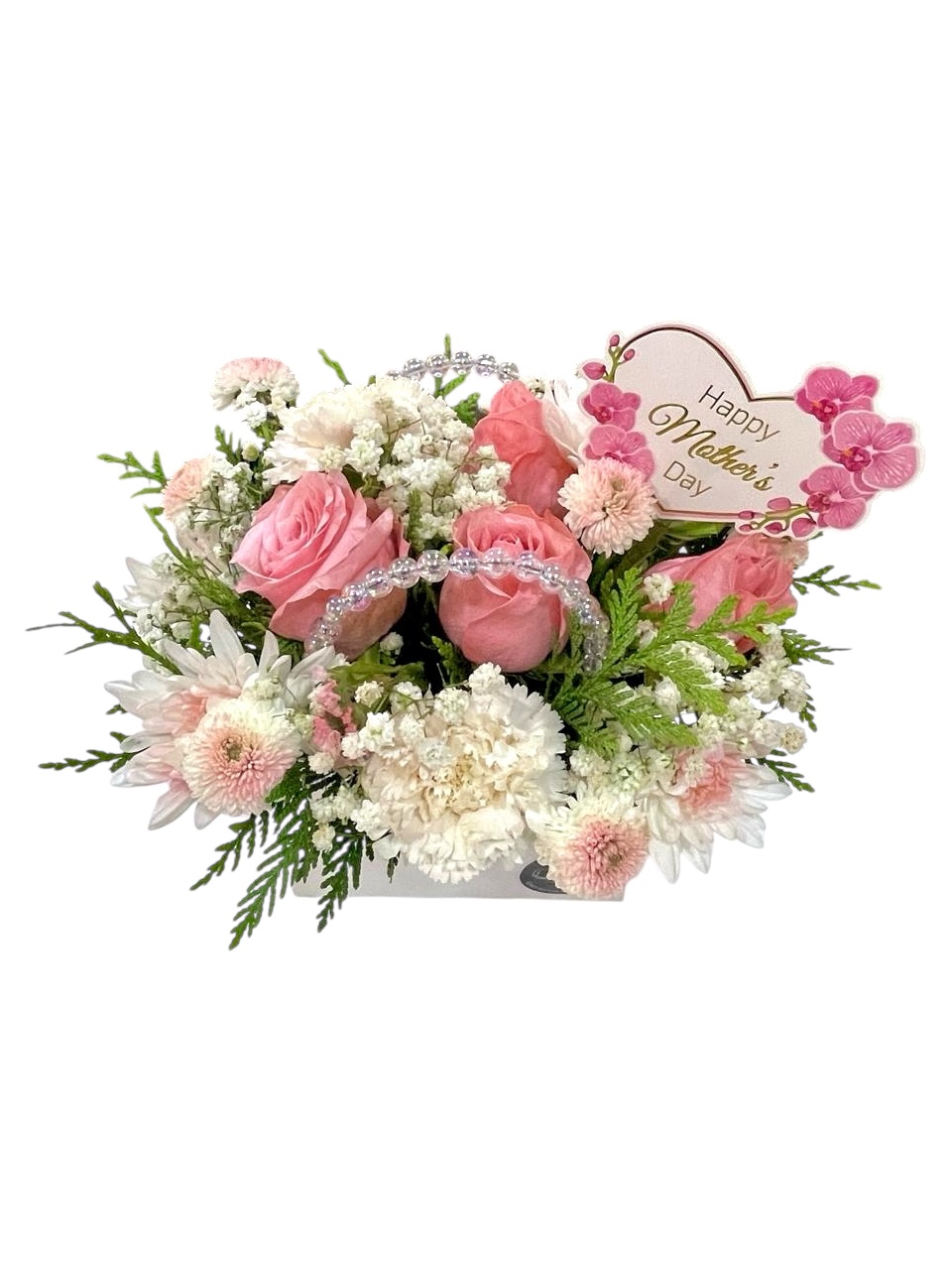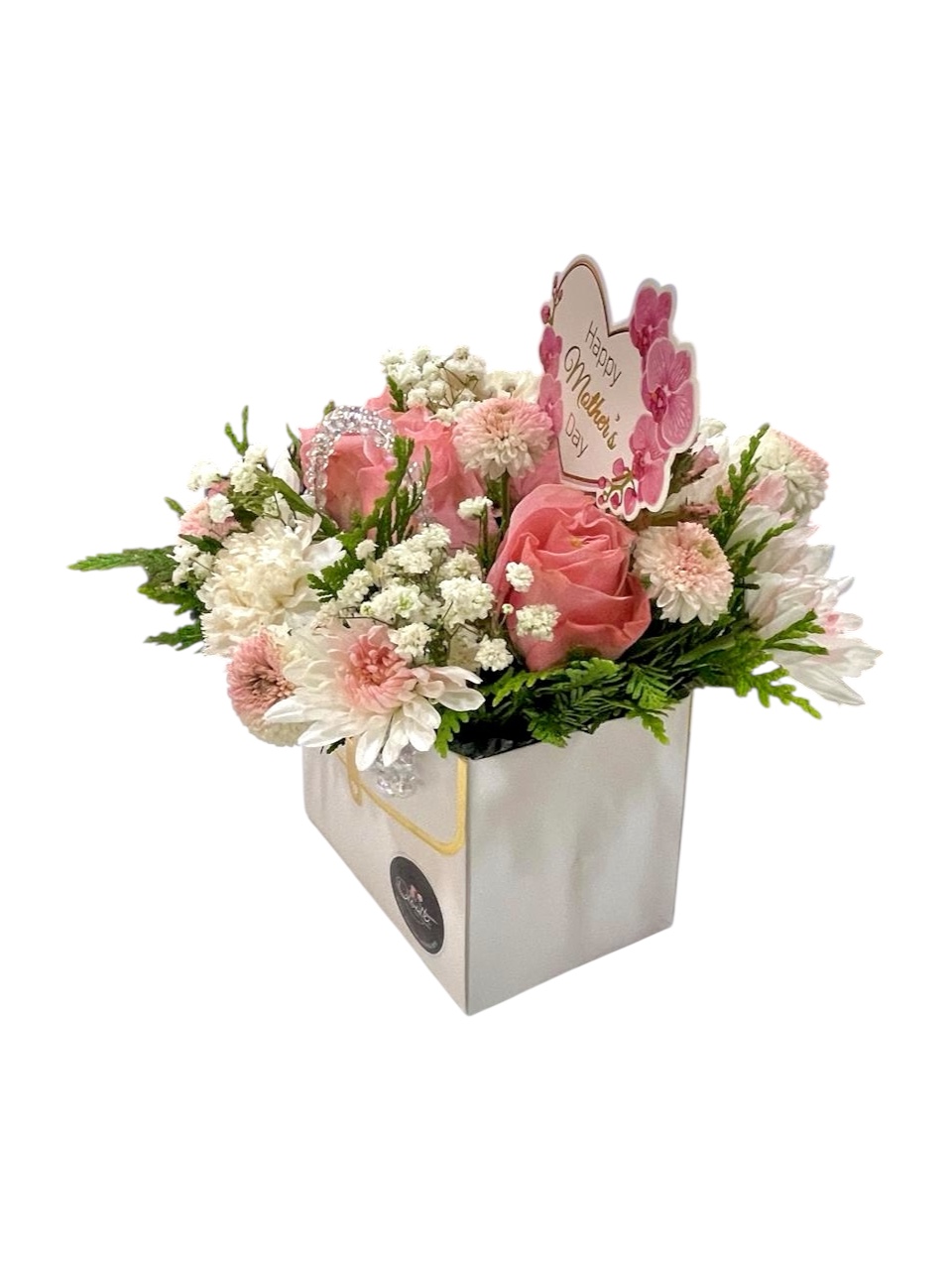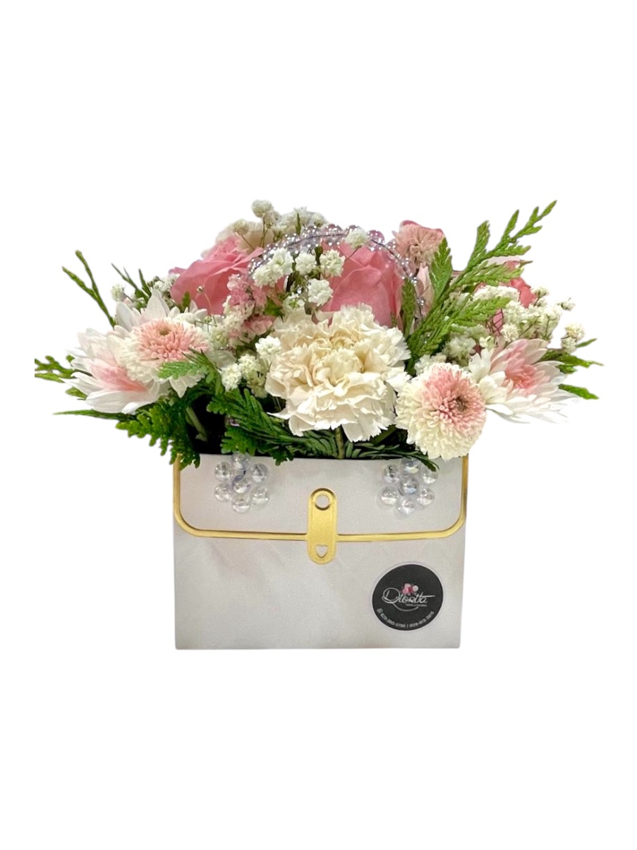 Bolso floral con flores en tonos suaves y detalles de perlas. Ideal para regalar elegancia y dulzura en una presentación romántica y sofisticada.