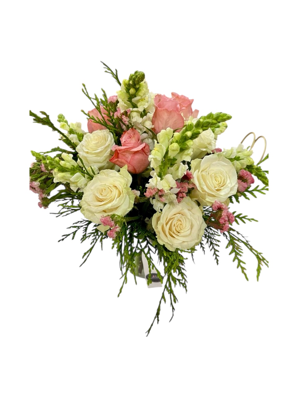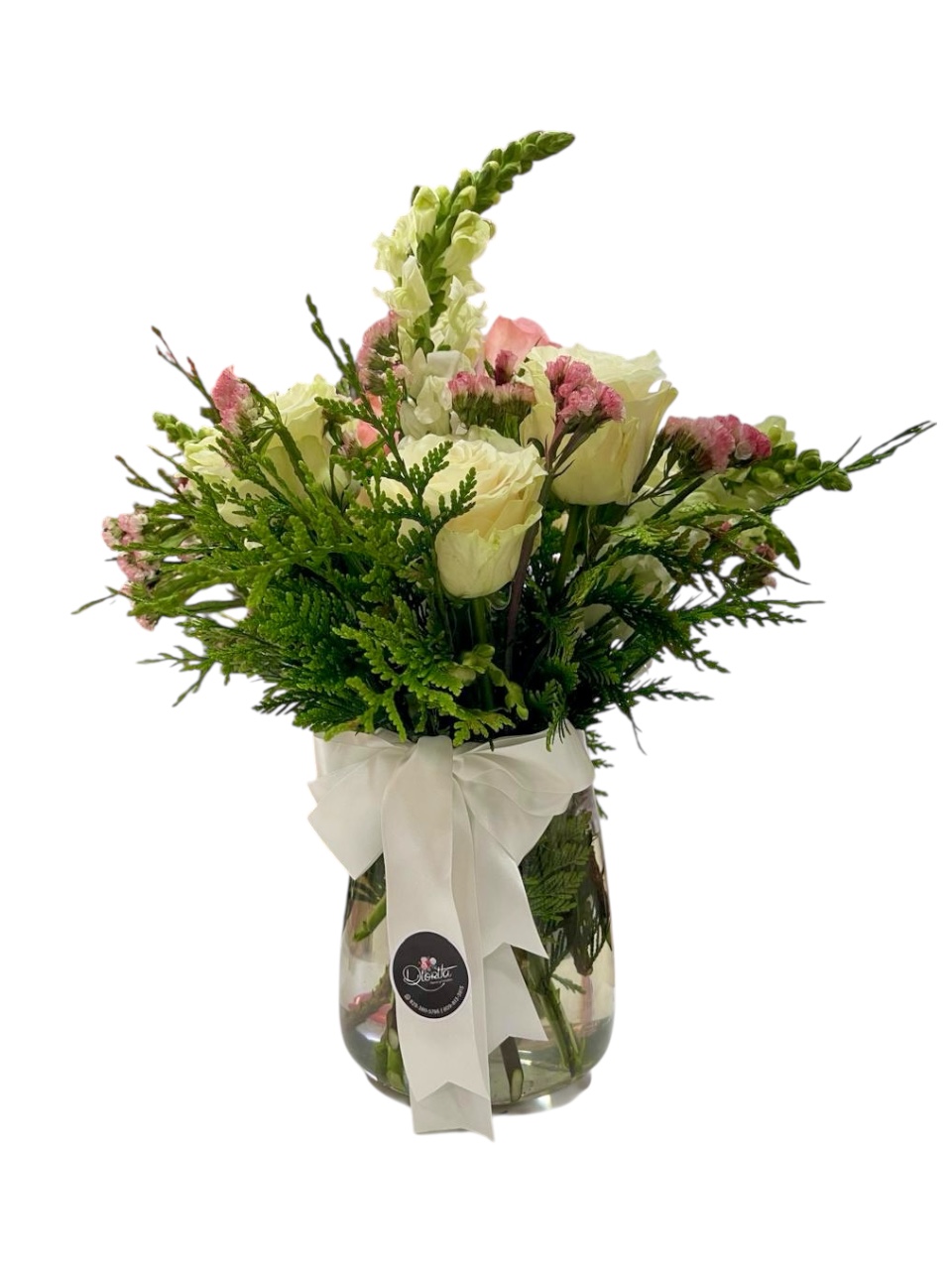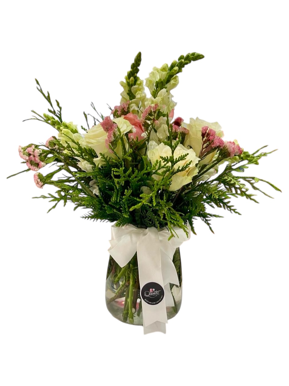 Arreglo floral en tonos blancos y rosados en florero de cristal con lazo elegante. Un detalle sobrio y hermoso que transmite paz, cariño y respeto en cualquier ocasión especial.