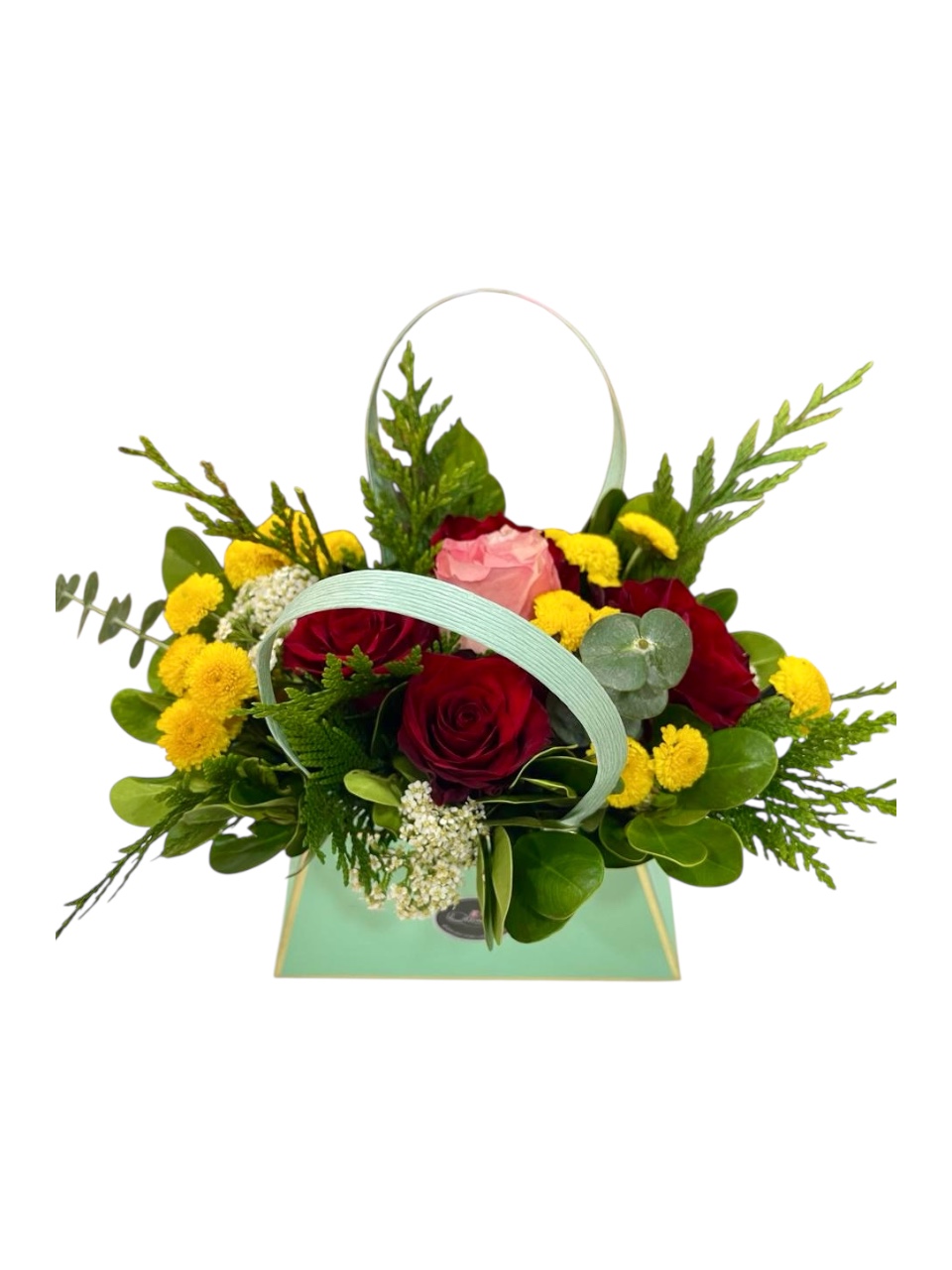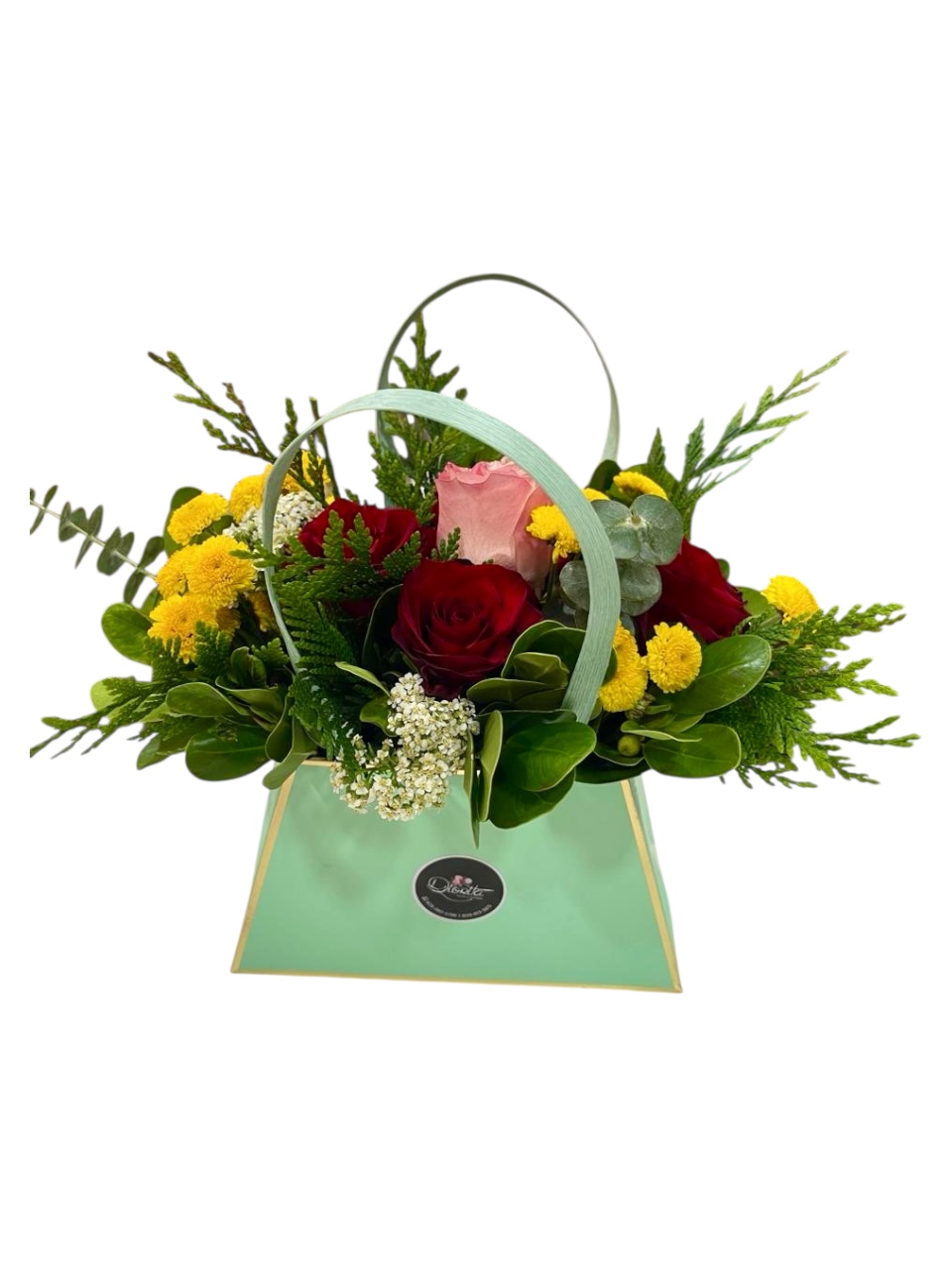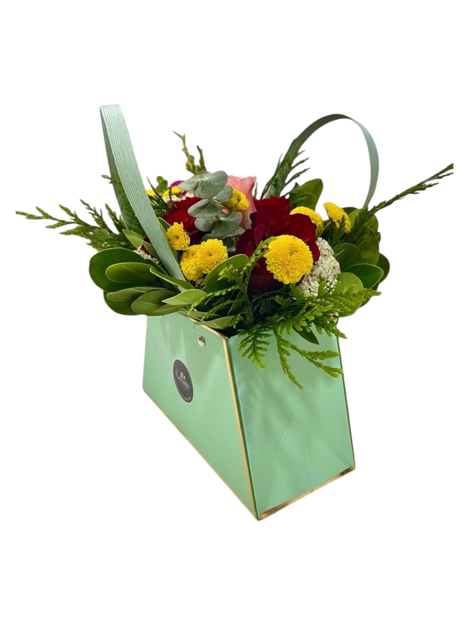 Bolso floral en tono menta con rosas y flores mixtas en colores vibrantes. Un detalle fresco, moderno y lleno de energía positiva para cualquier ocasión especial.