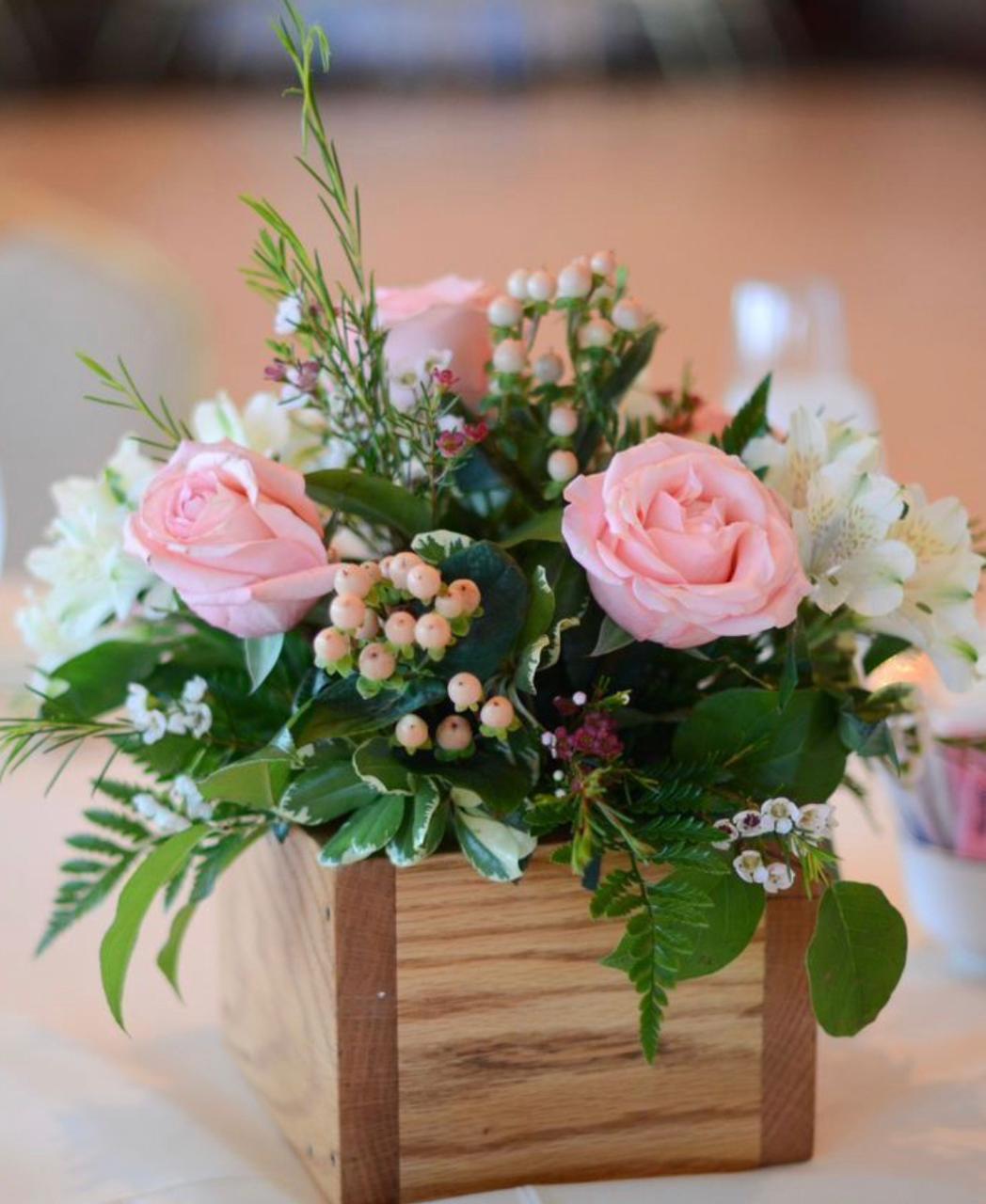 Rosas importadas hipérico y alstromerias blancas en base macetero de madera.