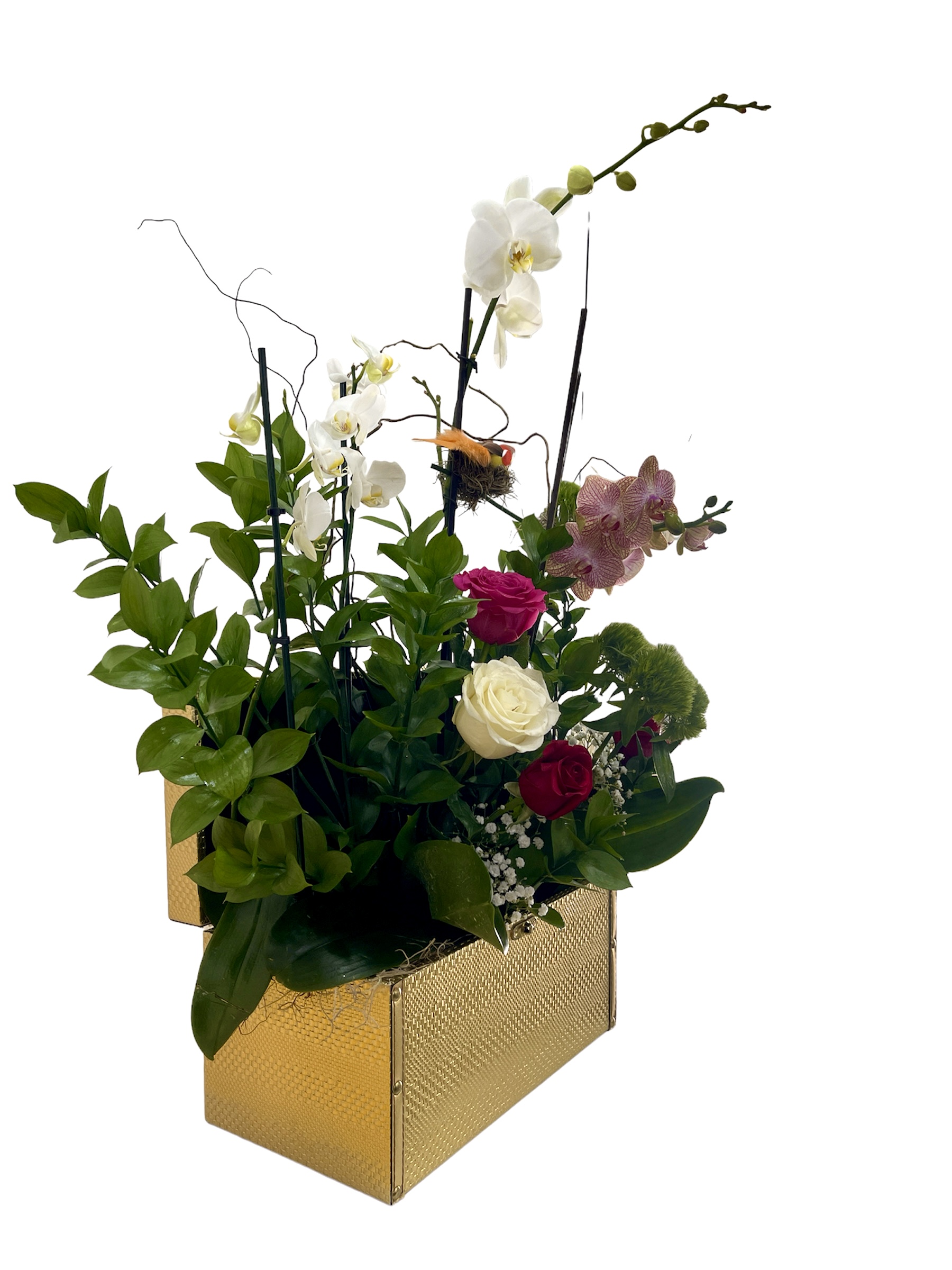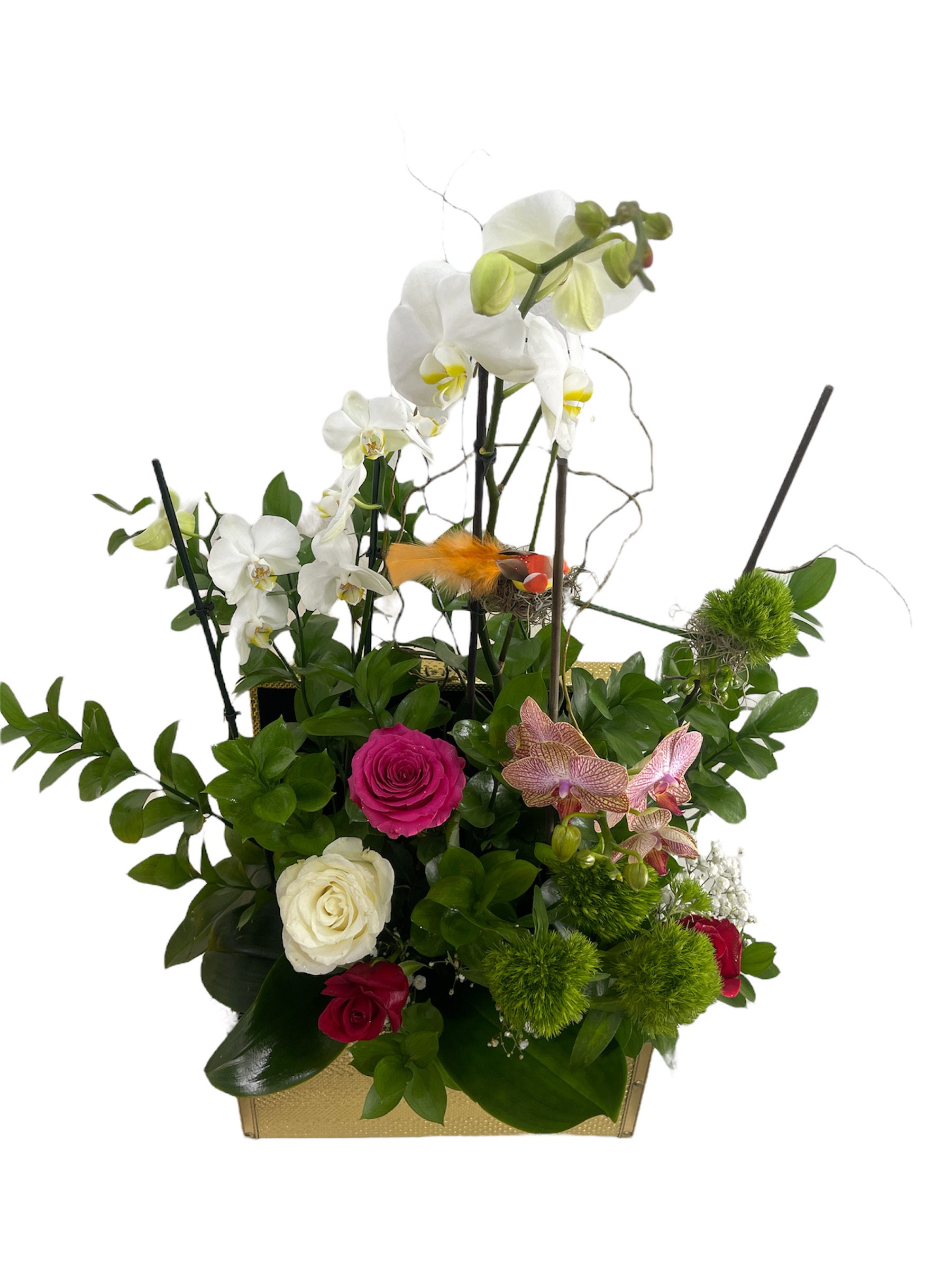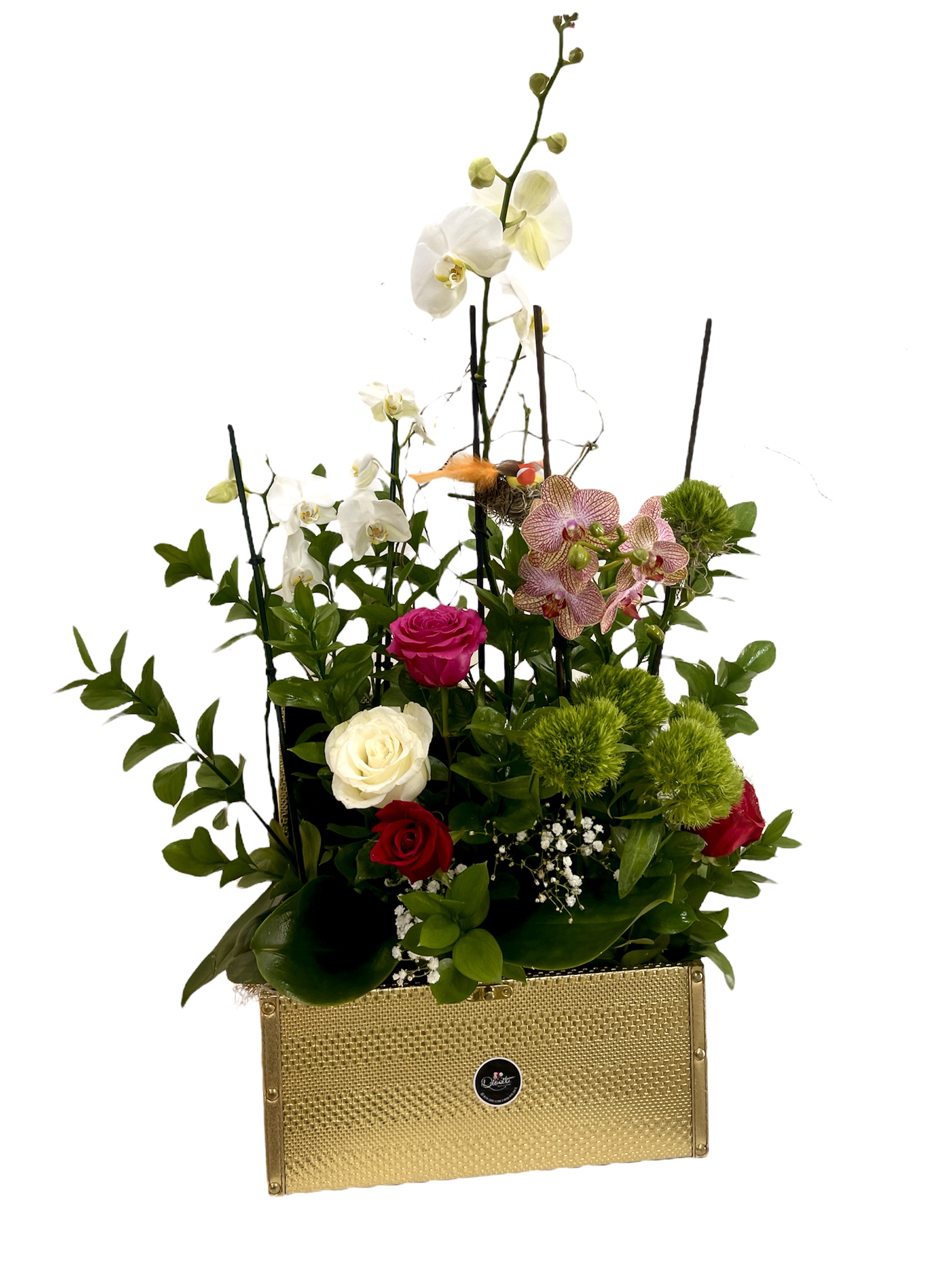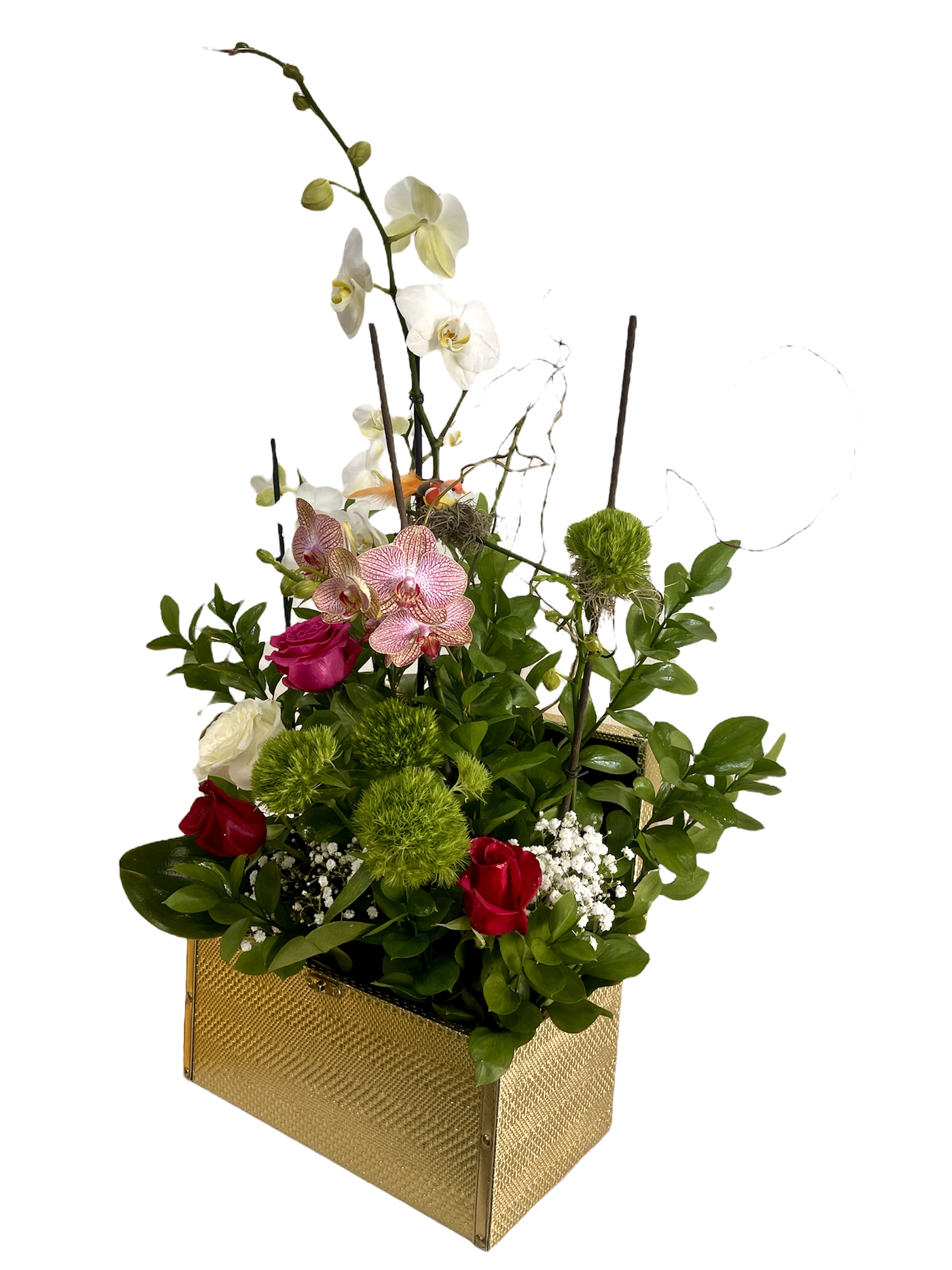 Baúl color madera en tapizado dorado surtida de tres preciosas orquídeas y detalles de geen ball, rosas, baby breath y ruscus.