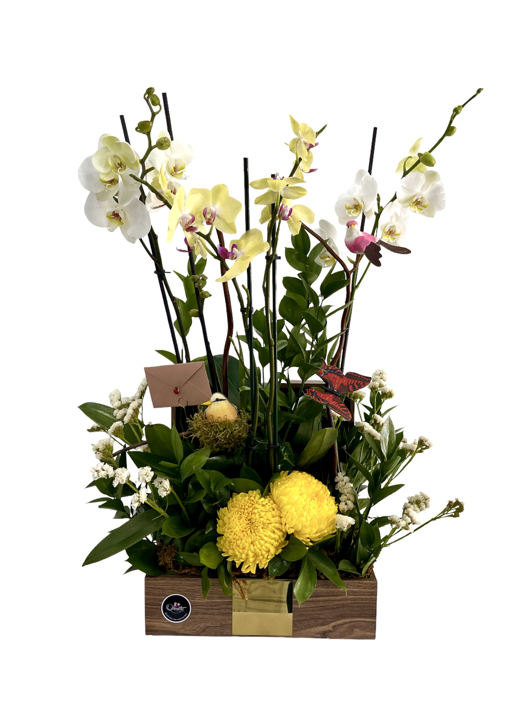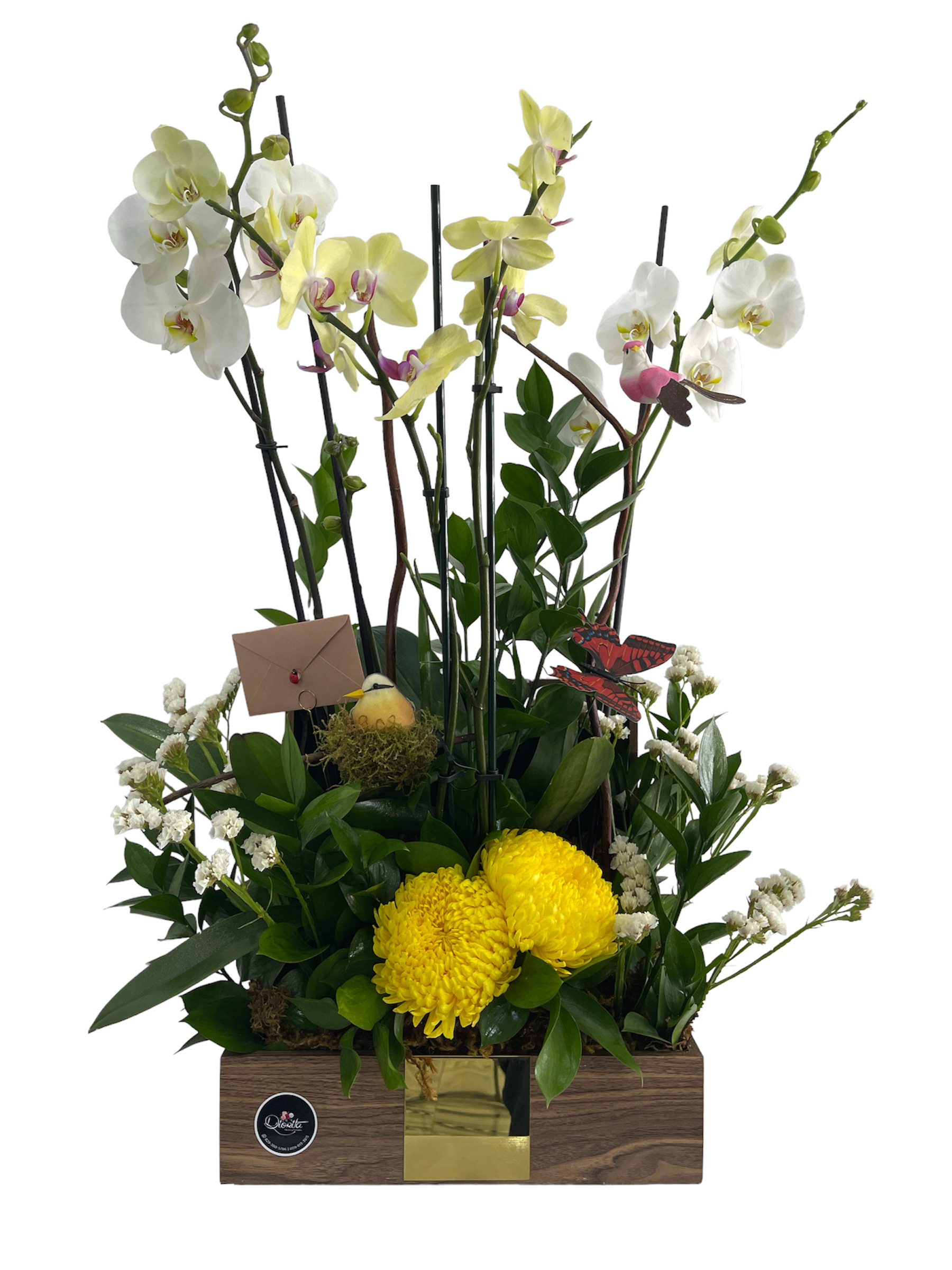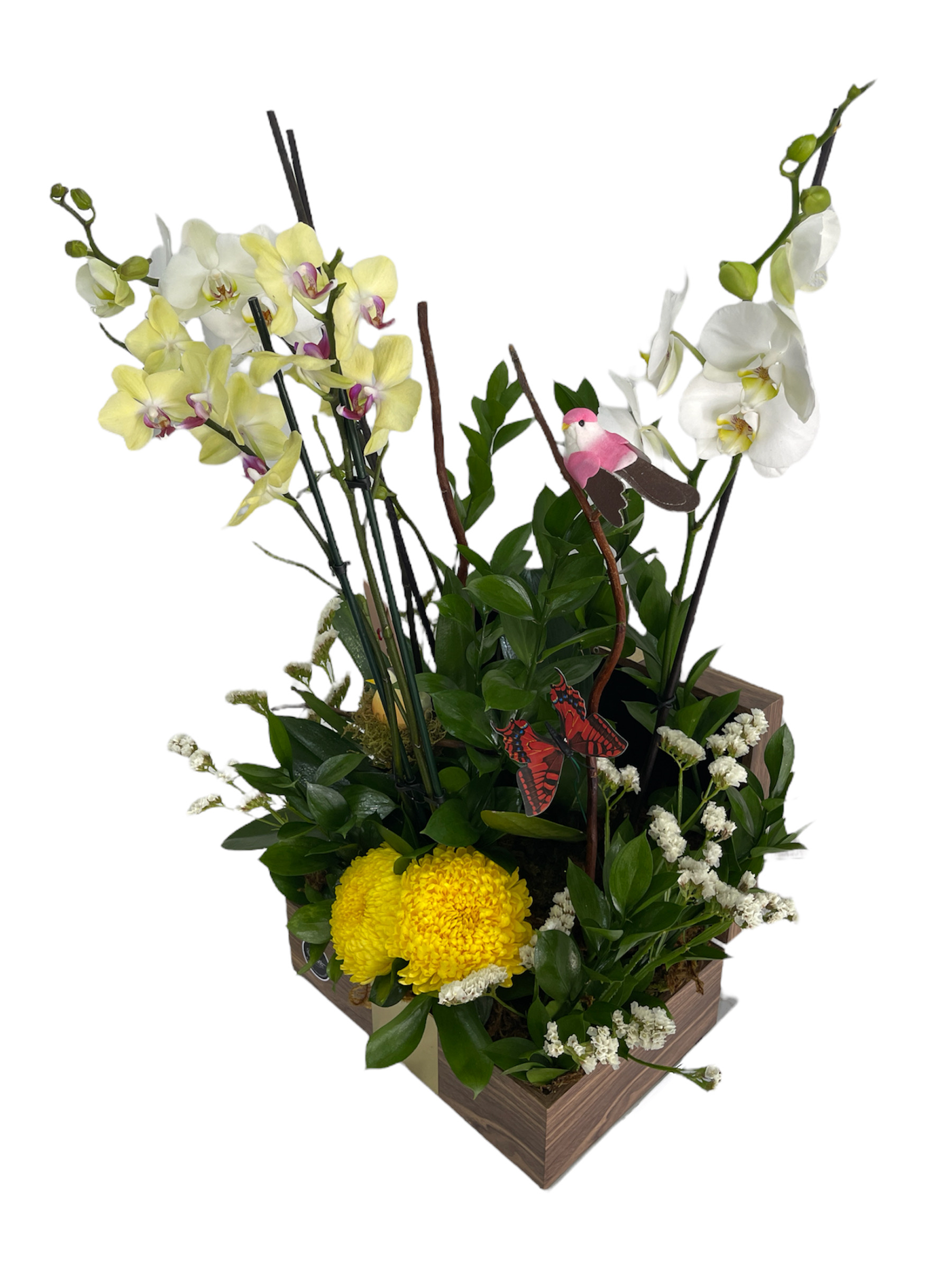 Baúl color madera con surtido de tres hermosas orquídeas y detalles de estatices, ruscus y crisantemos.