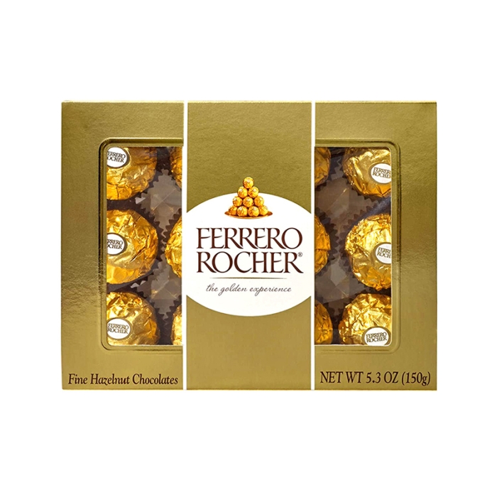 Ferrero Rocher ofrece una experiencia de sabor única de capas contrastantes: una avellana crujiente entera en el corazón, un delicioso relleno cremoso de avellana, una cáscara de oblea crujiente cubierta de chocolate y trozos suavemente tostados. Y gracias a su inimitable envoltorio dorado Ferrero Rocher es aún más único y especial.