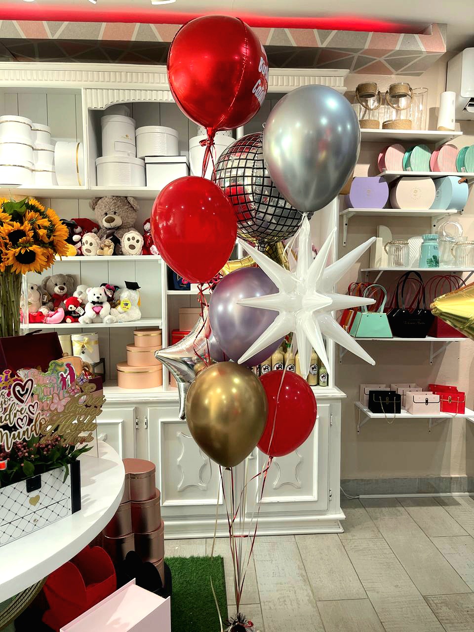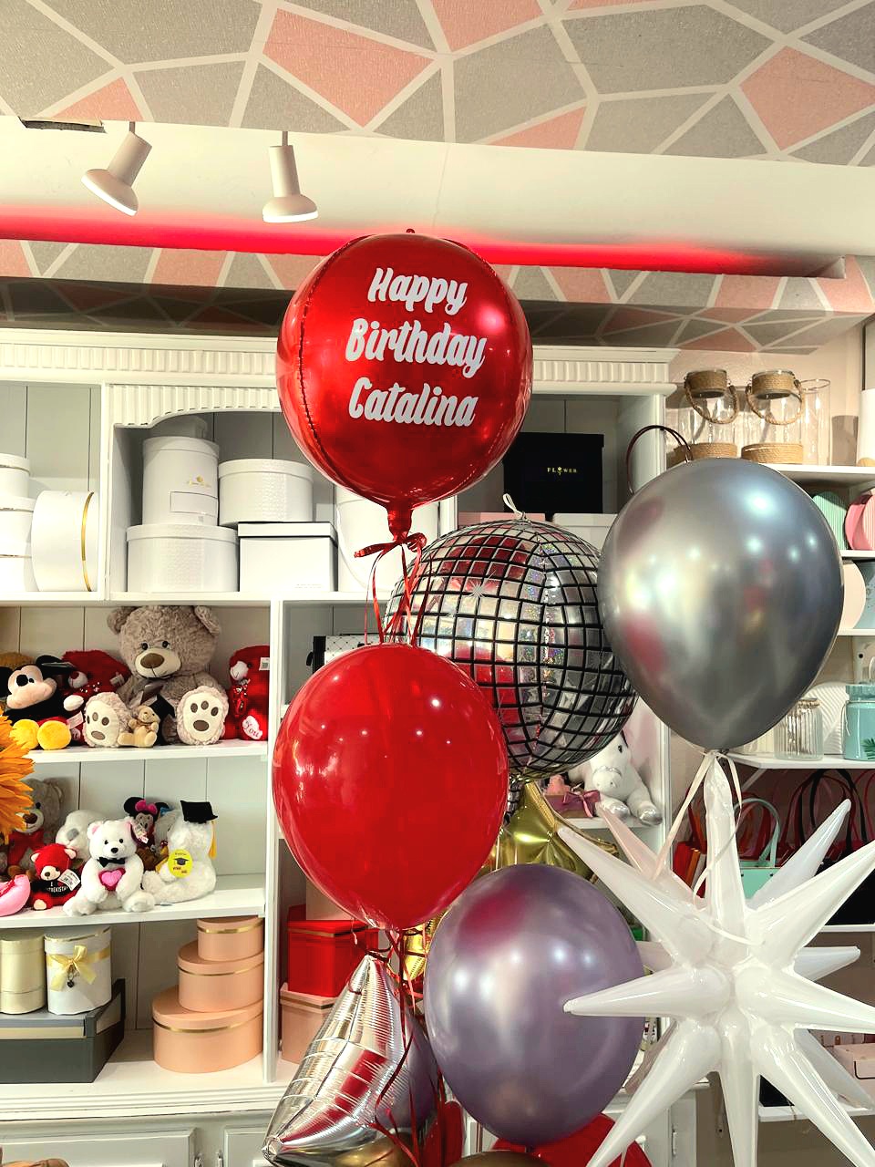 Un arreglo vibrante que combina globos metálicos en forma de estrella, disco y destello, globos de látex, personalización especial y todo inflado con helio. Incluye pesita decorativa para un acabado perfecto. ¡Ideal para sorprender y celebrar en grande!
