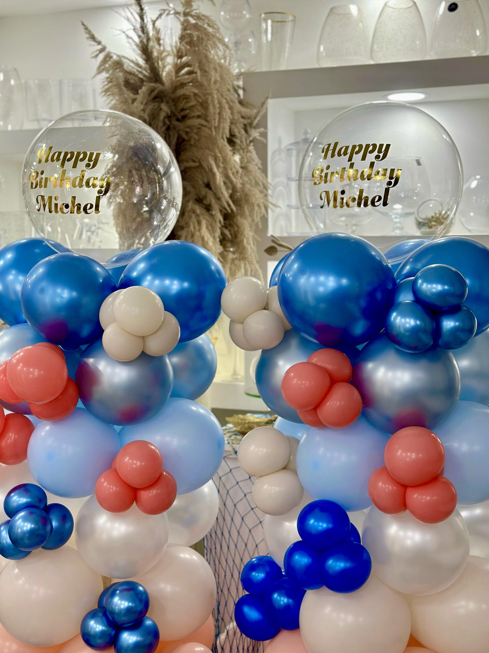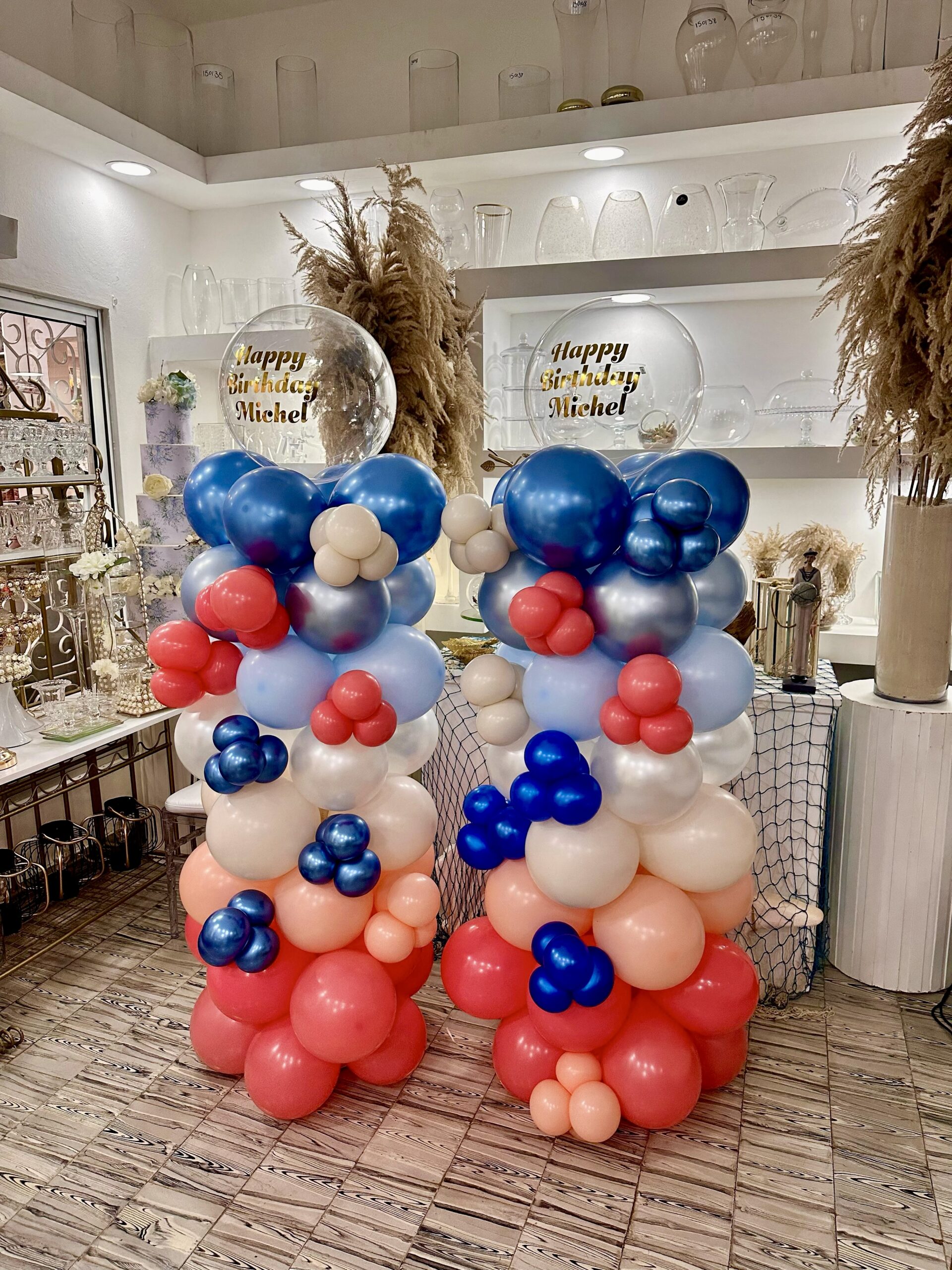 Cada columna incluye globos de látex en tonos a elegir y un globo clear personalizado como detalle central. ¡Perfecta para decorar con impacto y un toque único!