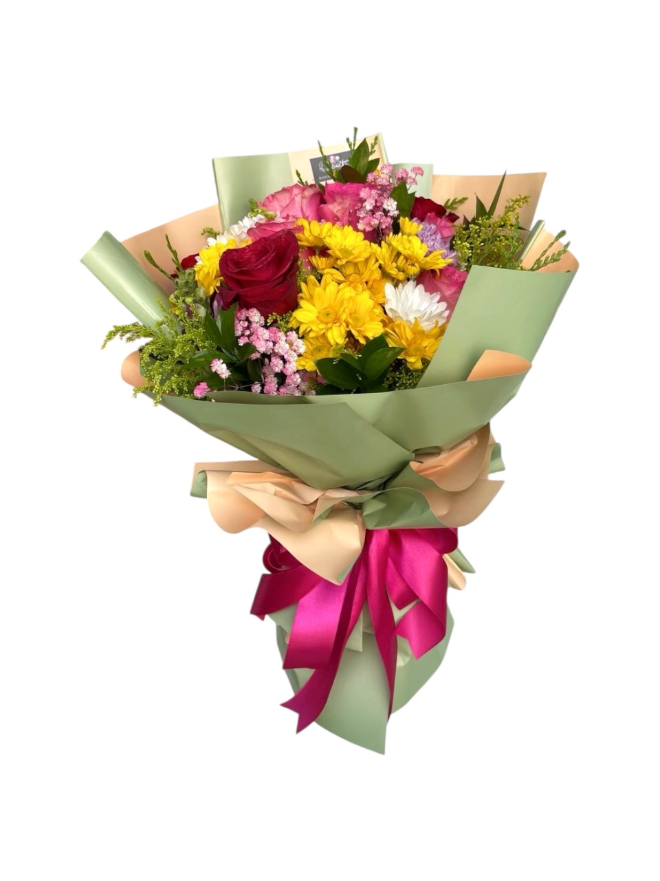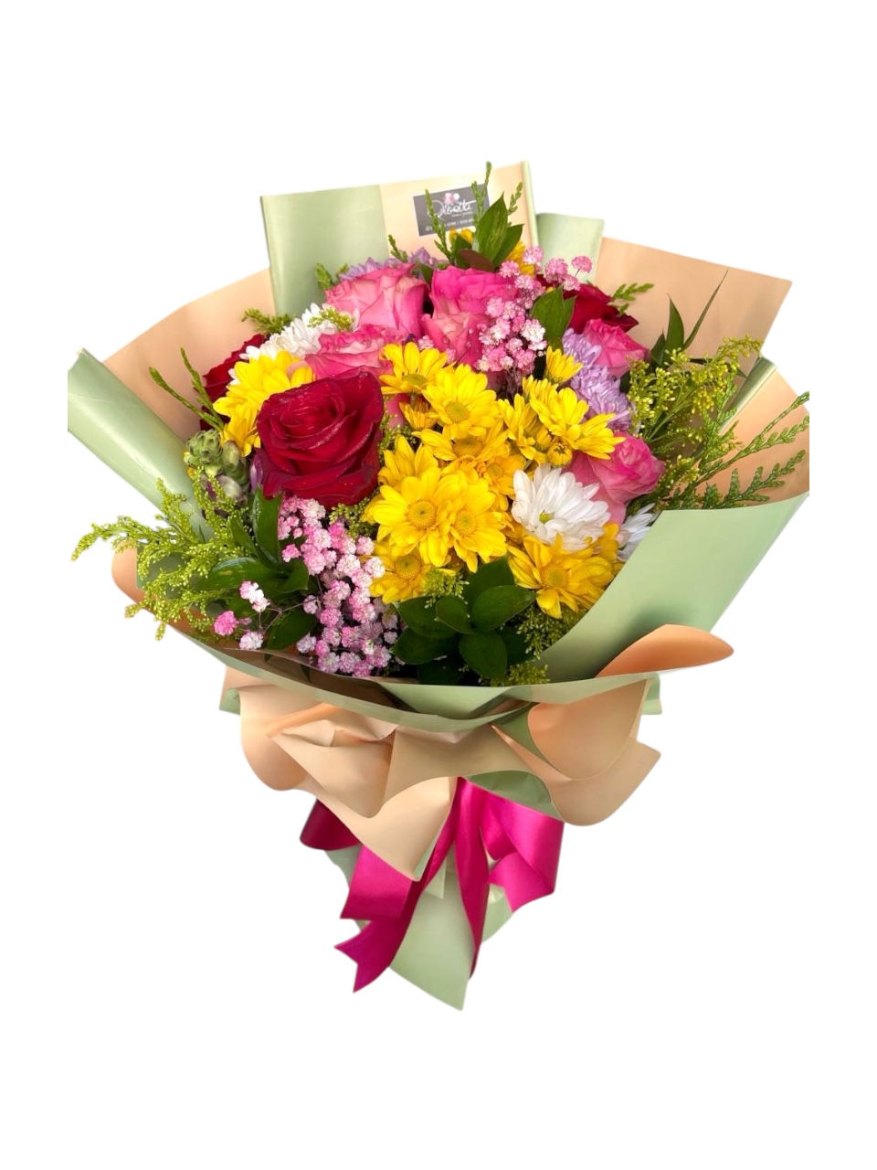 Bouquet lleno de color y vida, con flores frescas en tonos alegres. Perfecto para celebrar cumpleaños, agradecer con estilo o simplemente hacer feliz a alguien especial.