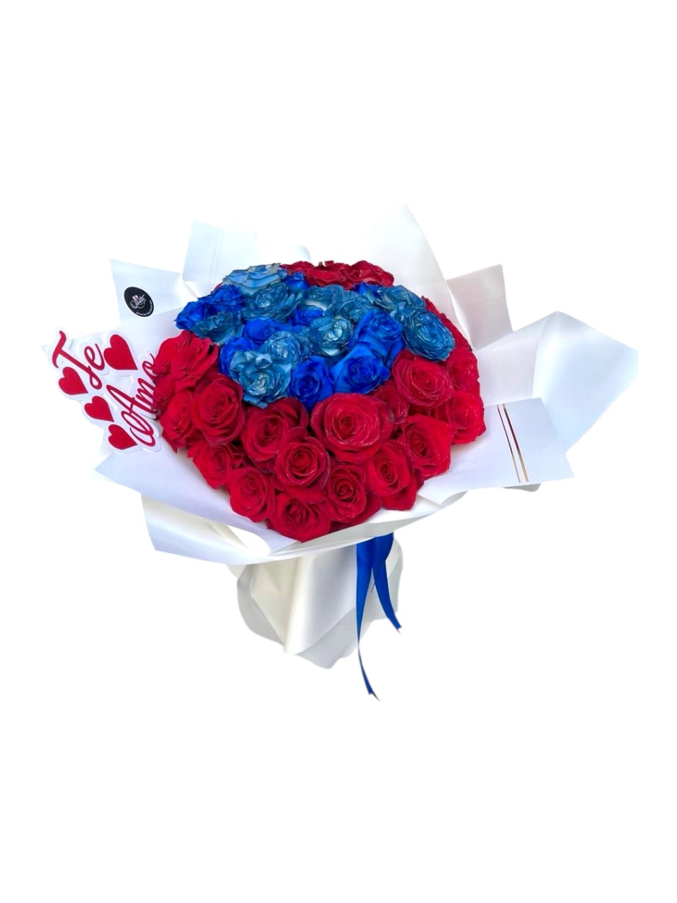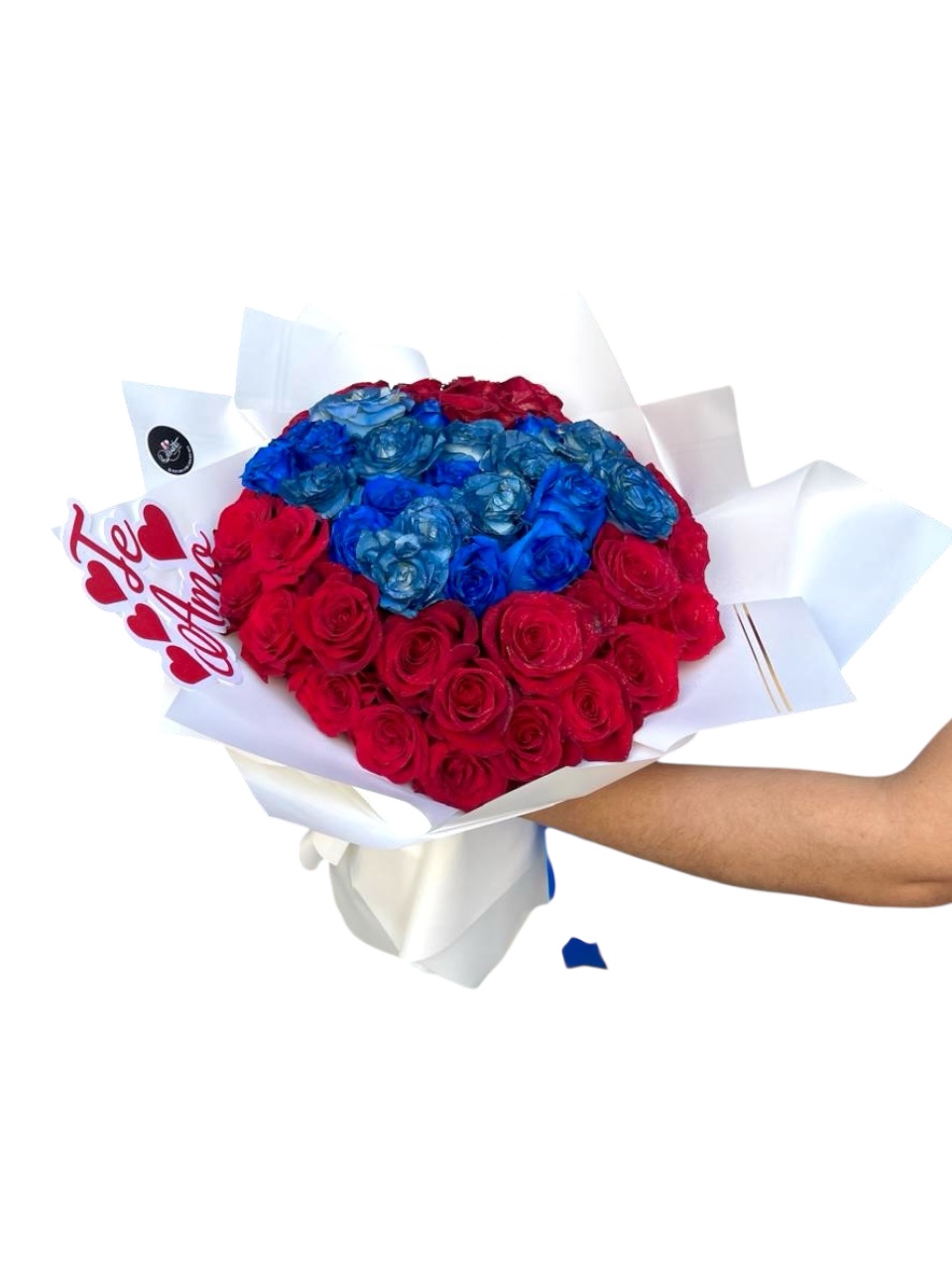 Bouquet de rosas en forma de corazón con una vibrante combinación de rojas y azules. Un gesto poderoso, original y romántico para decir «Te amo» de una forma inolvidable.