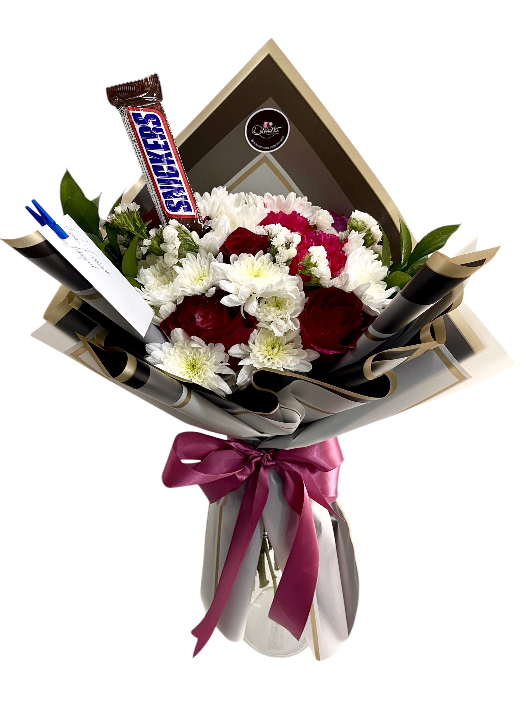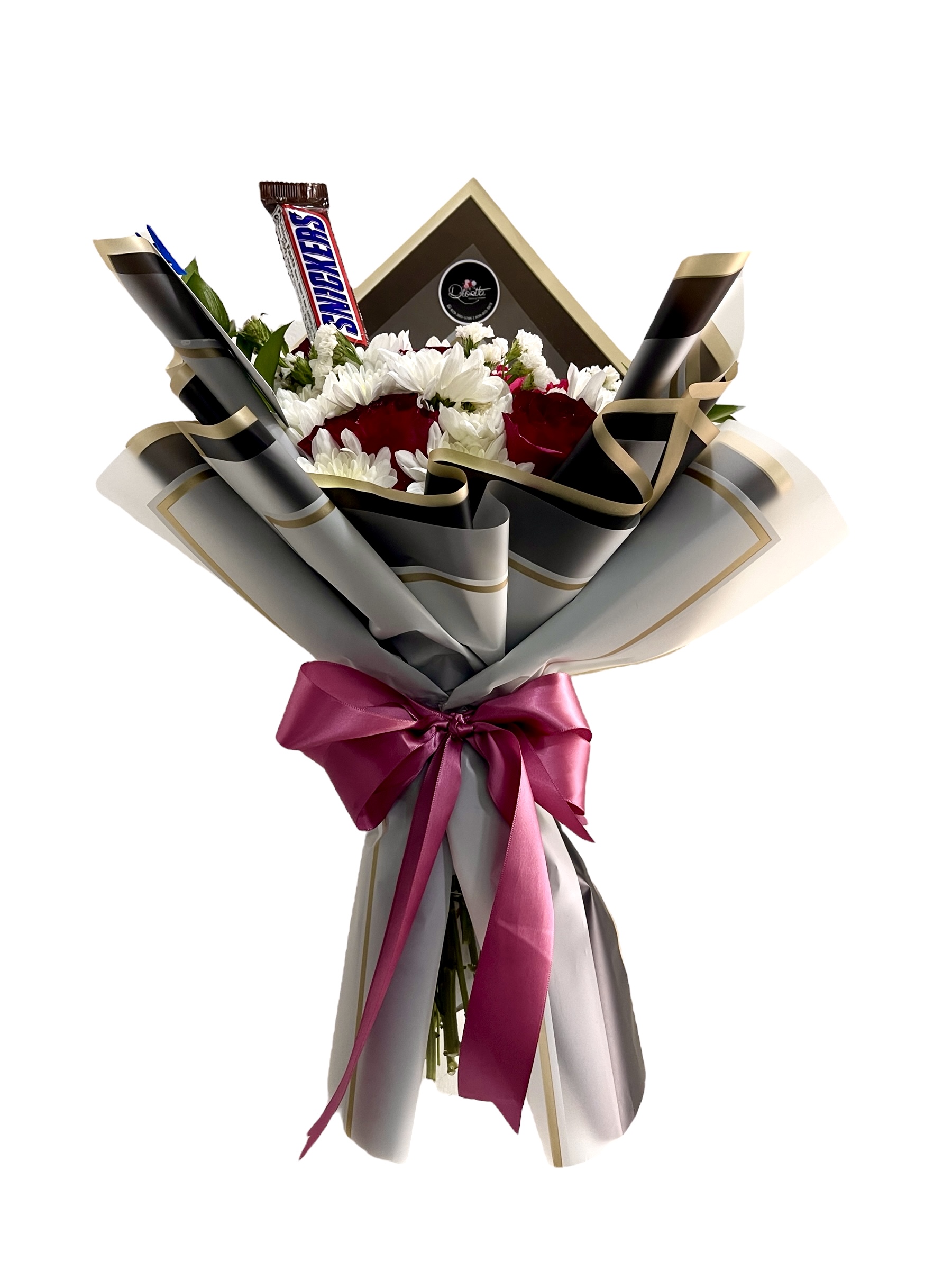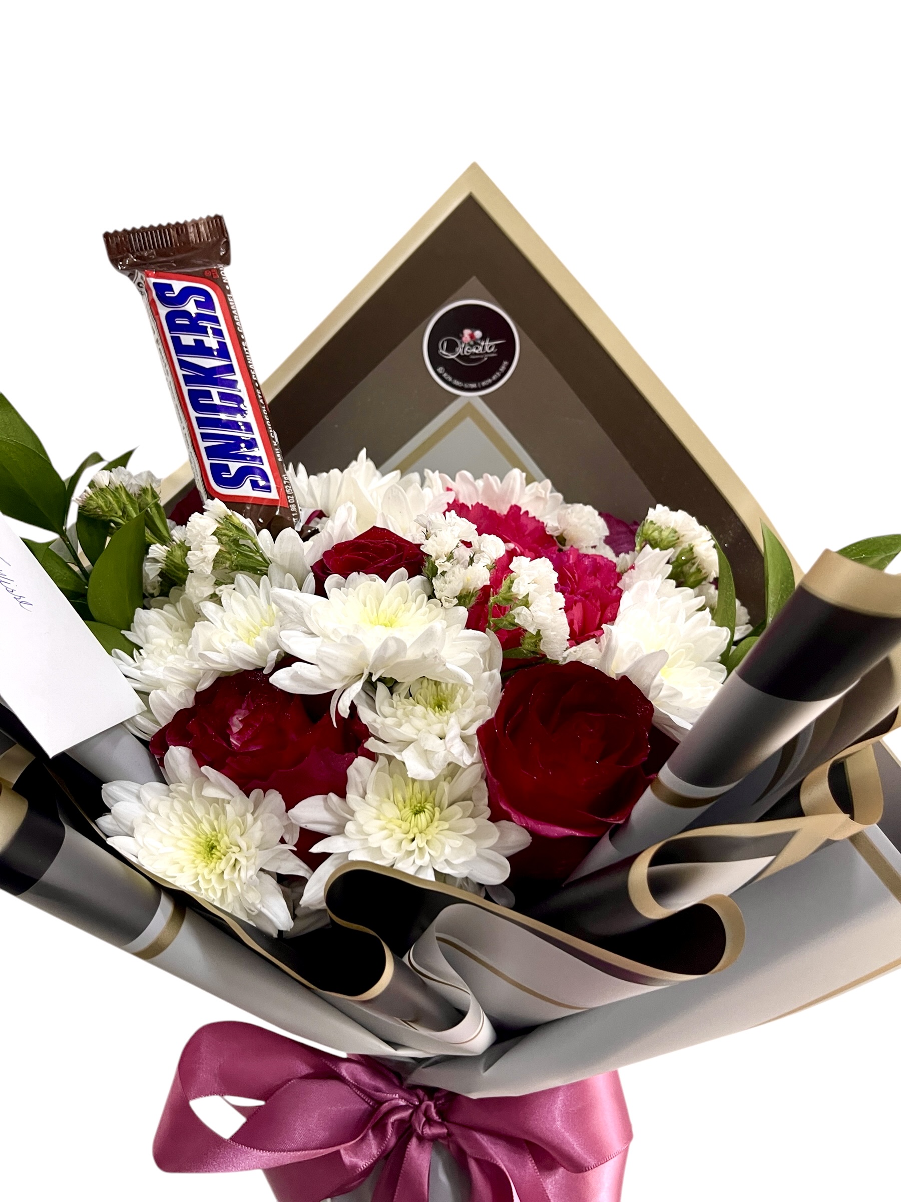 Este excepcional ramo combina la elegancia de la naturaleza con un toque dulce. Este bellamente diseñado arreglo se compone de rosas de vibrantes colores que simbolizan amor y gratitud; a su alrededor, los suaves pompones añaden un toque de frescura y alegría, creando un contraste encantador. Una dulzura de chocolate.