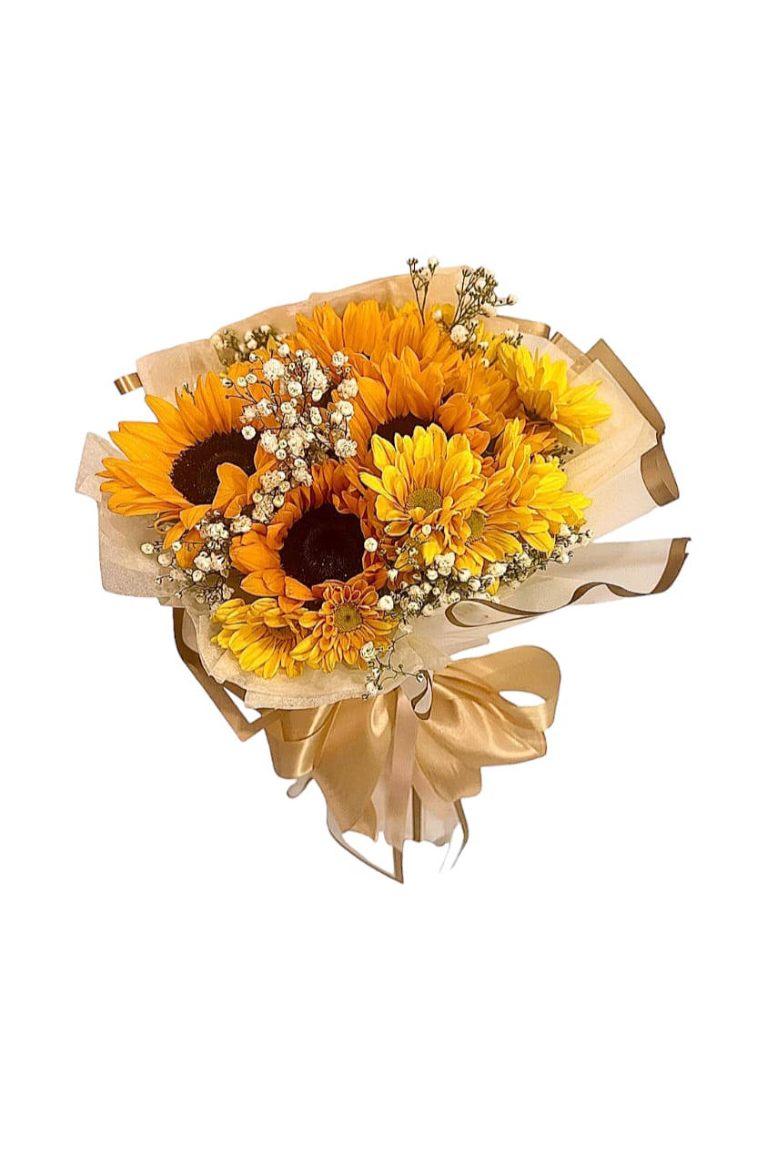 Ramo de 05 girasoles con margaritas y detalles de baby breath; envoltura en papel con borde dorado y doble lazo elegante.