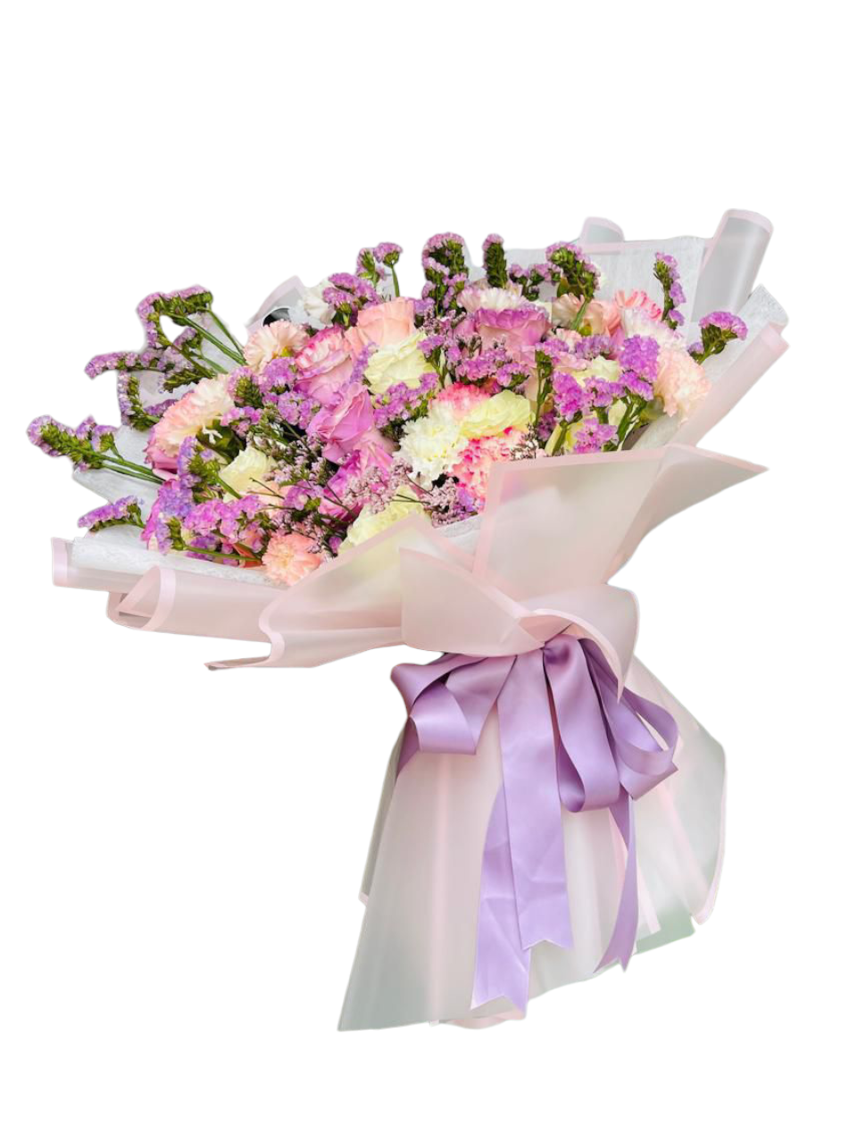 En este precioso bouquet se refleja la elegancia y delicadeza de las rosas blancas y lilas, junto con las suaves porciones de limonium y baby breath, en una envoltura pastel con lazo lila, evocando un sentimiento de ternura!!