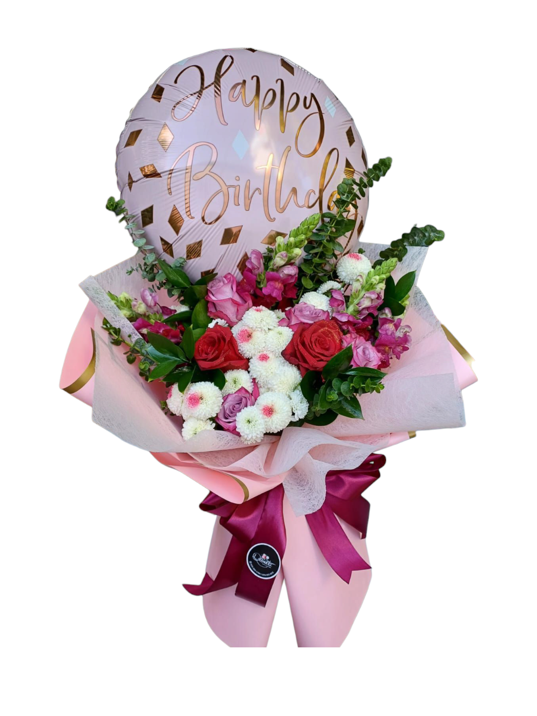 Ramo de 06 rosas importadas combinadas con claveles y baby breath en envoltura papel color pastel; y globo Happy Birthday.