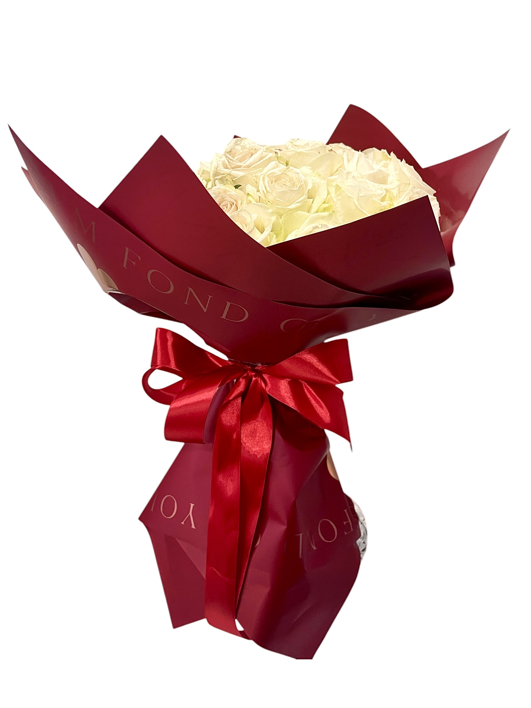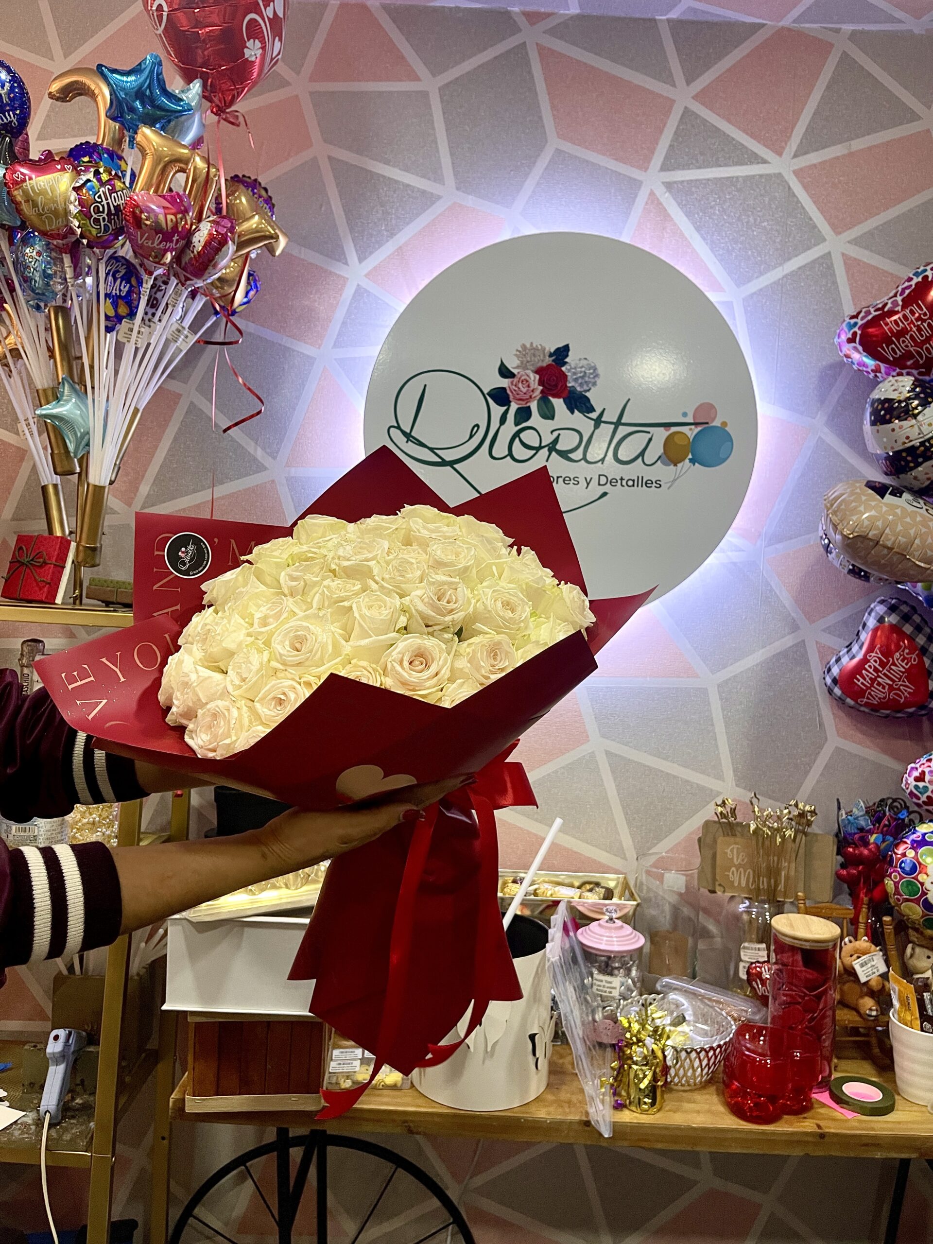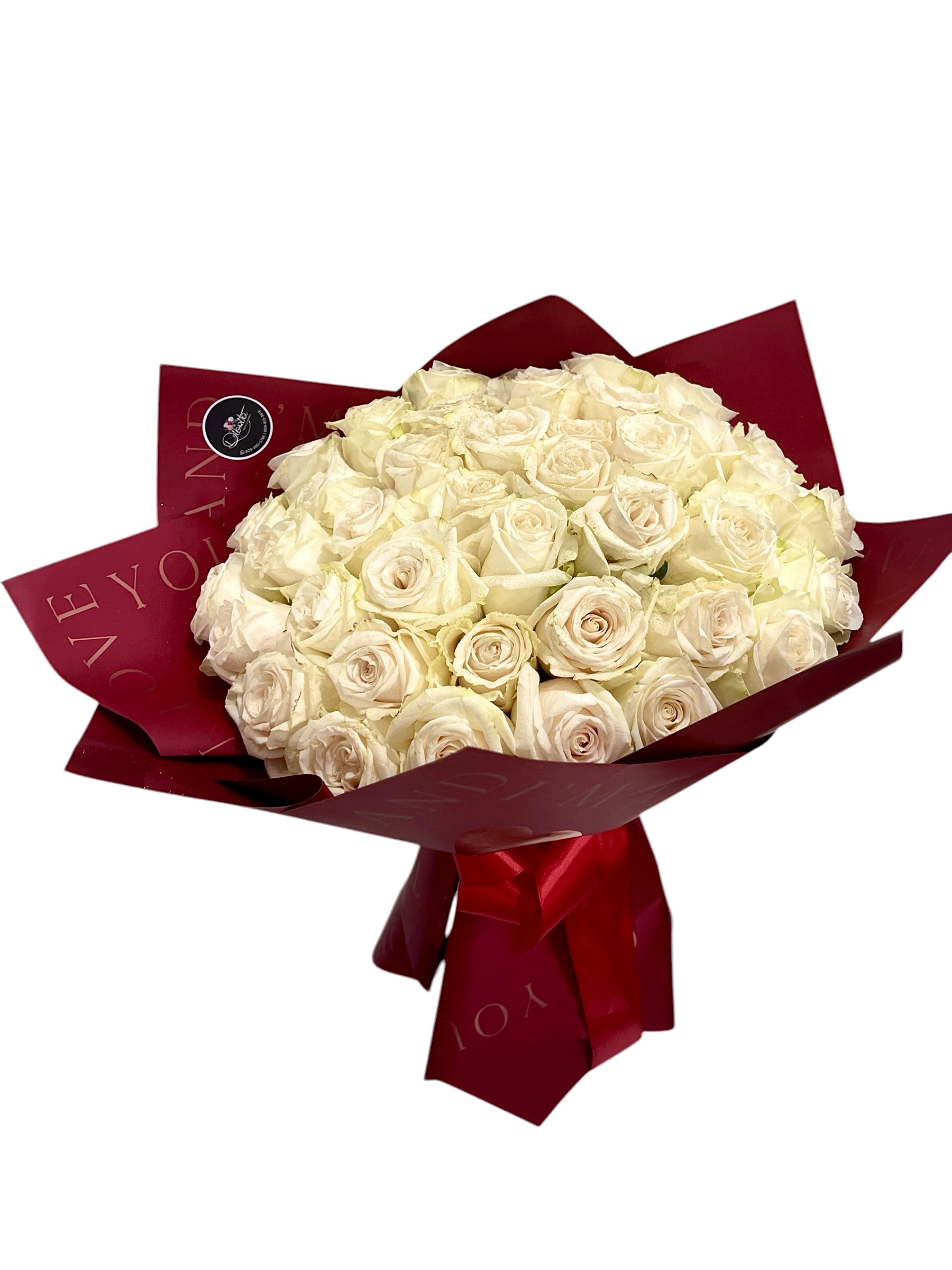 Hermoso ramo de rosas blancas, delicadamente envueltas en papel rojo brillante. Este bouquet no solo simboliza la pureza y la belleza de las rosas blancas, sino que el vibrante envoltorio rojo añade un toque de pasión y calidez.